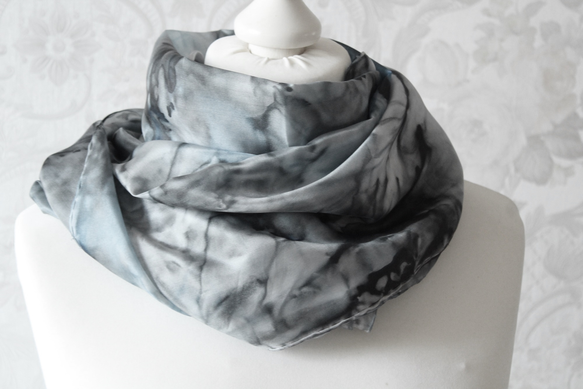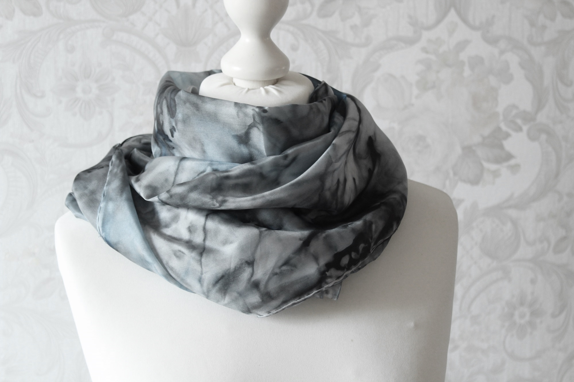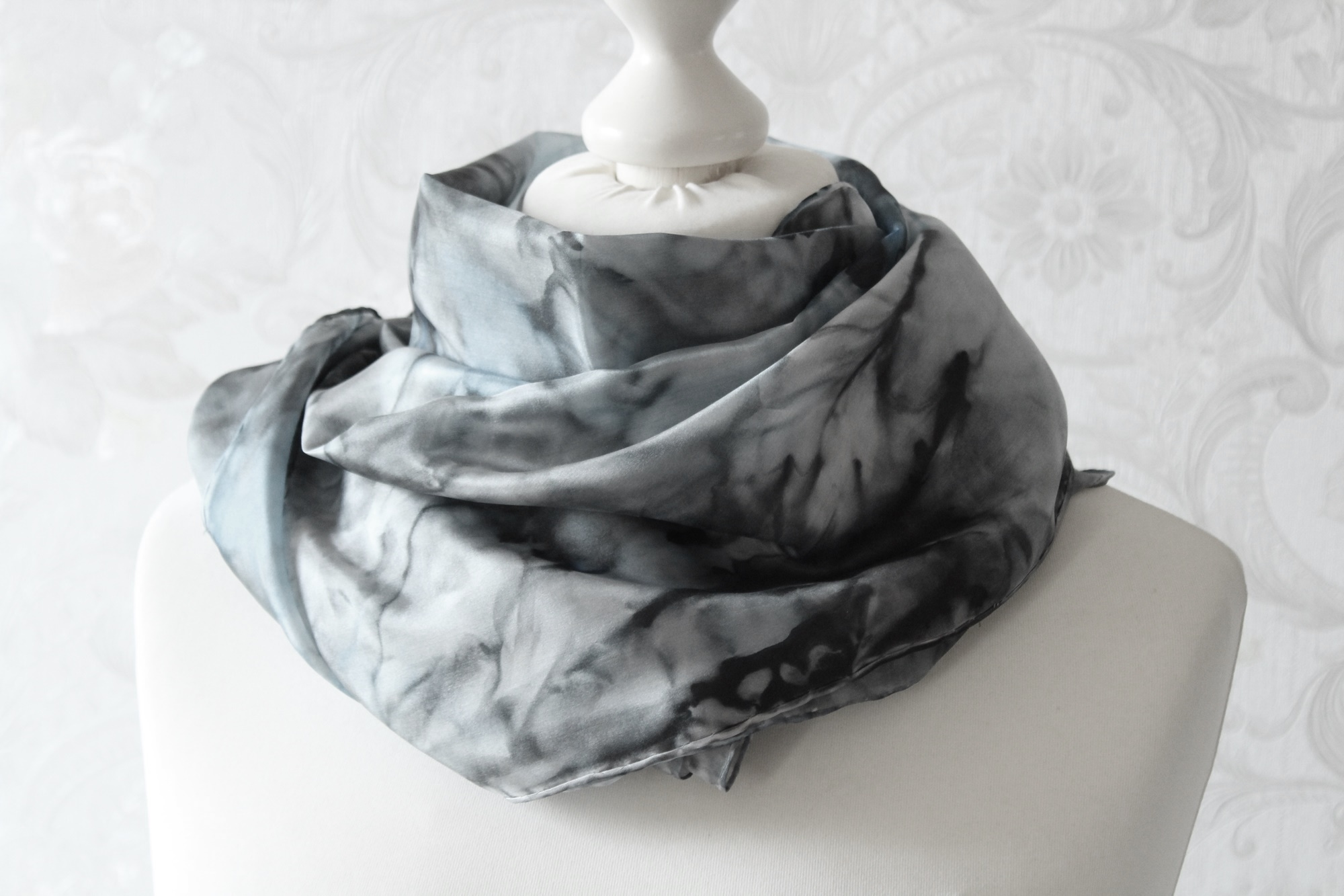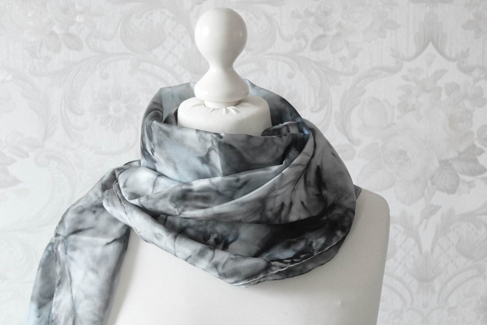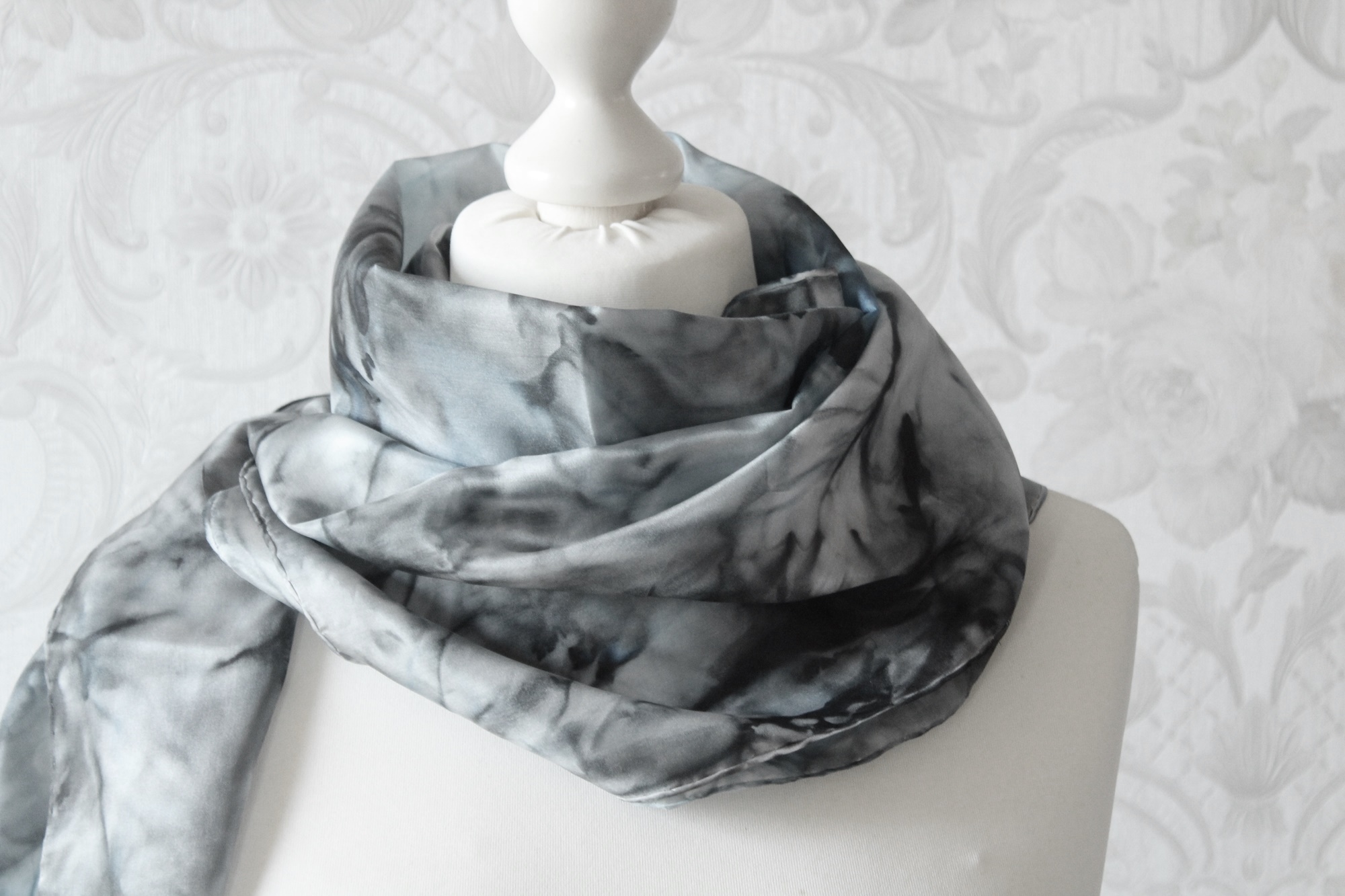 Seidentuch aus der Reihe Farbgeflüster in grauen Farbverläufen. Miteinander geflüstert haben bei diesem Tuch graue und graublaue Farbtöne. Das Seidentuch ist so ein Hingucker, die Farben sind nicht zu aufdringlich. Somit passt es zu allen möglichen Outfits. Das Tuch Farbgeflüster ist also ein von Hand bemaltes Seidentuch. Das Muster ist selbst entworfen bzw. entsteht beim Malen eher zufällig. Somit gibt es dieses Tuch genauso nicht noch einmal. Jedes für sich ist ein Unikat.