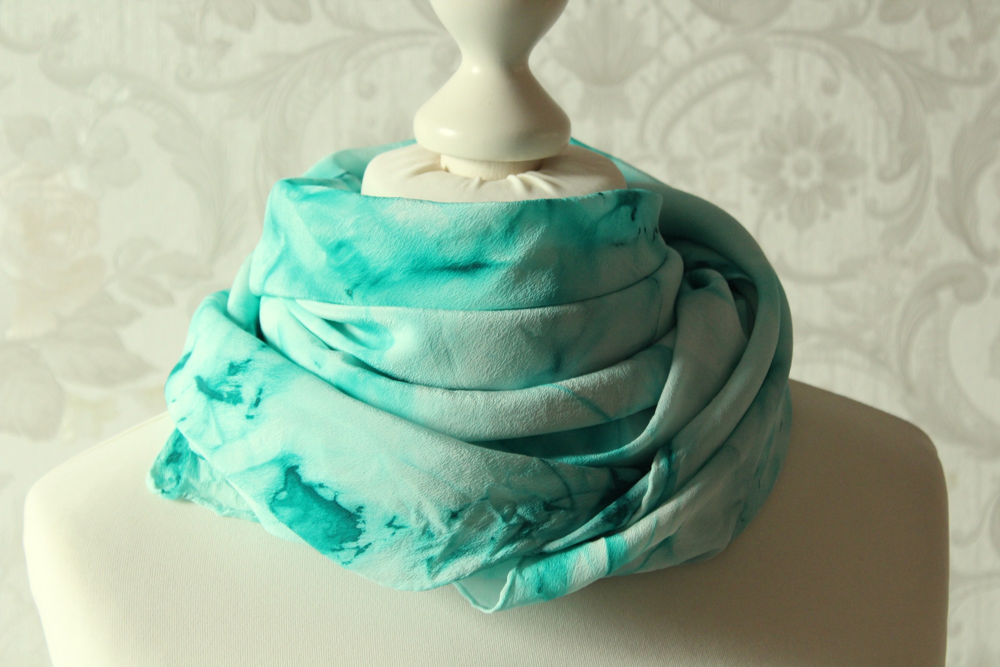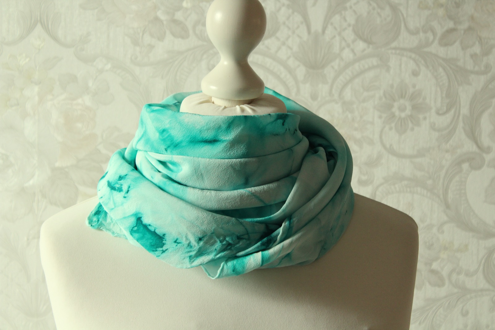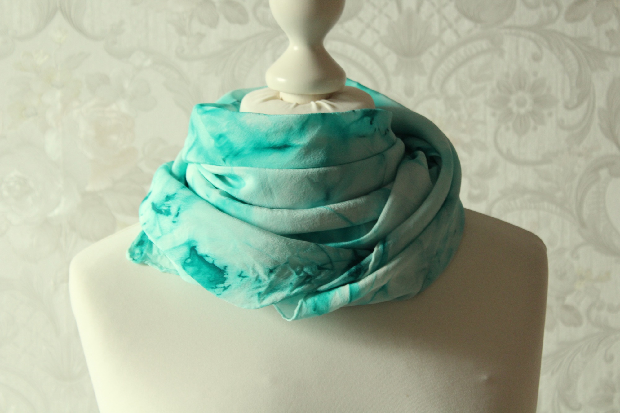 Das Tuch ist waschbar, Handwäsche wird empfohlen. Feucht bügeln. Wenn man es nicht bügelt hat man eine leichte Crash Optik. Ich habe den auch schon einmal vorgewaschen, damit keine überschüssigen Farbreste der Seide anhaften.