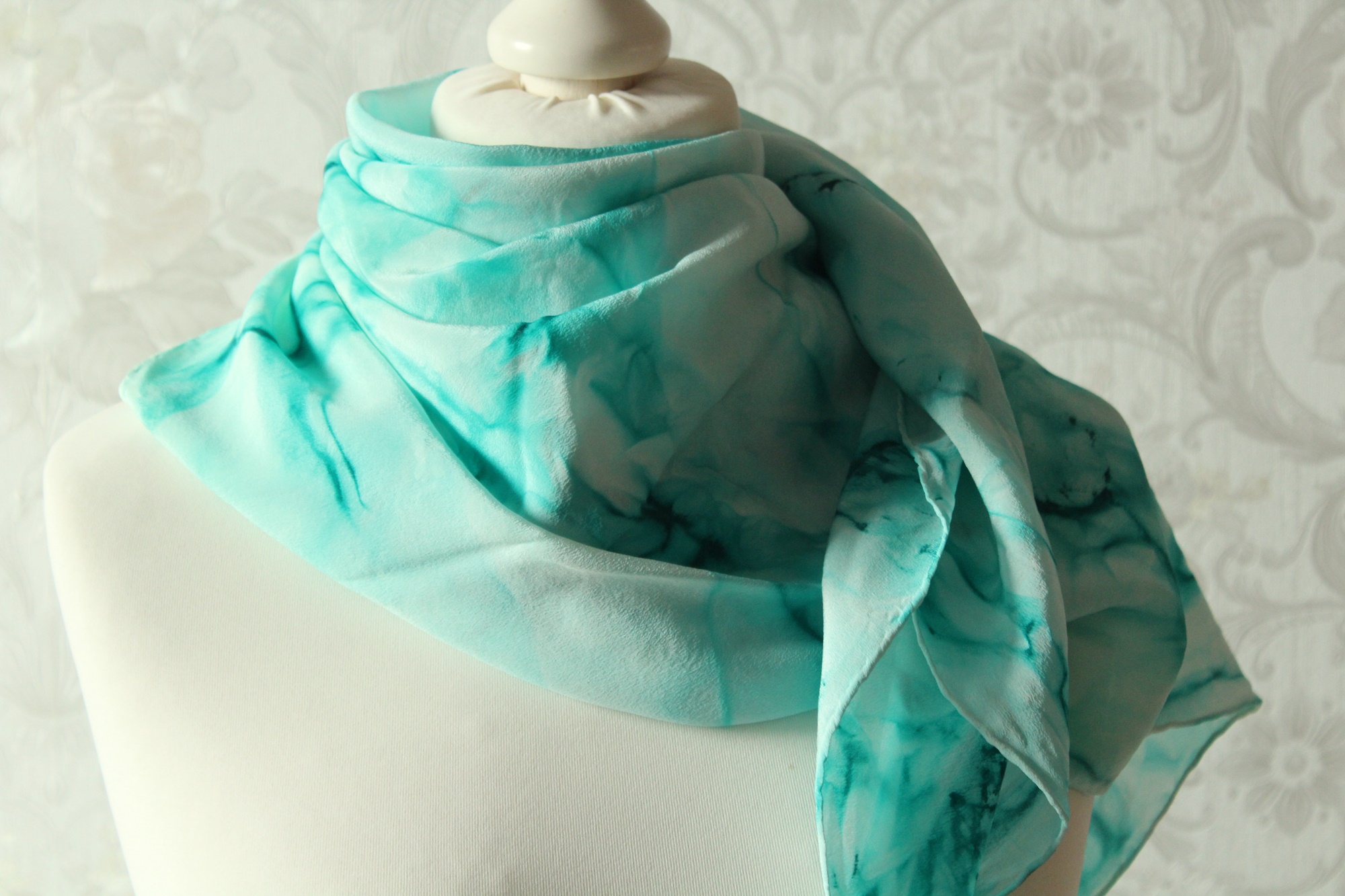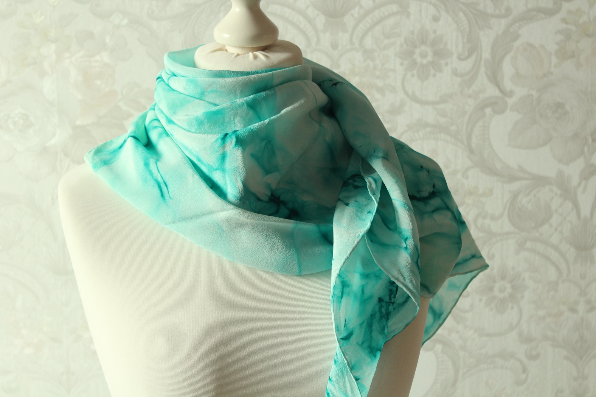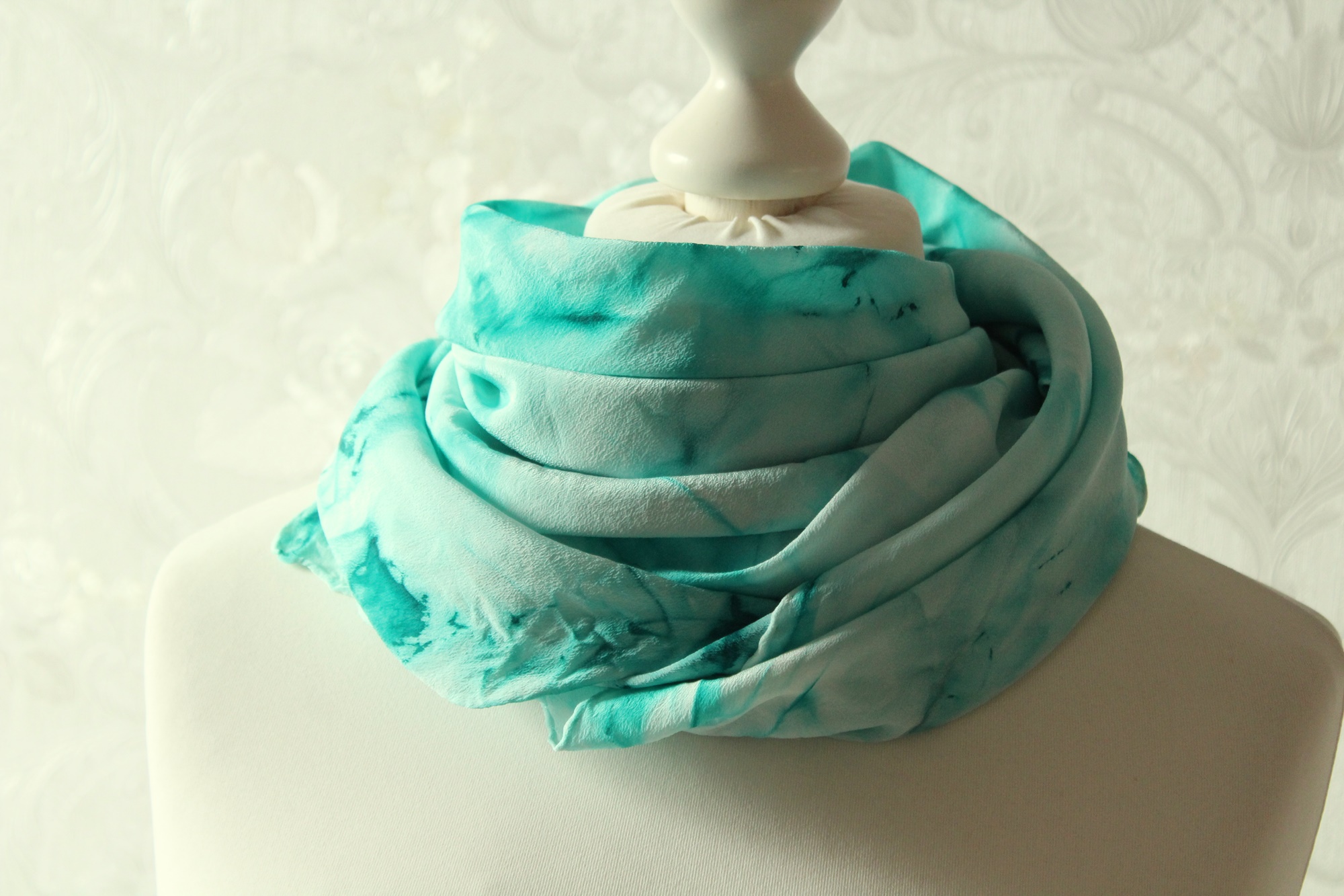 Das Tuch ist waschbar, Handwäsche wird empfohlen. Feucht bügeln. Wenn man es nicht bügelt hat man eine leichte Crash Optik. Ich habe den auch schon einmal vorgewaschen, damit keine überschüssigen Farbreste der Seide anhaften.