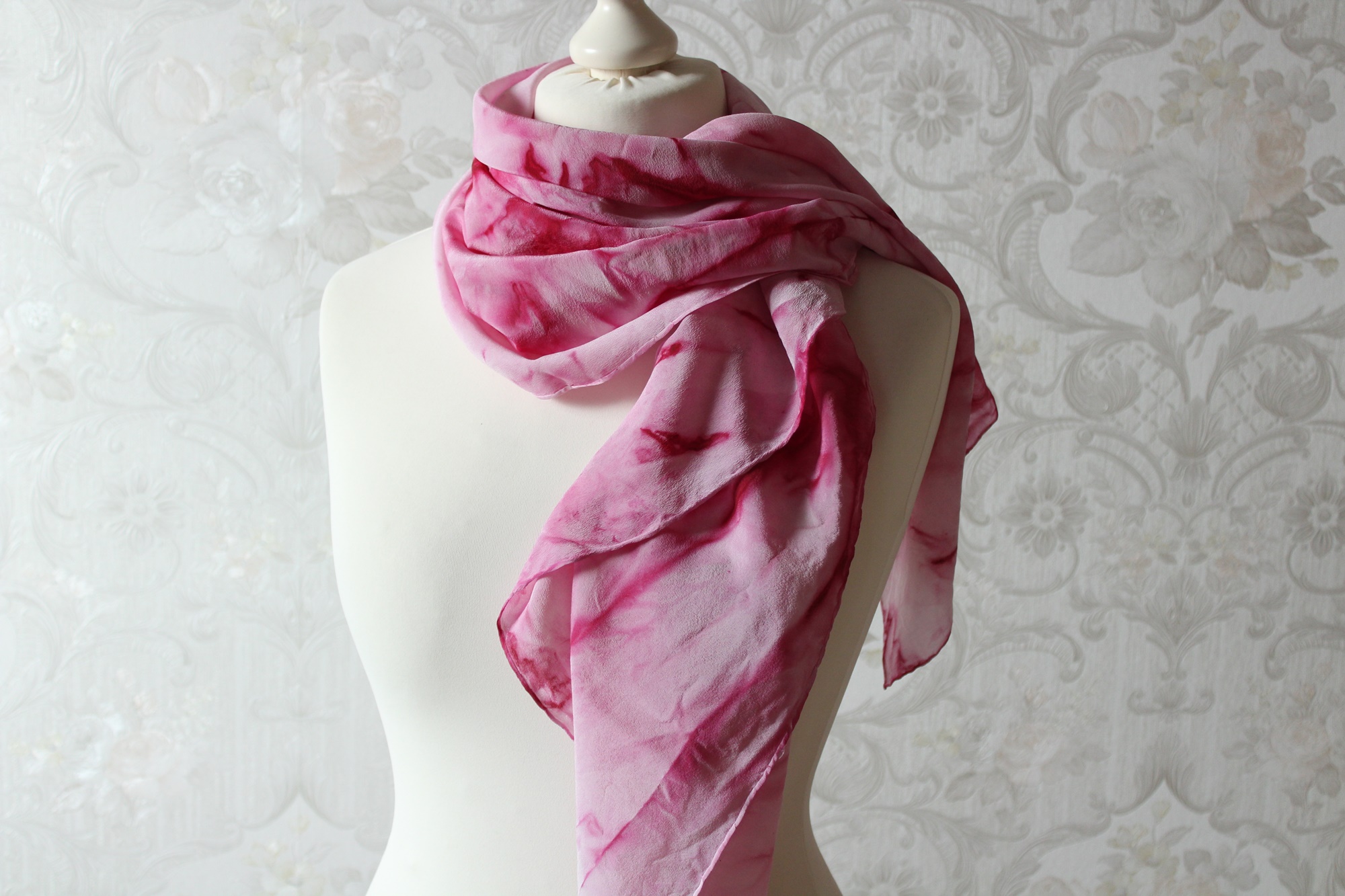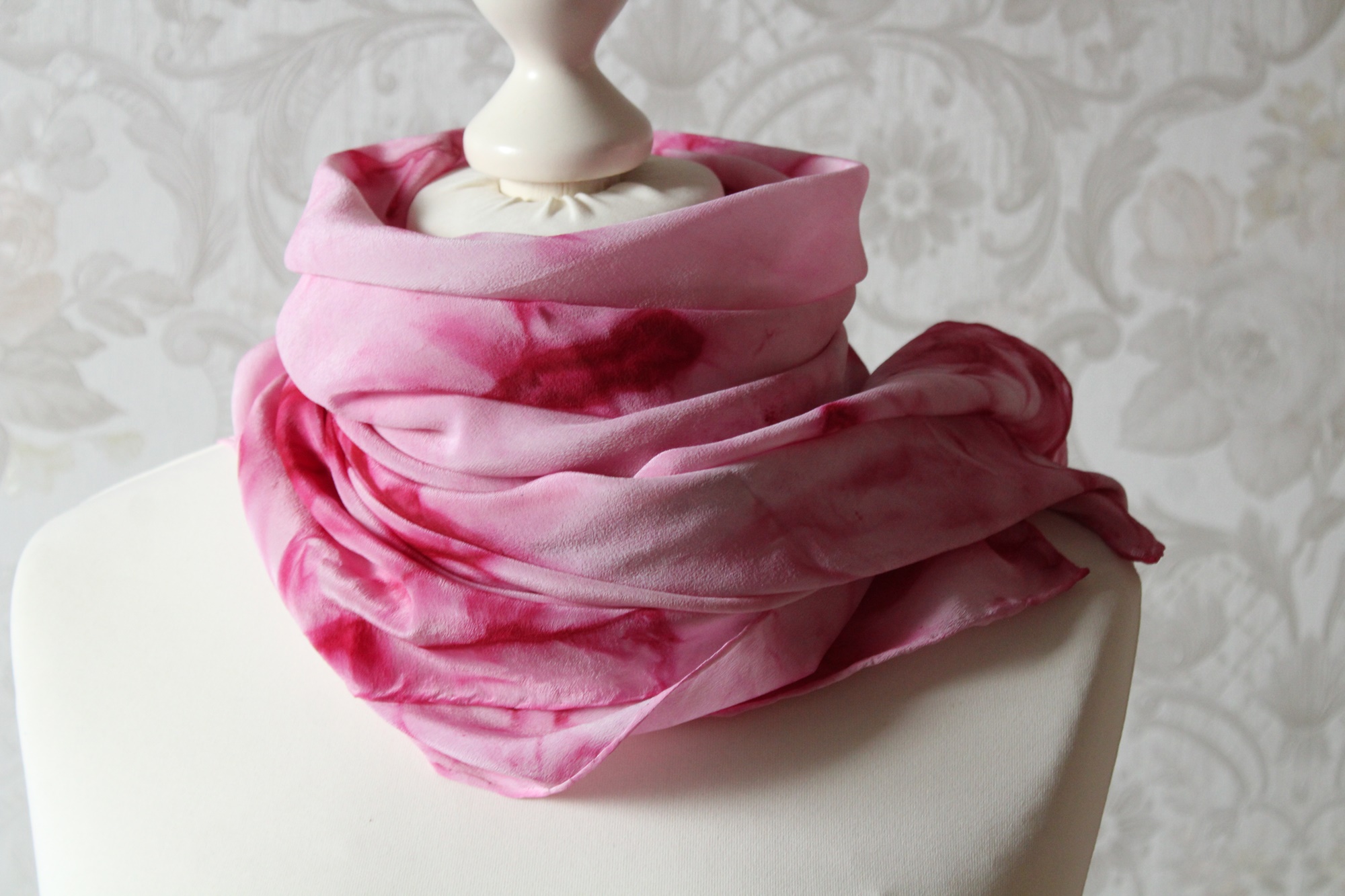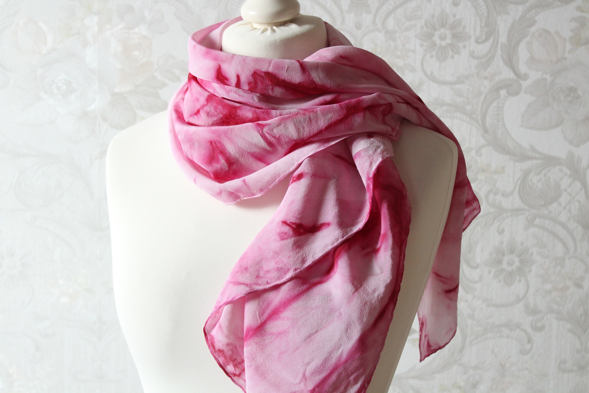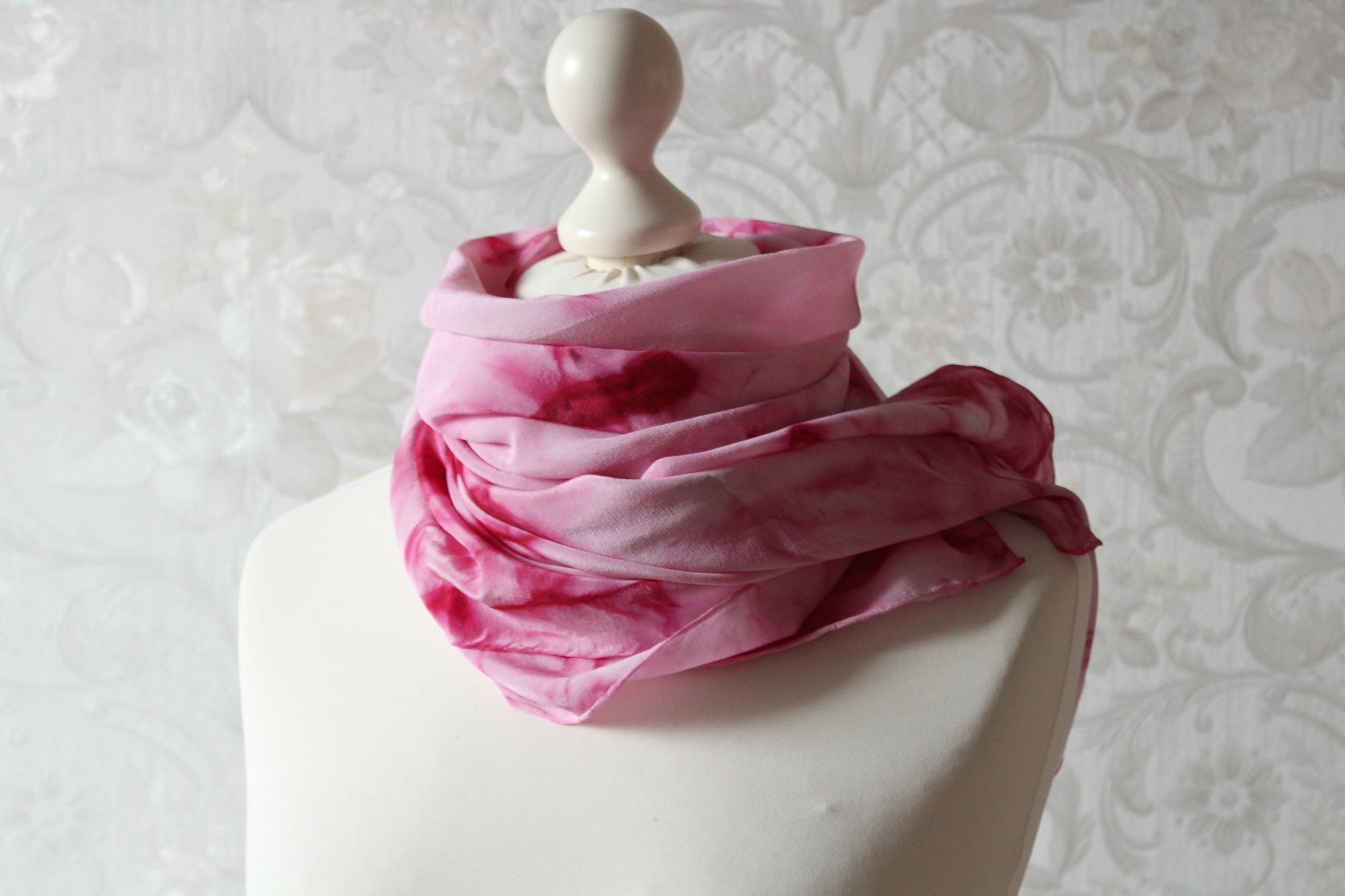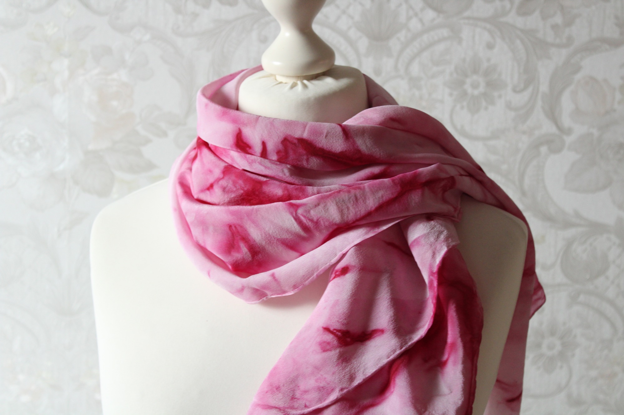Das Seidentuch ist waschbar, ich würde Handwäsche empfehlen. Feucht bügeln. Ich habe das Tuch auch schon einmal vorgewaschen, damit keine überschüssigen Farbreste der Seide anhaften.