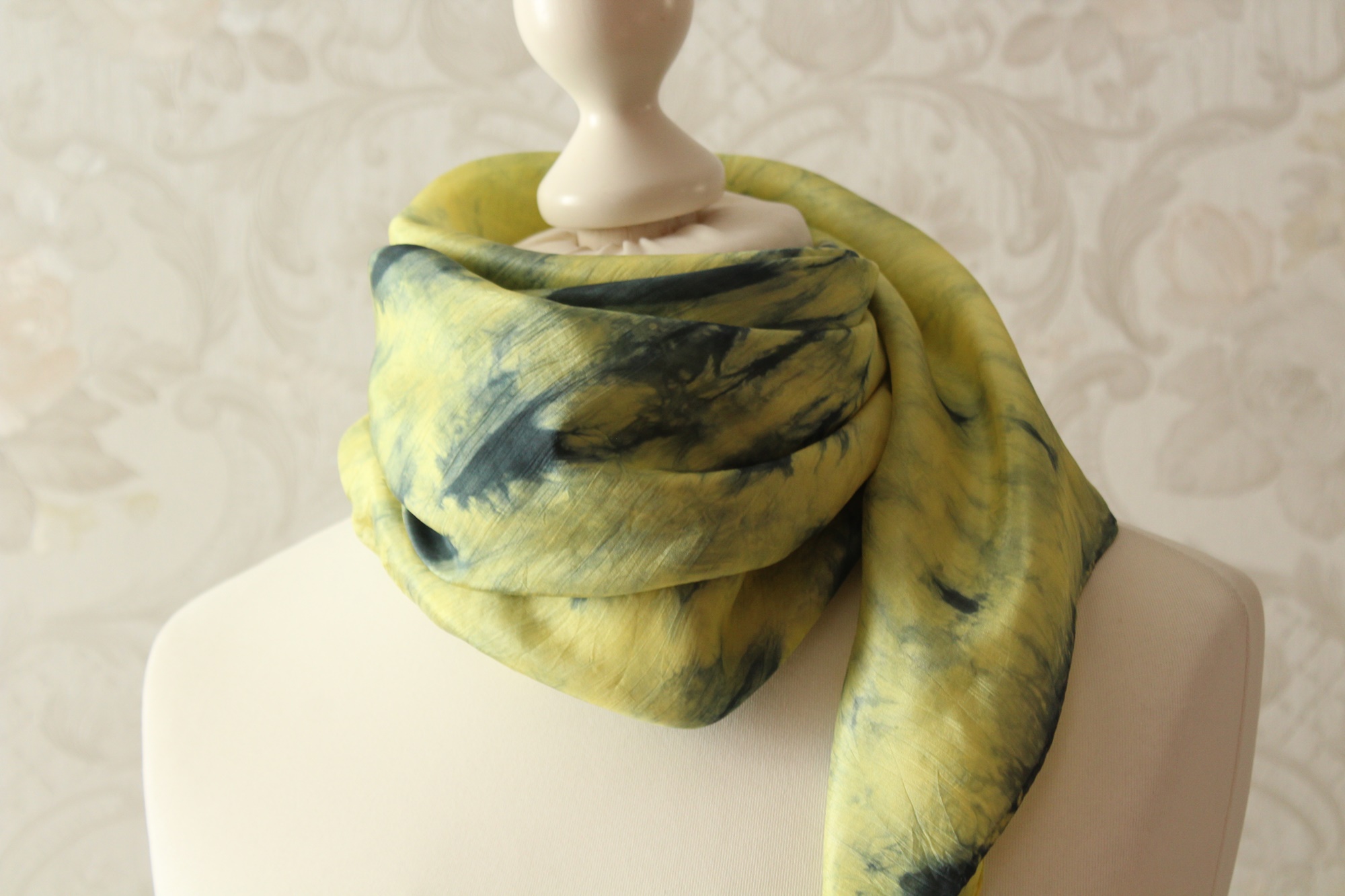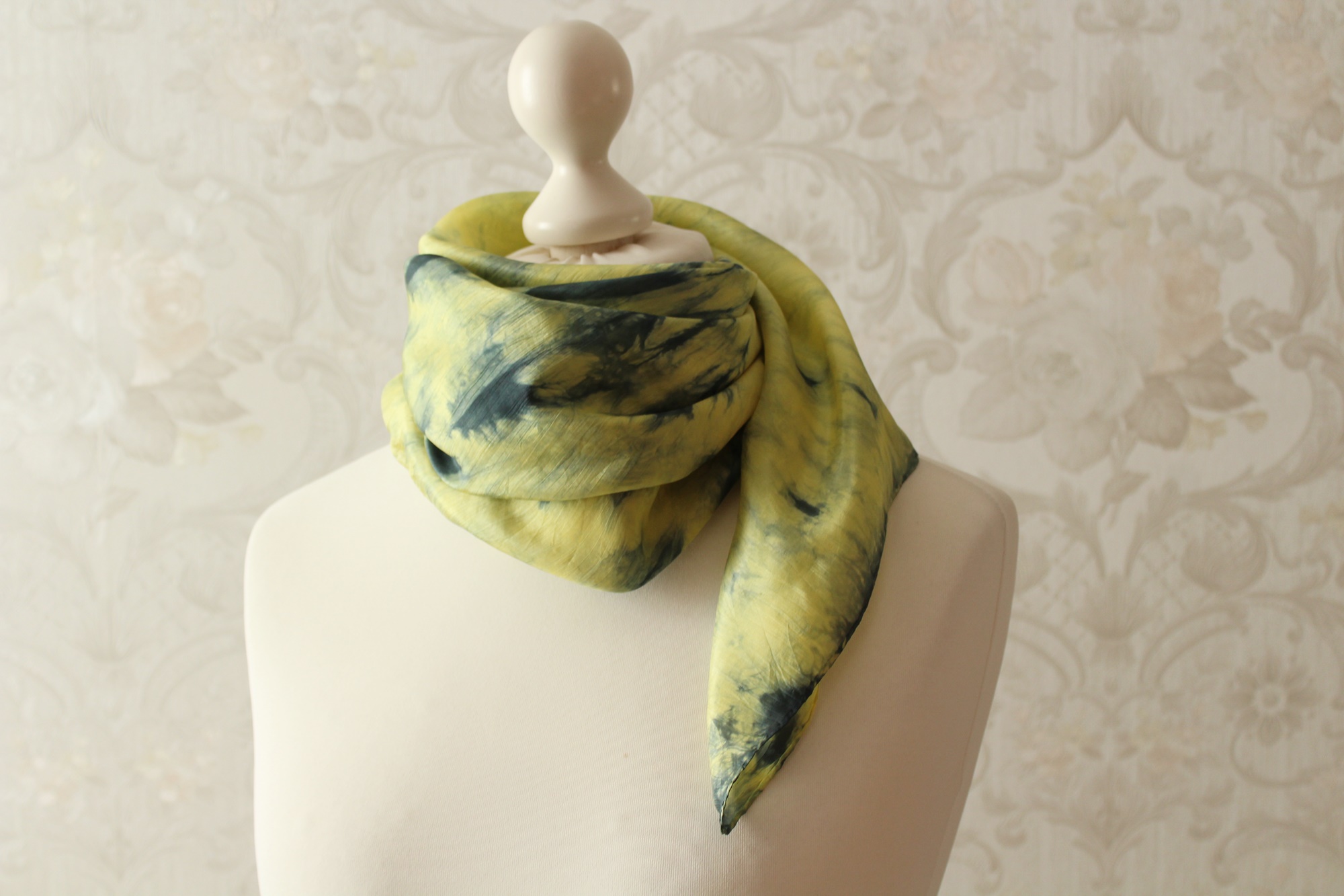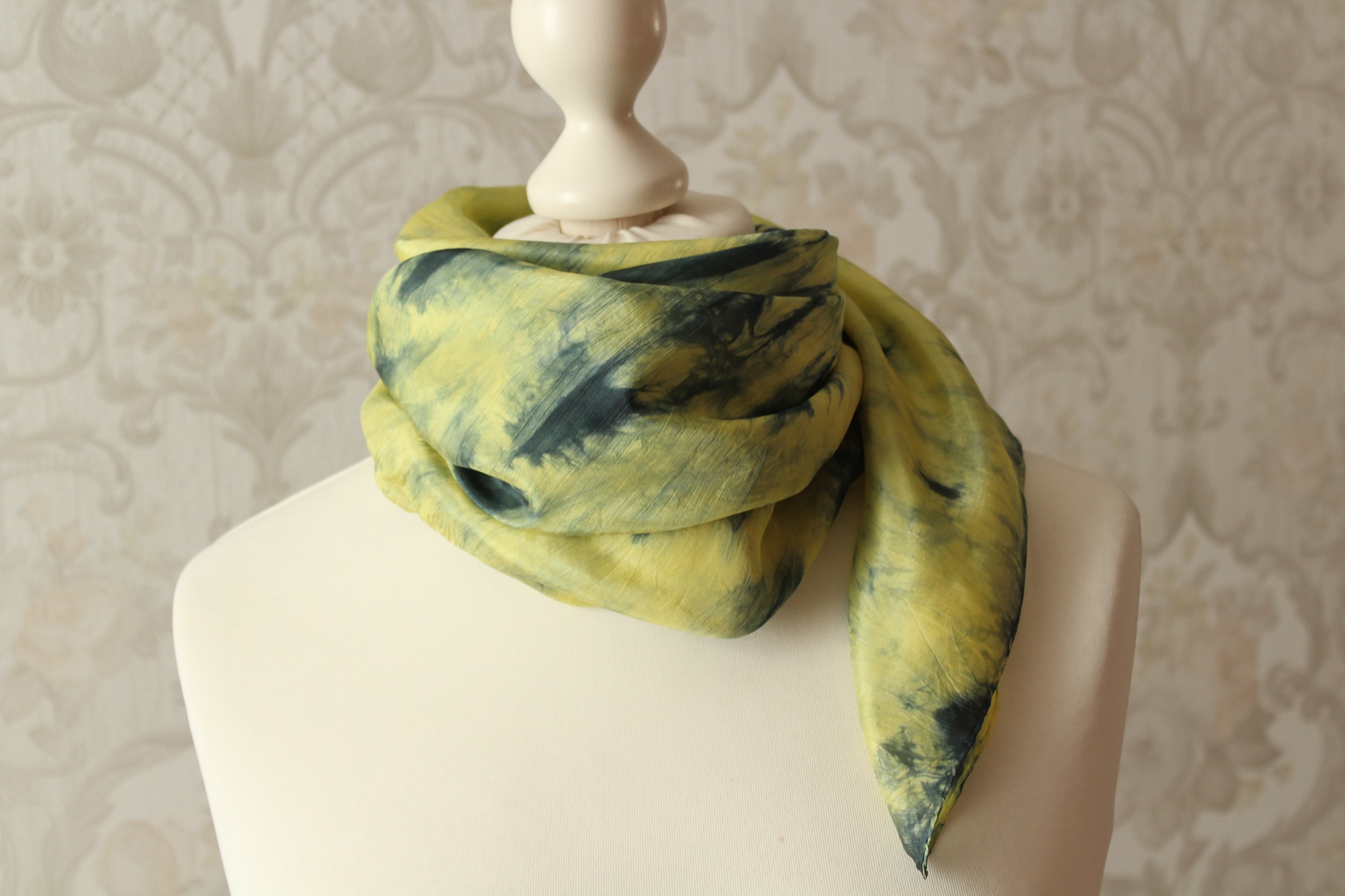 Bei diesem Seidentuch (85 x 85 cm) flüstern verschiedene Farbtöne von Grün und Gelb miteinander. Je nachdem, wie man es trägt schimmert es etwas anders. Durch die drei Arbeitsschritte Bemalen der Seide, Abbinden und Färben entstehen diese Muster eher zufällig. Somit gibt es dieses Tuch genauso nicht noch einmal.