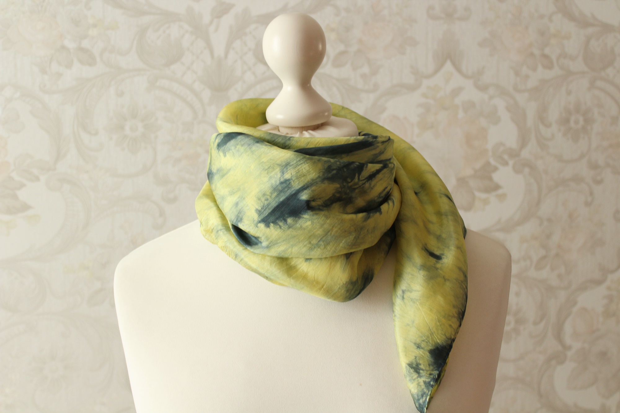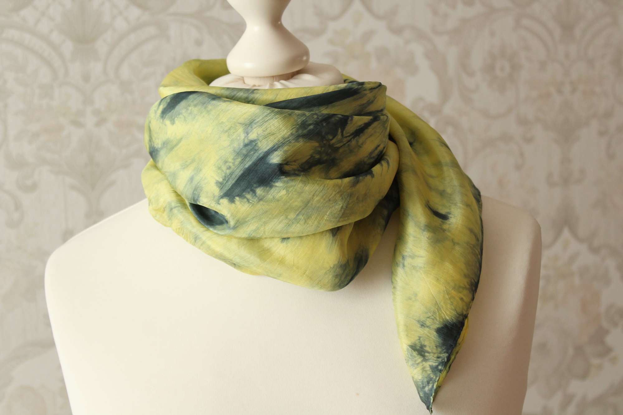 Seidentuch Fantasie in Grün und Gelb, ein handbemaltes Tuch, ein Einzelstück.