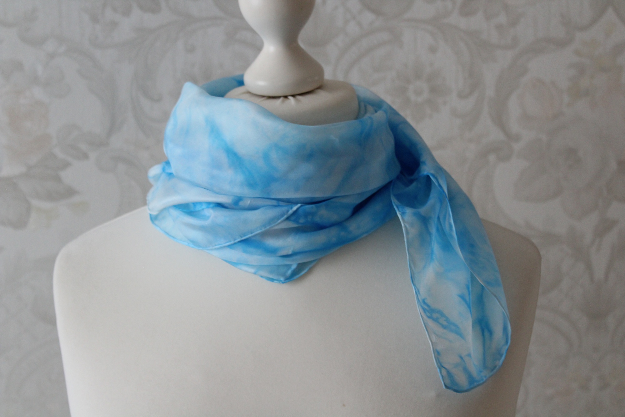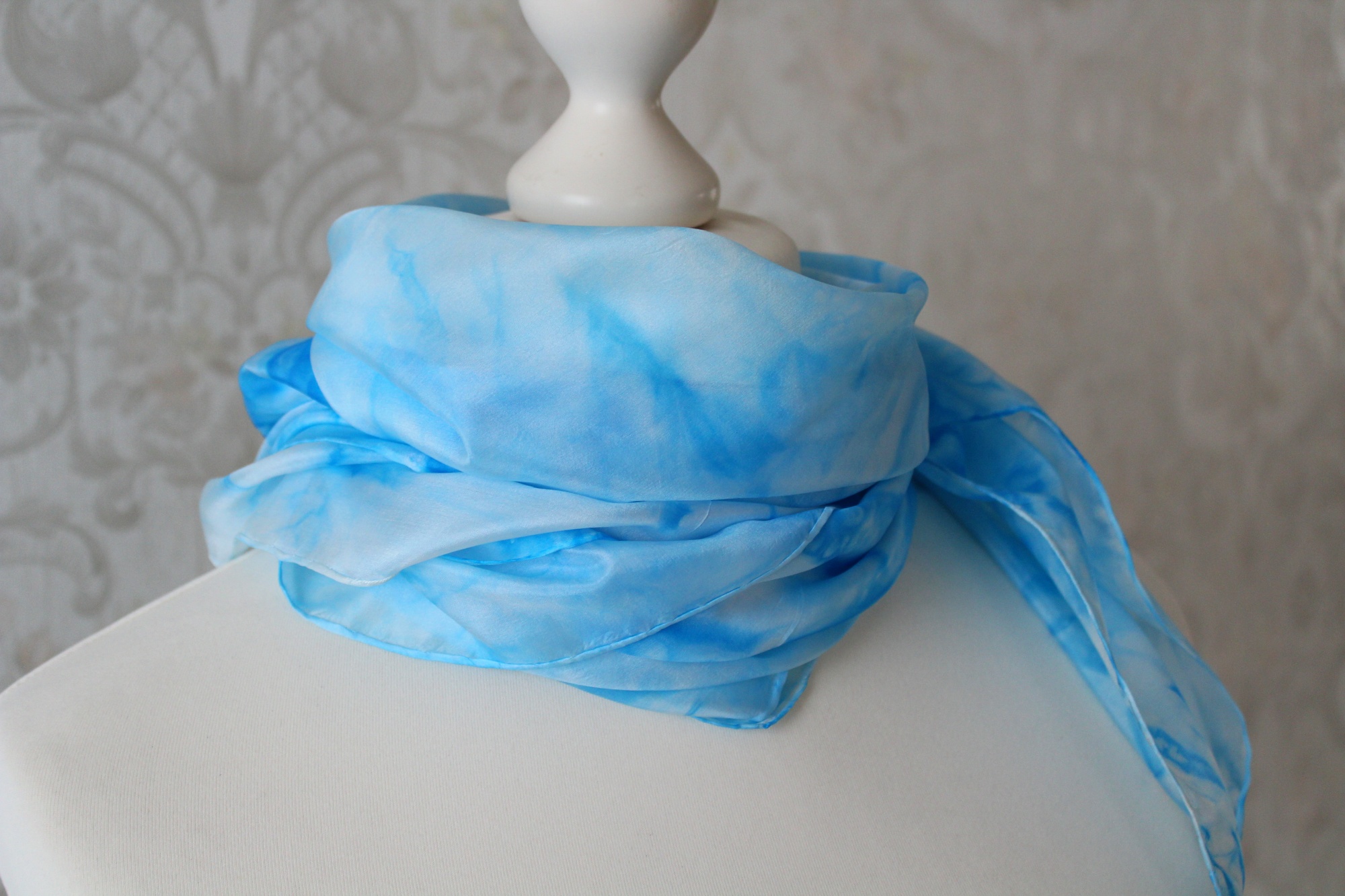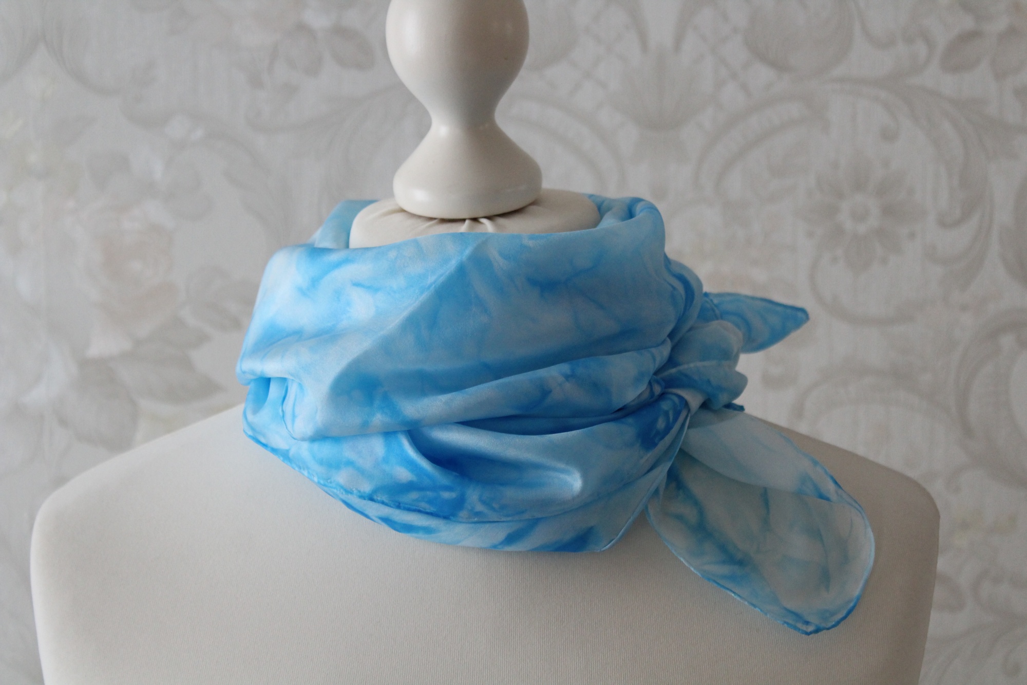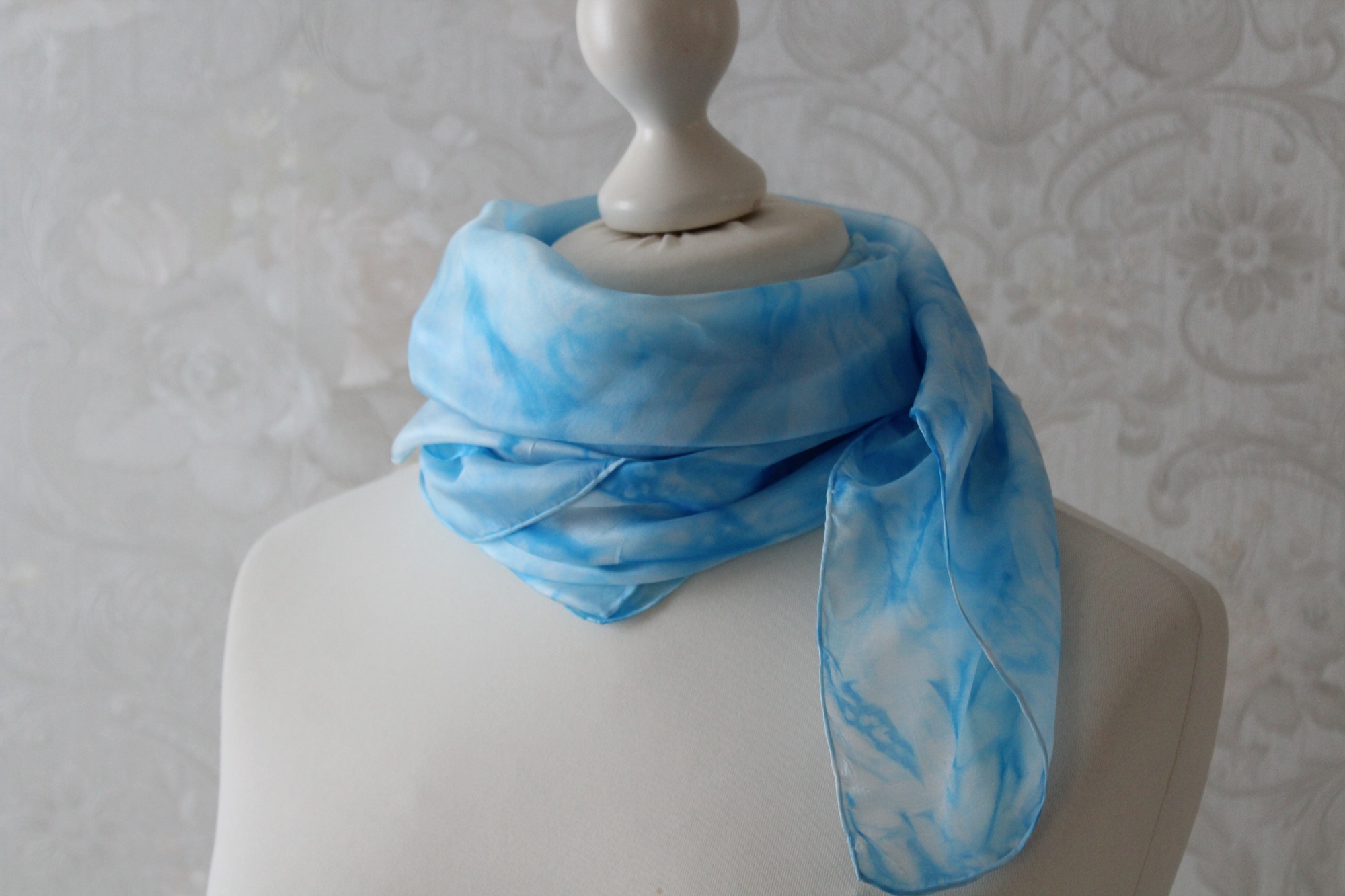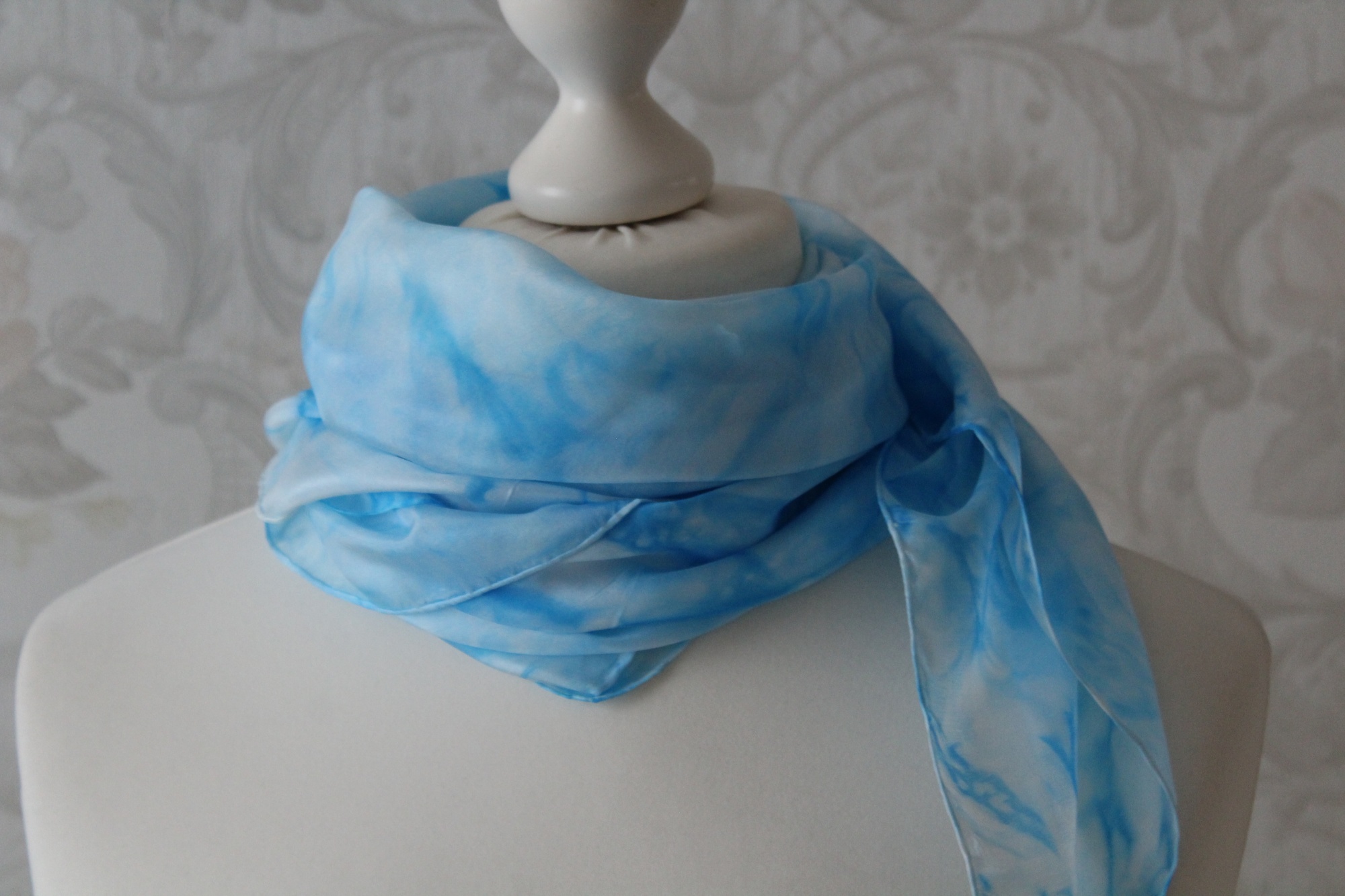 Das Seidentuch ist in hellen blauen Farbentönen gestaltet. Es ist ein Seidentuch aus der Reihe Farbgeflüster, Handmade in Germany.