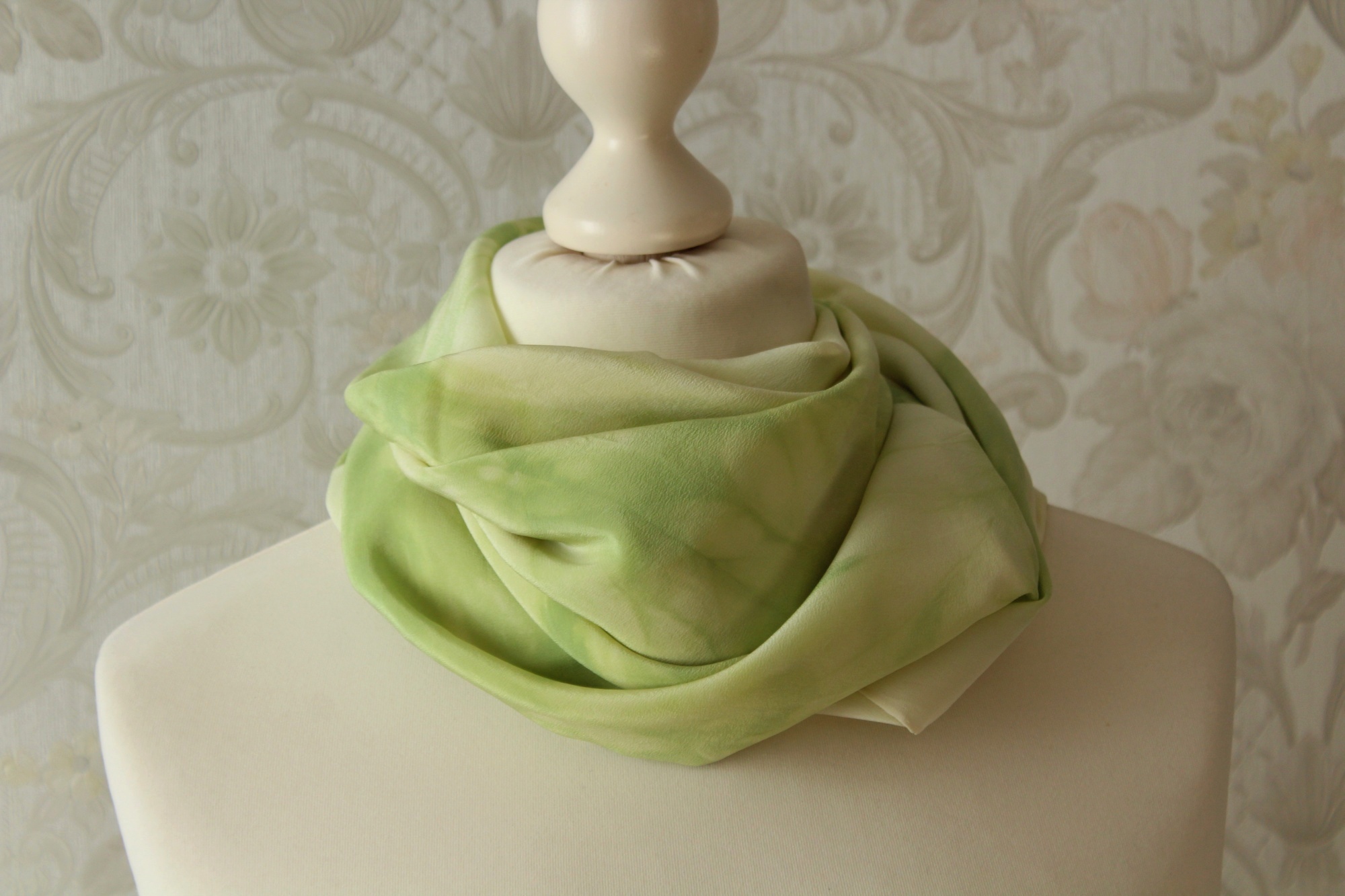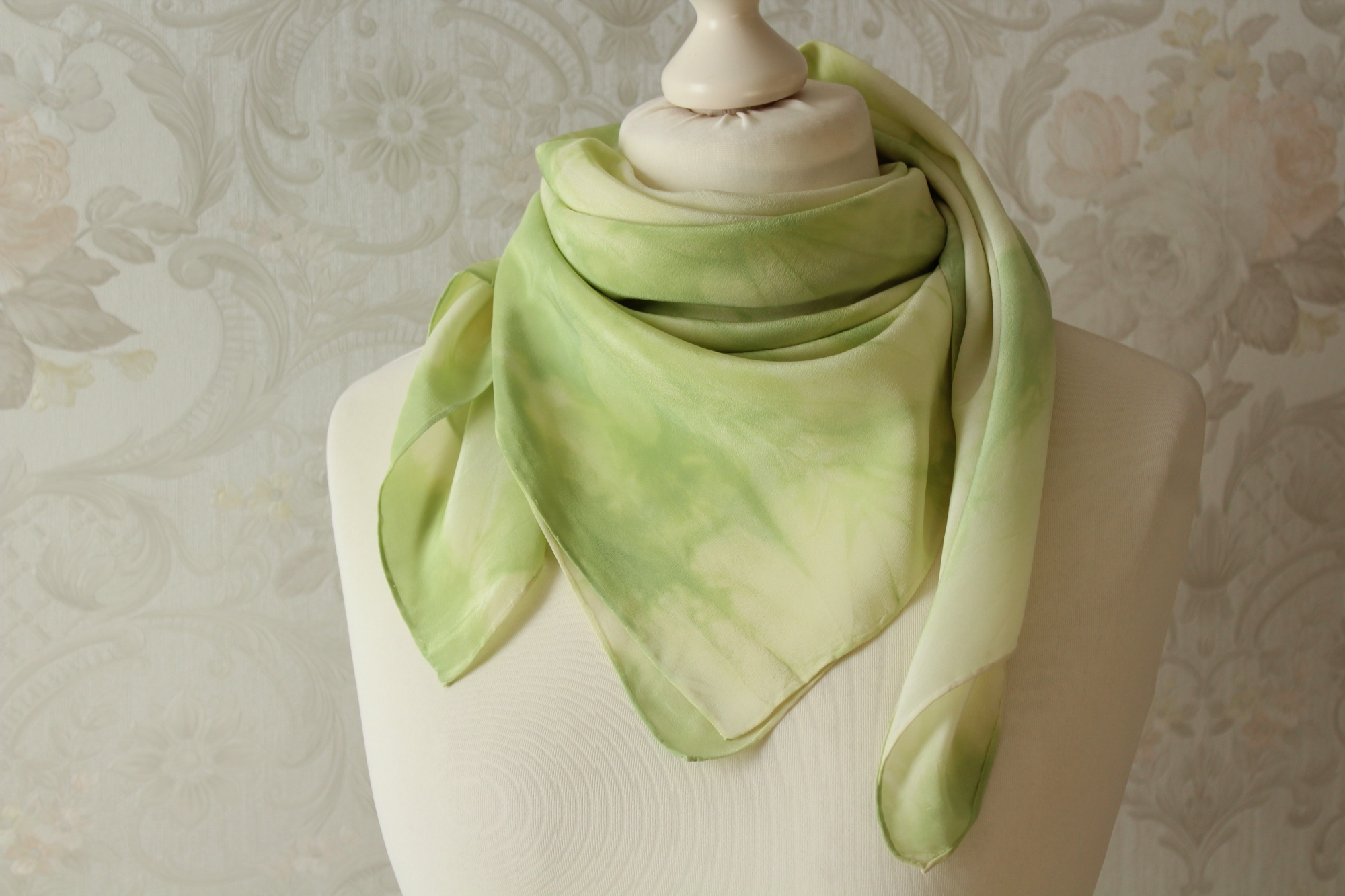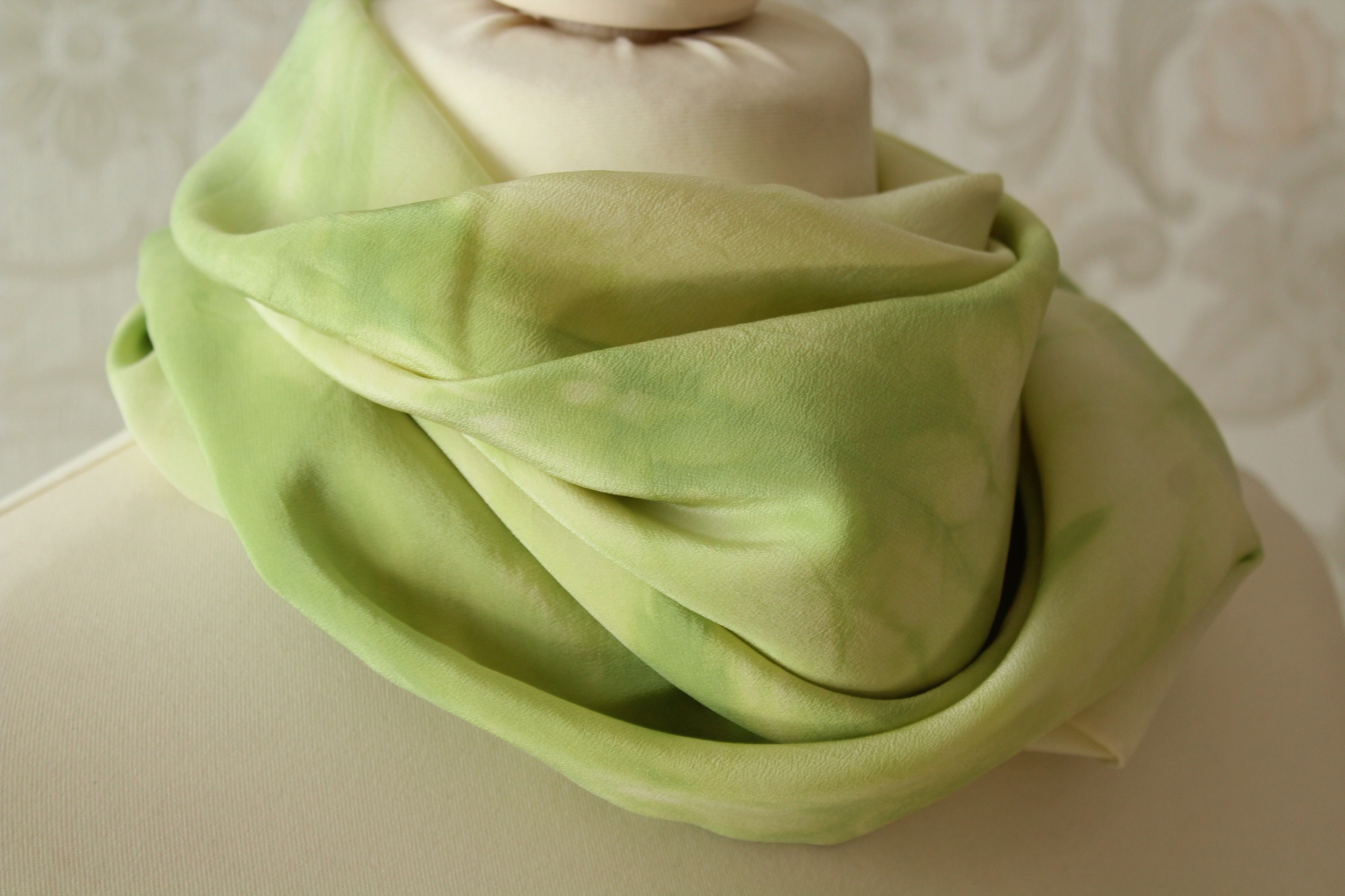 Das frühlingsgrüne Tuch aus Seide ist in Handarbeit gefertigt und ein weiteres Stück der Sinfonie Reihe. Es ist 90 x 90 cm groß. Frische grüne Farbverläufe auf hellem Grund wechseln sich harmonisch ab. Die Farbverläufe sind leicht streifenförmig angelegt. Die Seidenart ist eine stabile Crepe de Chine Seide. Diese ist etwas dicker als die übliche Ponge Seide und hat eine leicht strukturierte Oberfläche. Dies hat den Vorteil, dass die Seide nicht so schnell knittert und nicht zwingend gebügelt werden muss.