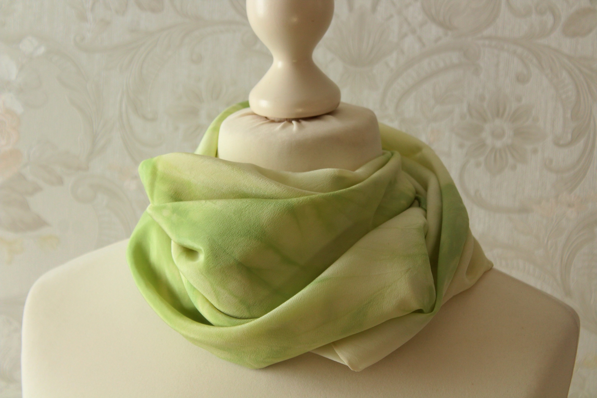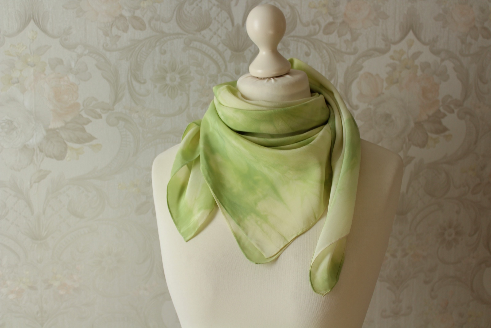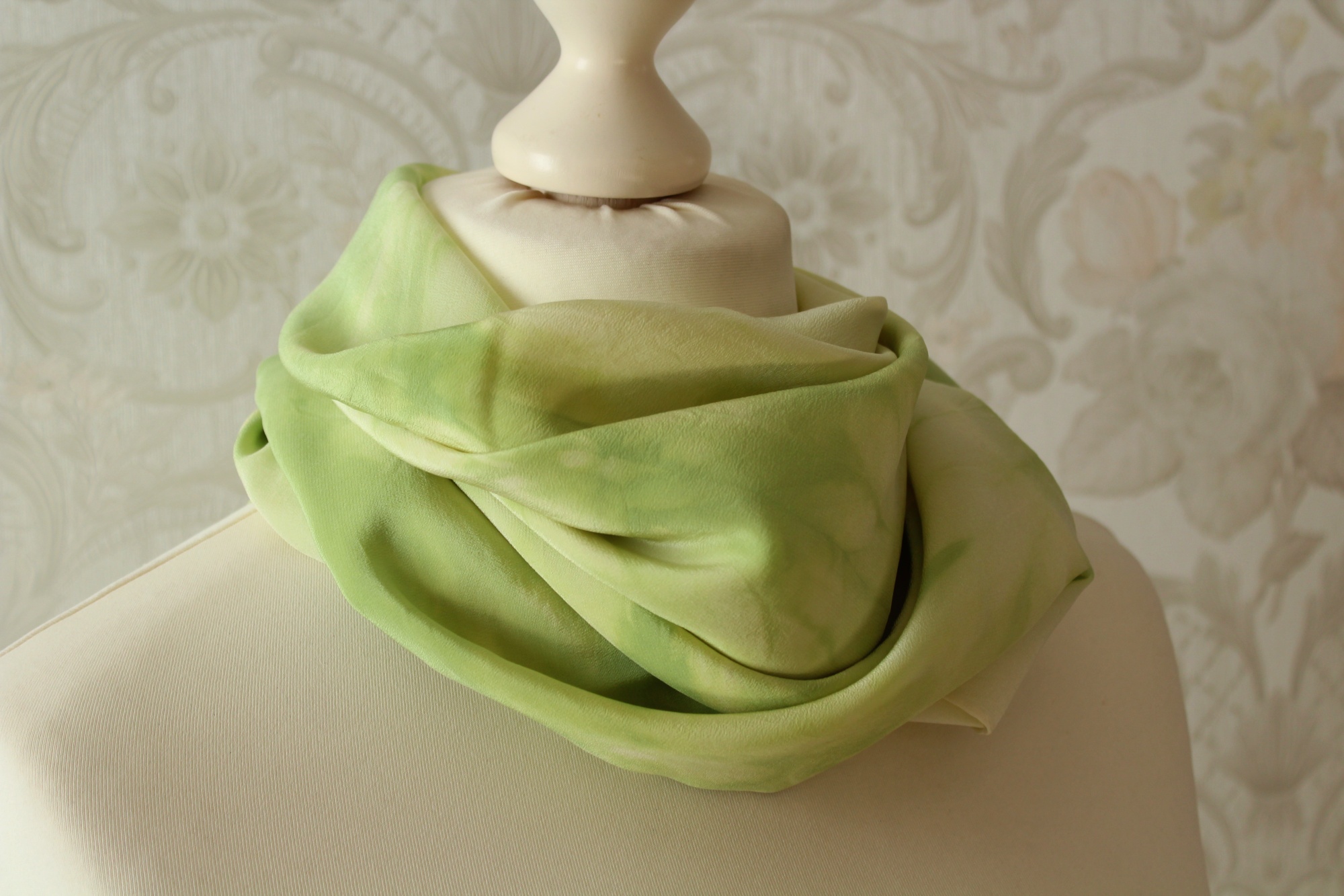 Das frühlingsgrüne Tuch aus Seide ist in Handarbeit gefertigt und ein weiteres Stück der Sinfonie Reihe. Es ist 90 x 90 cm groß. Frische grüne Farbverläufe auf hellem Grund wechseln sich harmonisch ab. Die Farbverläufe sind leicht streifenförmig angelegt. Die Seidenart ist eine stabile Crepe de Chine Seide. Diese ist etwas dicker als die übliche Ponge Seide und hat eine leicht strukturierte Oberfläche. Dies hat den Vorteil, dass die Seide nicht so schnell knittert und nicht zwingend gebügelt werden muss.