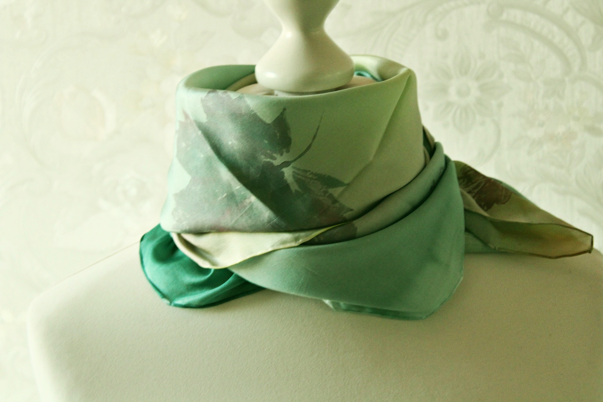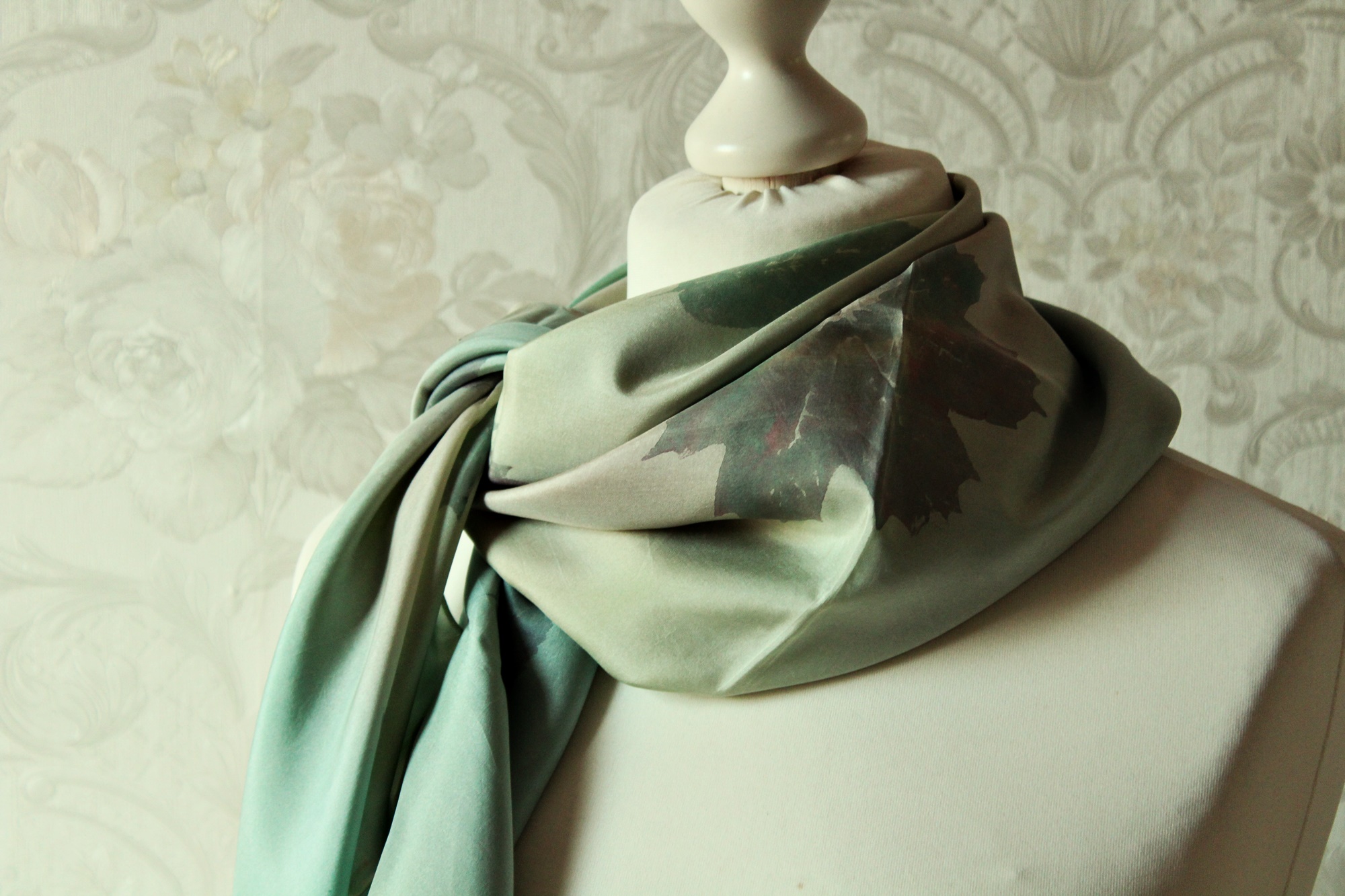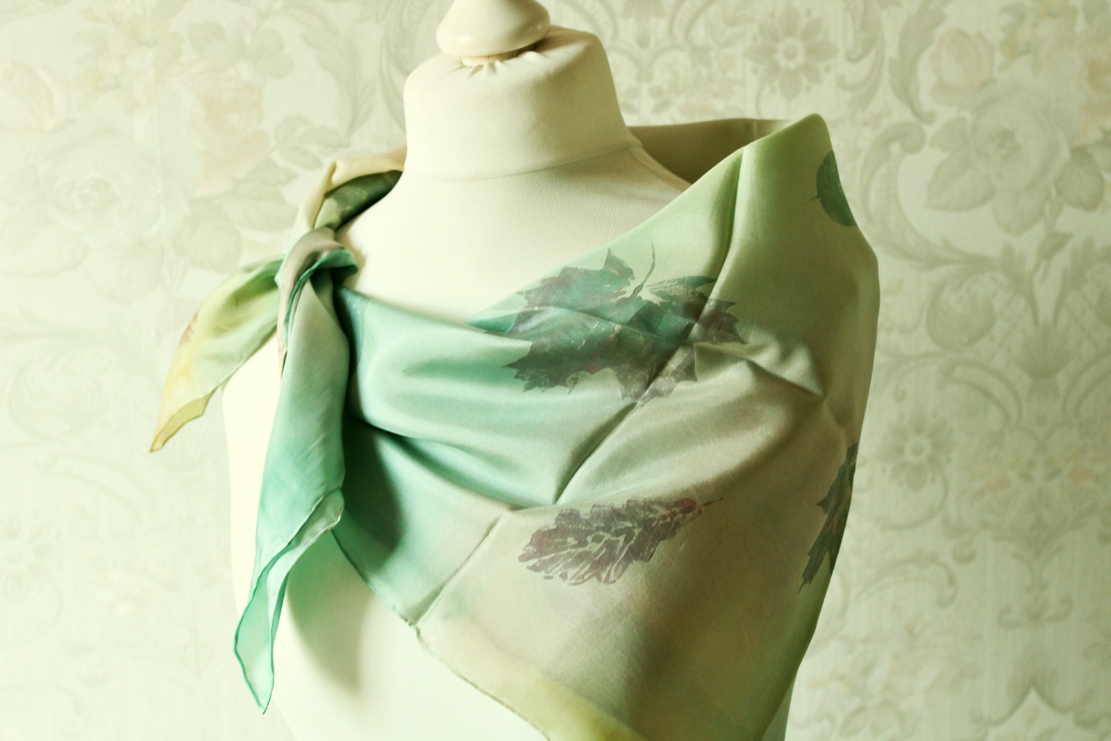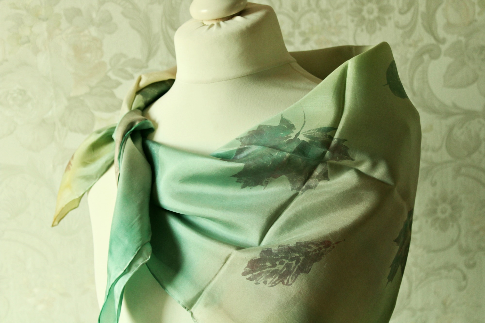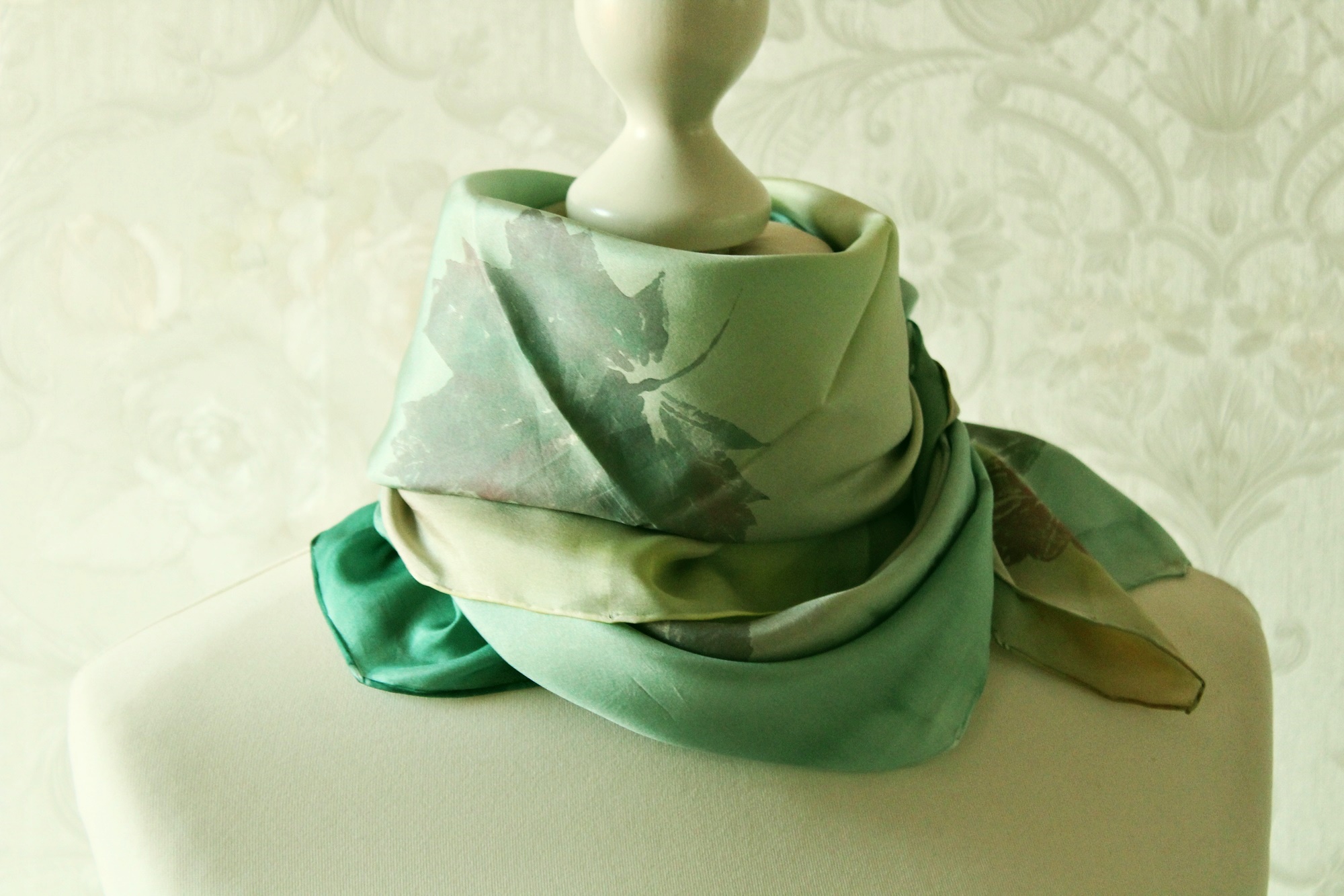 Das Tuch Herbstlaub ist ein von Hand bemaltes Seidentuch. Auf beige grünem Hintergrund, die Farben gehen ineinander über, sind verschiedene Blätter zu sehen. Diese sind mittels Drucktechnik aufgemalt.