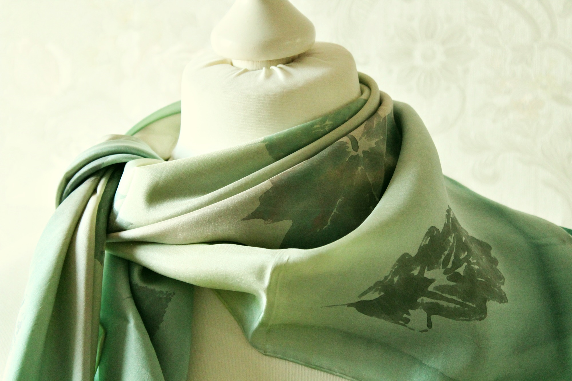 Das Muster ist selbst entworfen, dieses Tuch gibt es so nicht noch einmal. Das Seidentuch ist ein Unikat.