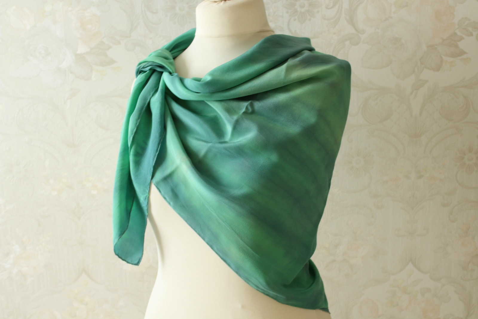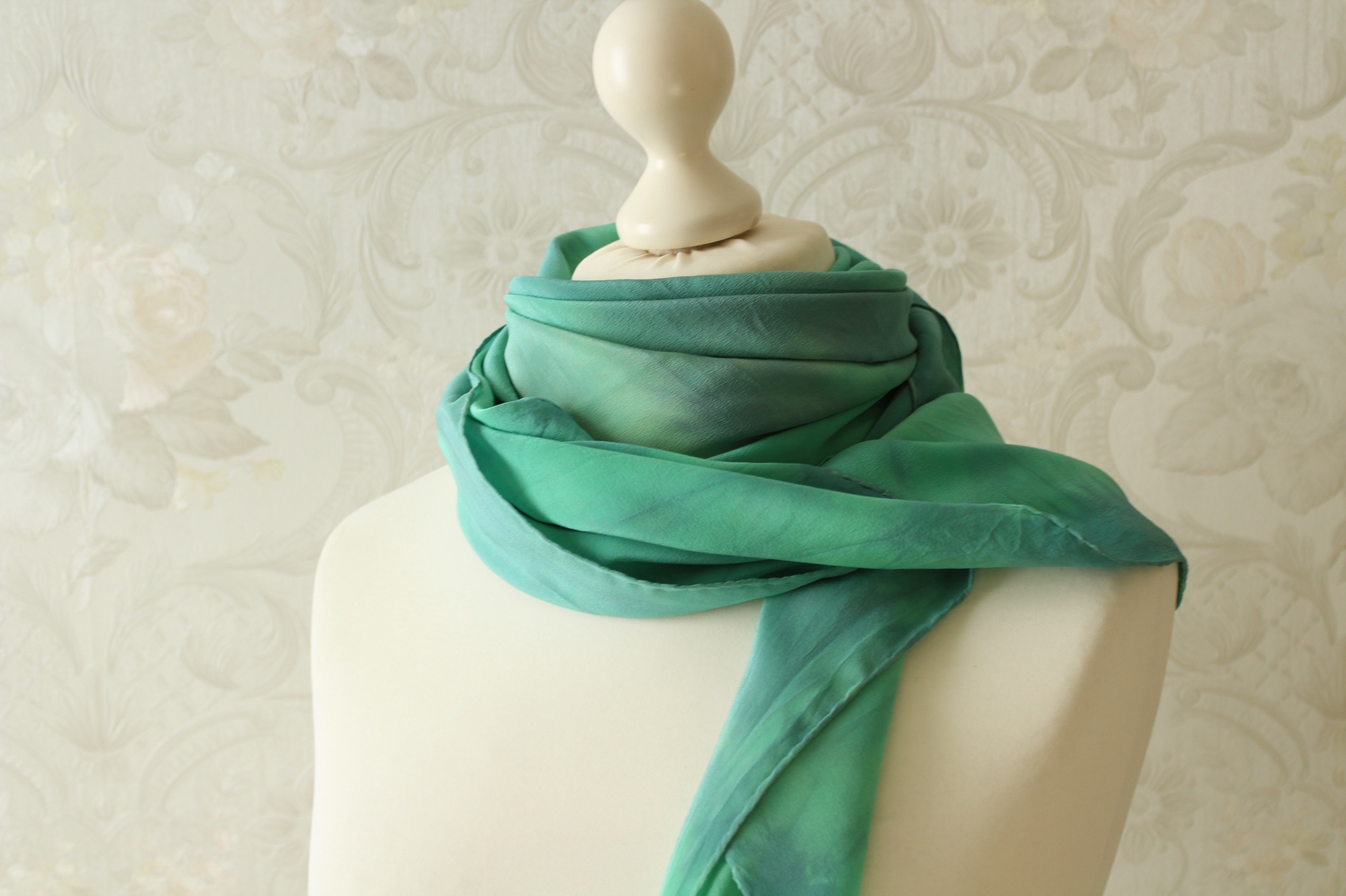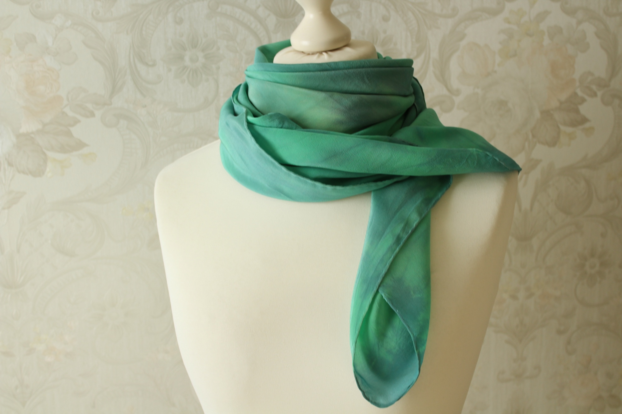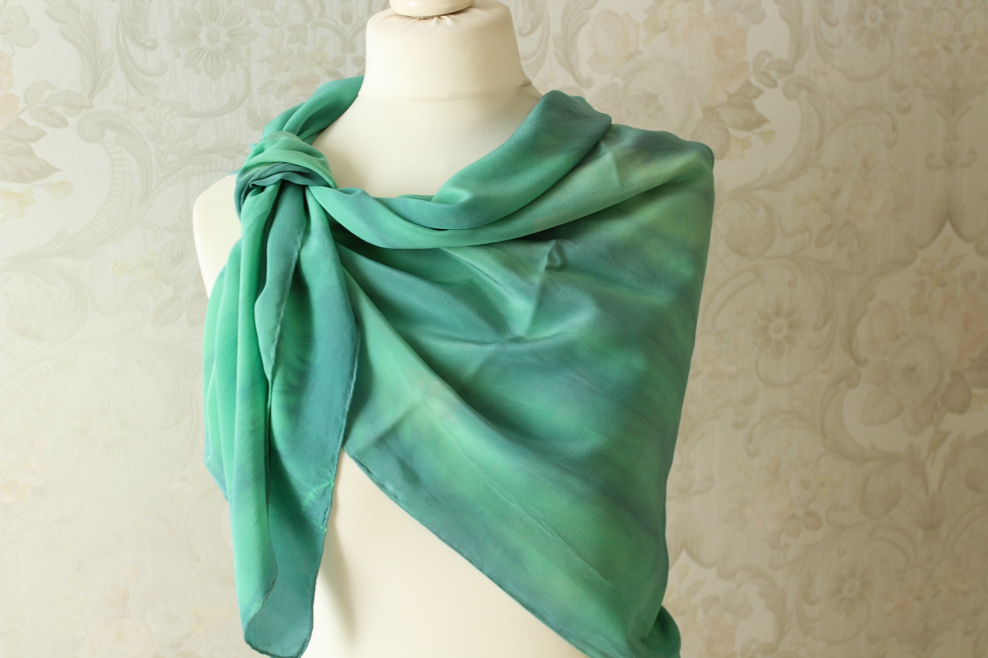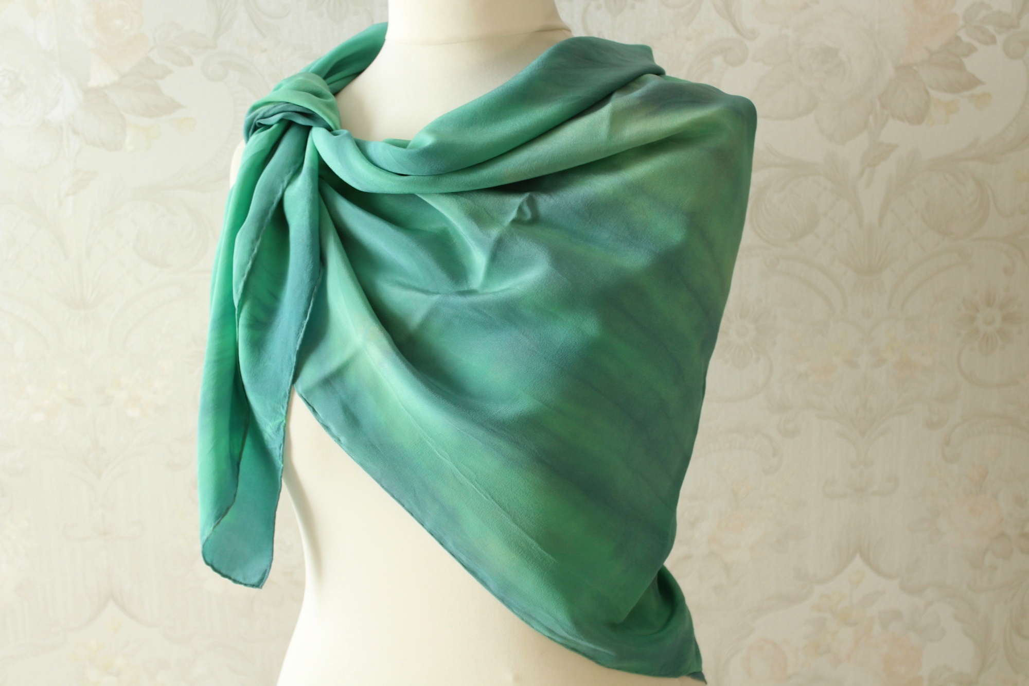 Das grüne Tuch aus Seide ist in Handarbeit gefertigt und ein weiteres Stück der Sinfonie Reihe. Grüne und blaue Töne wechseln sich harmonisch ab. Die Farbverläufe sind leicht streifenförmig angelegt. Die Seidenart ist eine stabile Crepe de Chine Seide. Diese ist etwas dicker als die übliche Ponge Seide und hat eine leicht strukturierte Oberfläche. Dies hat den Vorteil, dass die Seide nicht so schnell knittert und nicht zwingend gebügelt werden muss.