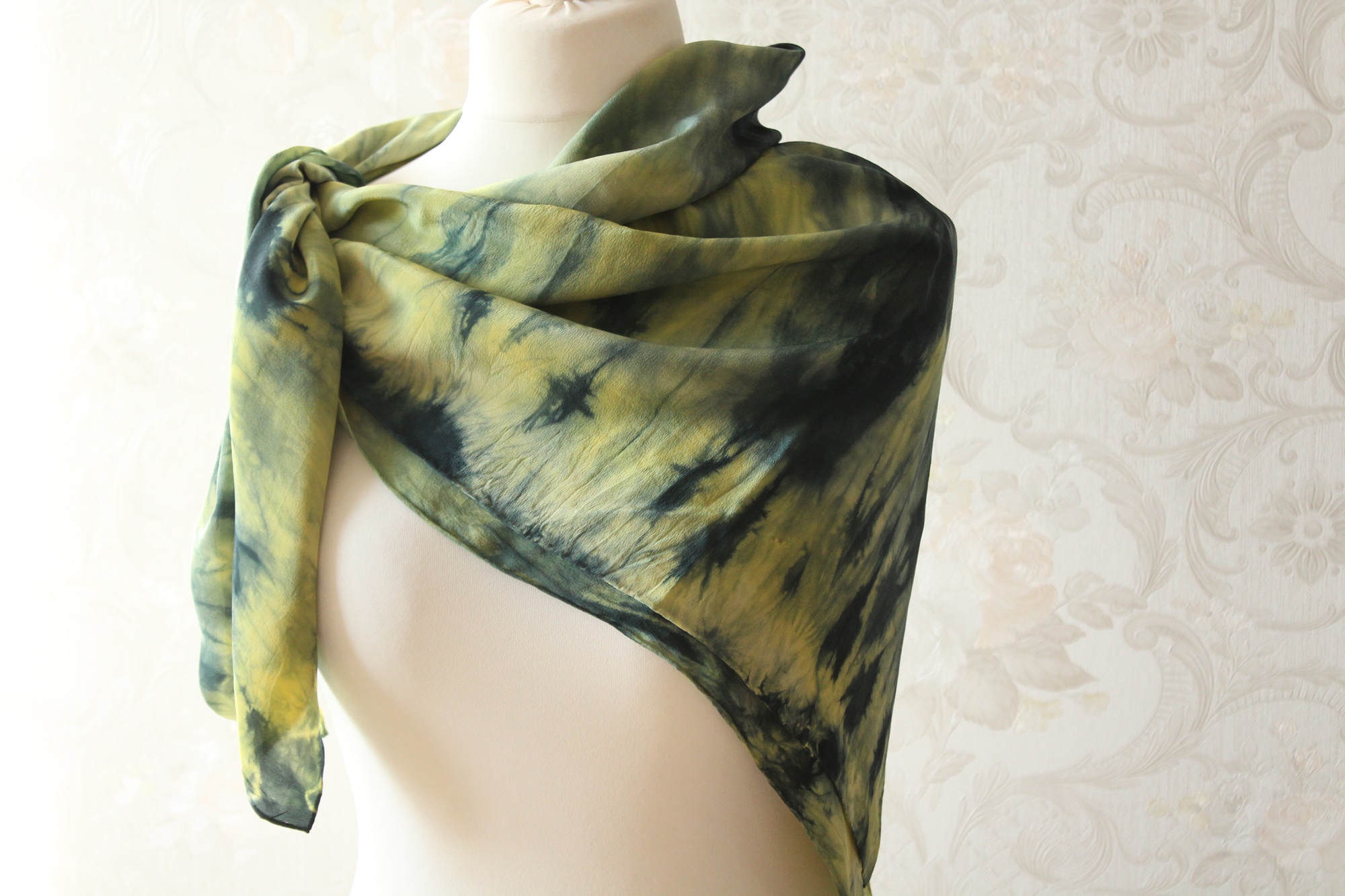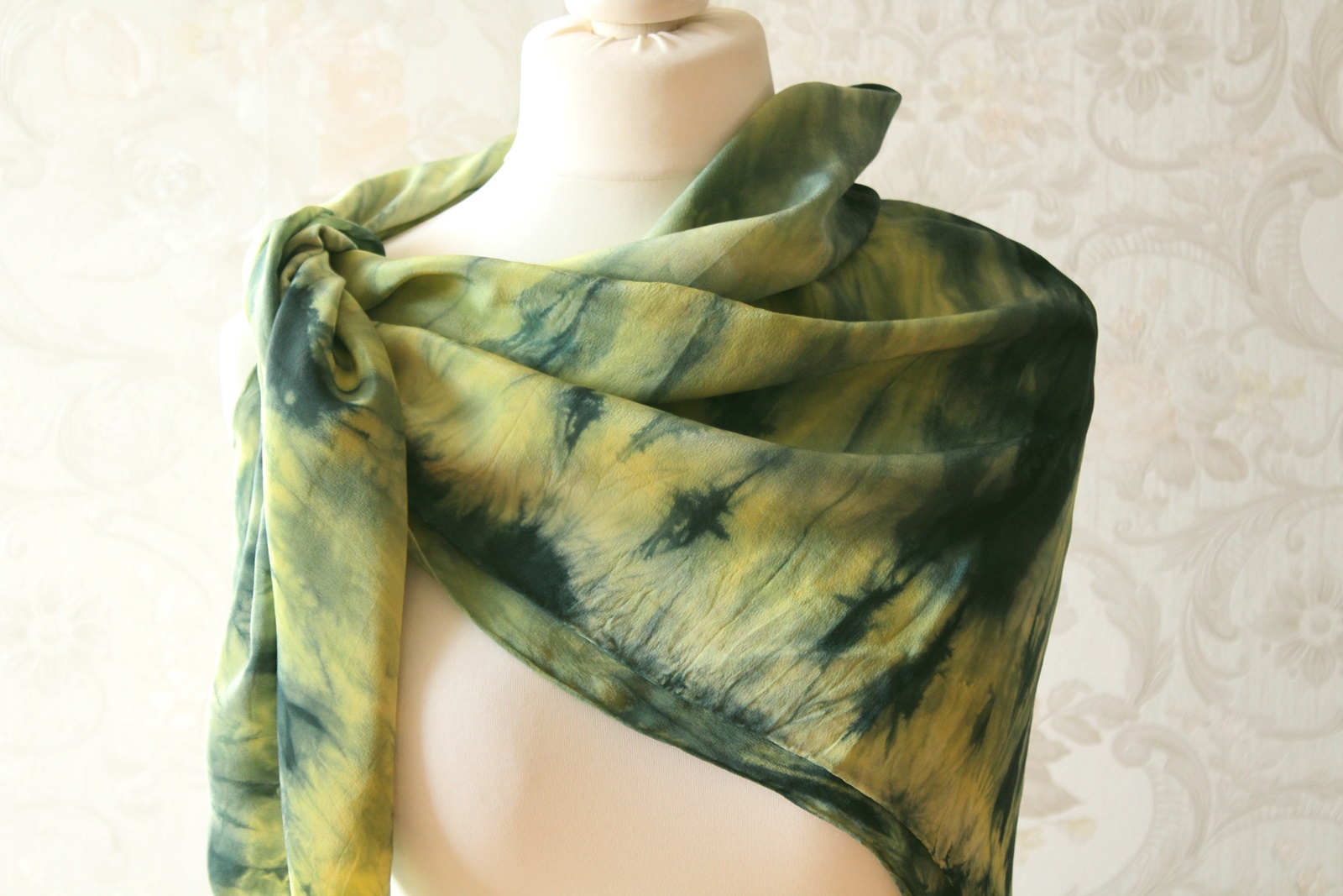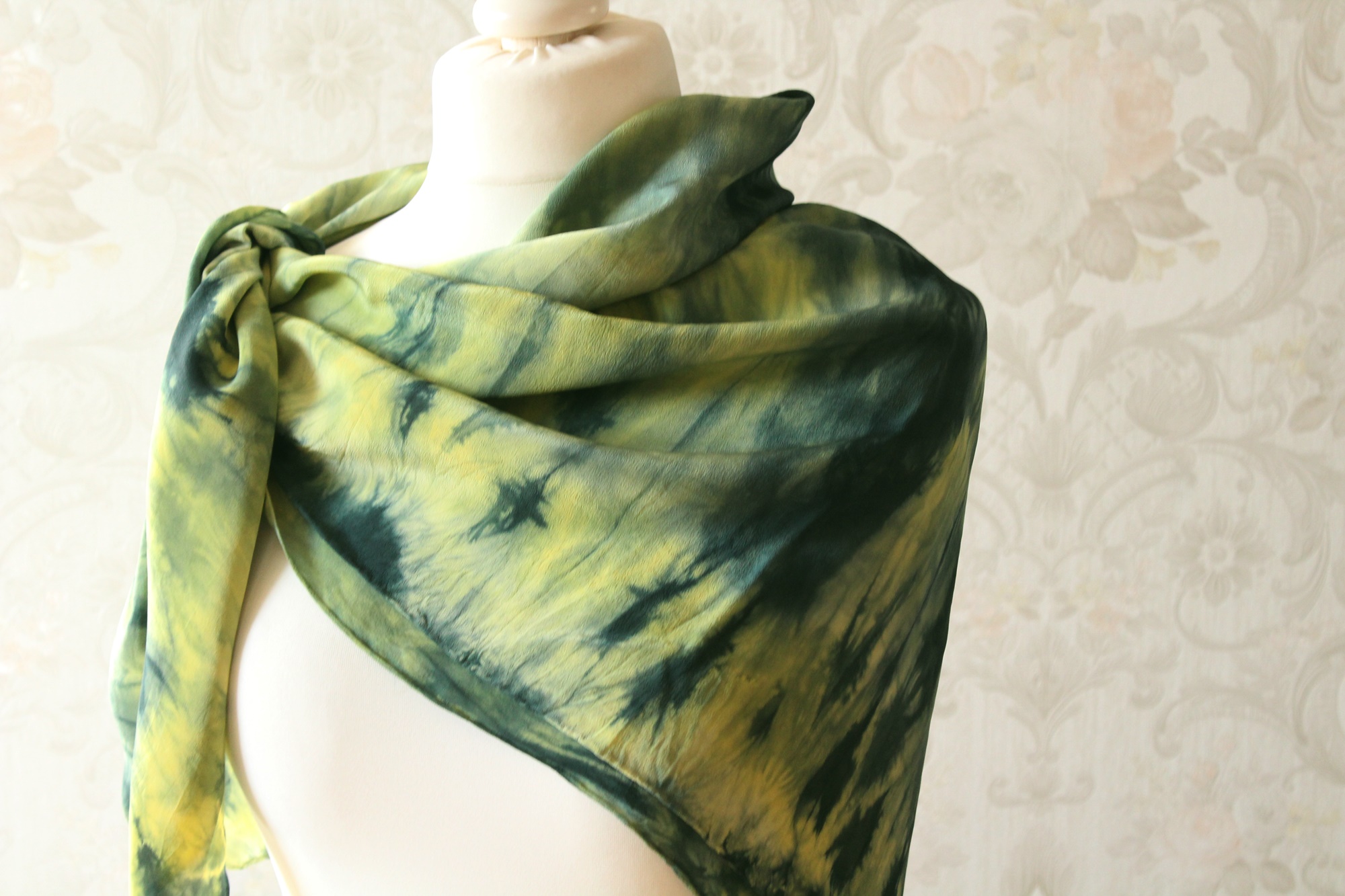 Das grüne Tuch aus Seide ist in Handarbeit gefertigt und ein weiteres Stück der Sinfonie Reihe. Es ist recht groß, ca. 100 x 100 cm. Grüne Töne, helle gelbgrüne und dunkle Tanne, wechseln sich harmonisch ab. Die Farbverläufe sind leicht streifenförmig angelegt. Die Seidenart ist eine stabile Crepe de Chine Seide. Diese ist etwas dicker als die übliche Ponge Seide und hat eine leicht strukturierte Oberfläche. Dies hat den Vorteil, dass die Seide nicht so schnell knittert und nicht zwingend gebügelt werden muss.