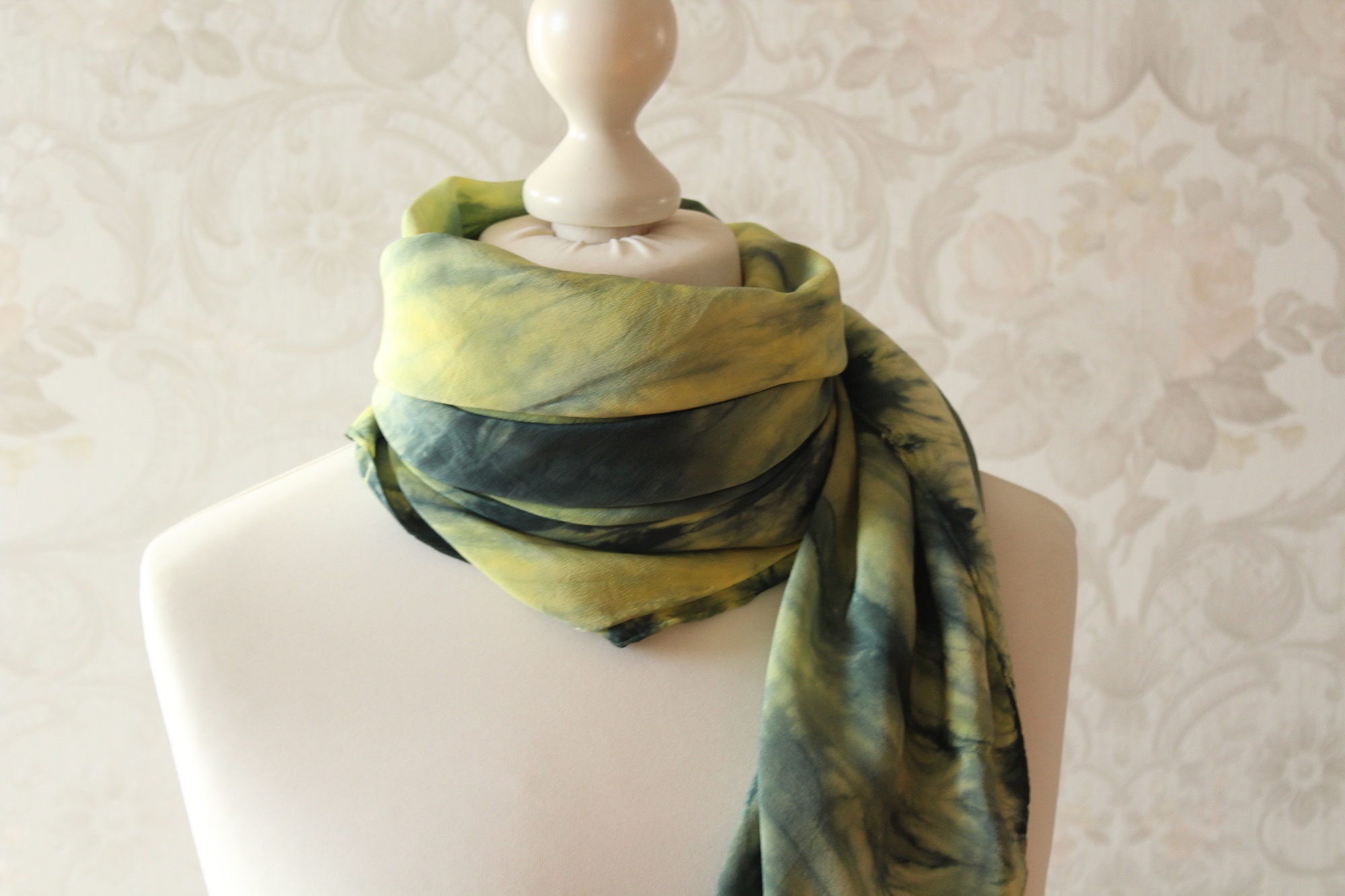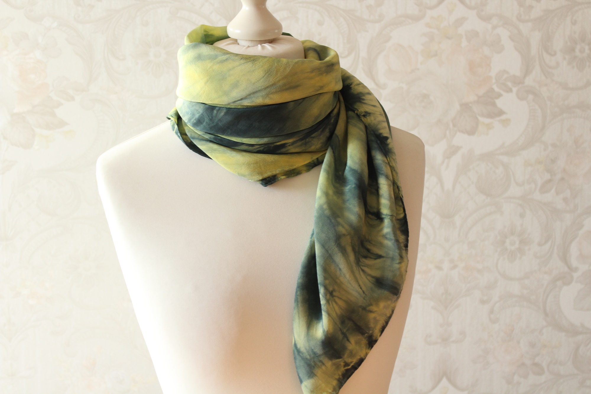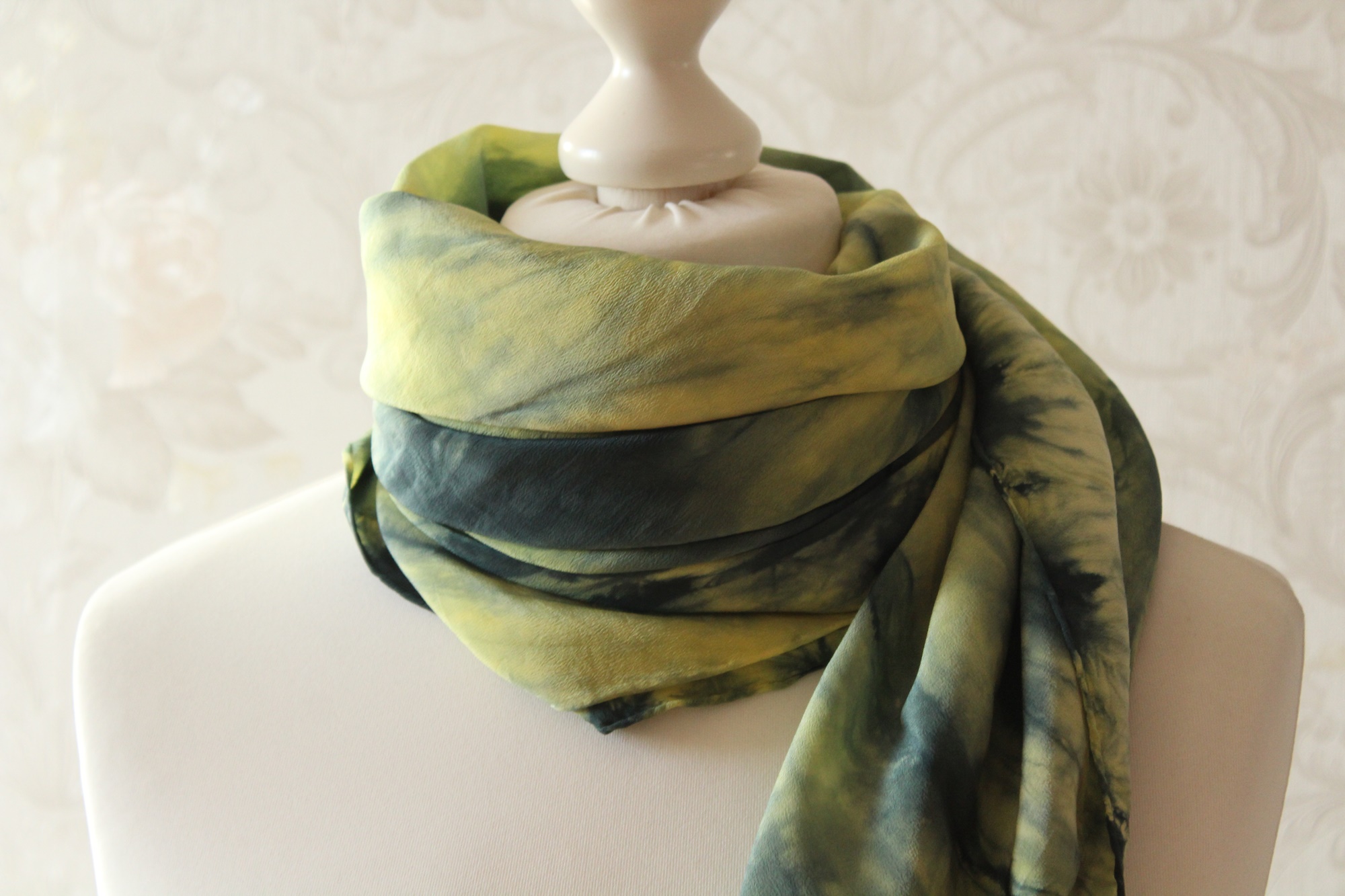 Das grüne Tuch aus Seide ist in Handarbeit gefertigt und ein weiteres Stück der Sinfonie Reihe. Es ist recht groß, ca. 100 x 100 cm. Grüne Töne, helle gelbgrüne und dunkle Tanne, wechseln sich harmonisch ab. Die Farbverläufe sind leicht streifenförmig angelegt. Die Seidenart ist eine stabile Crepe de Chine Seide. Diese ist etwas dicker als die übliche Ponge Seide und hat eine leicht strukturierte Oberfläche. Dies hat den Vorteil, dass die Seide nicht so schnell knittert und nicht zwingend gebügelt werden muss.