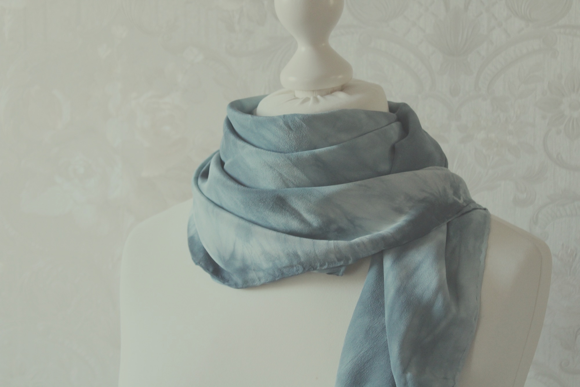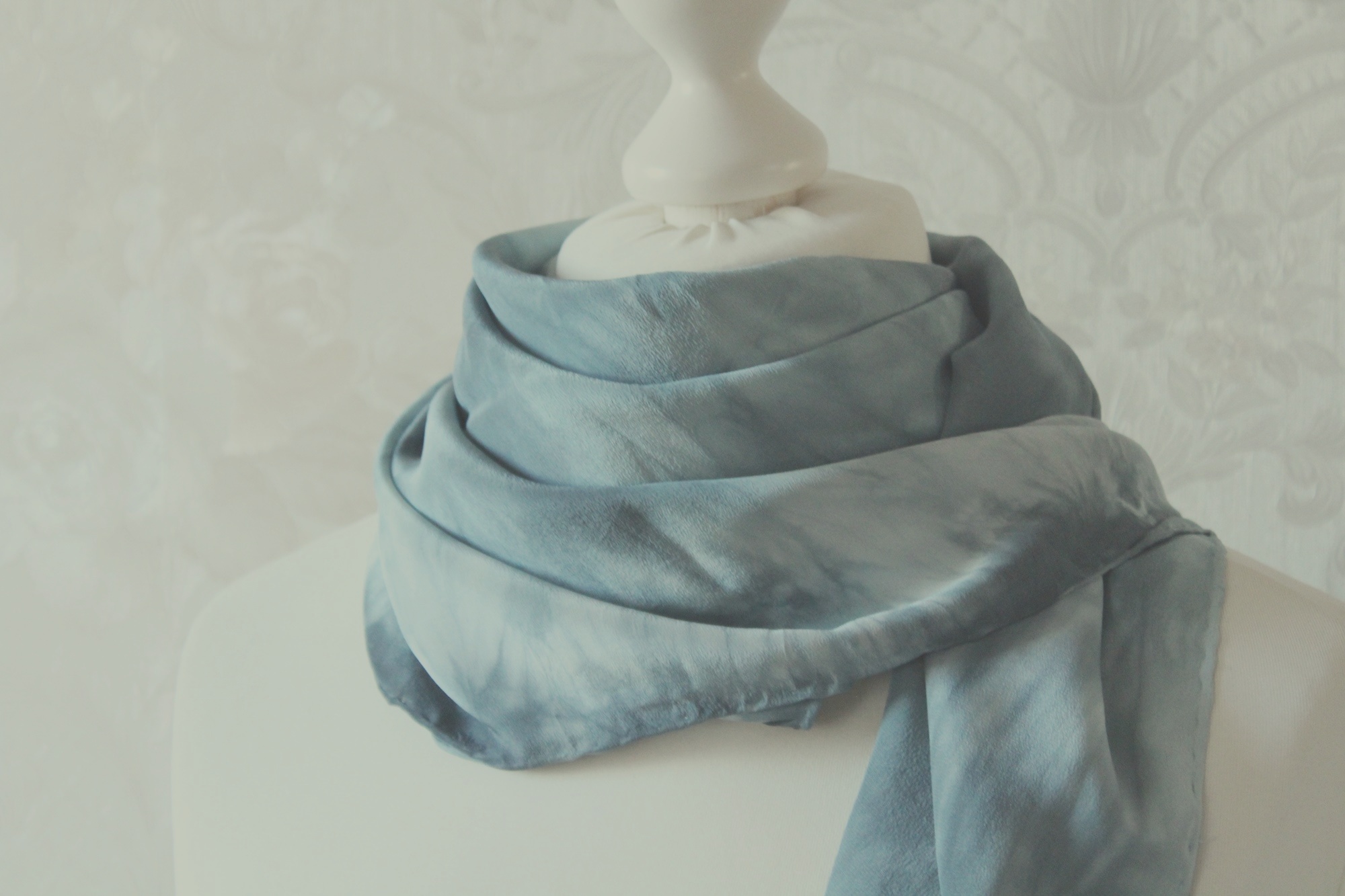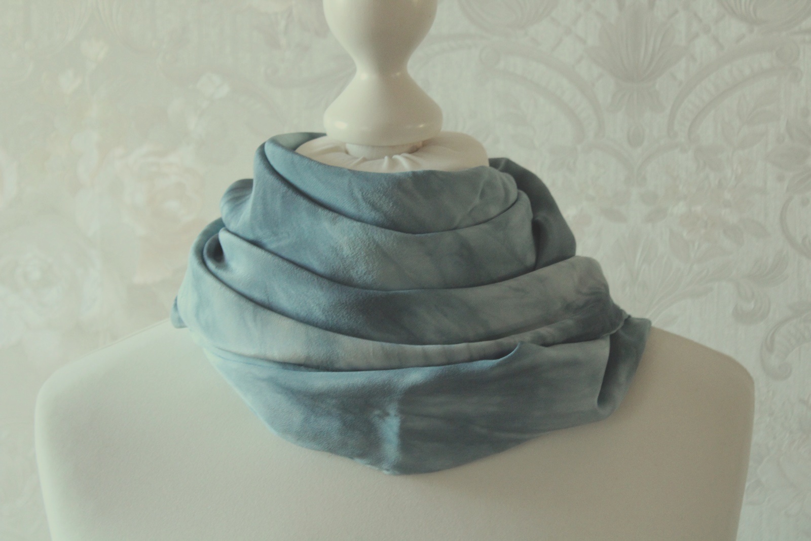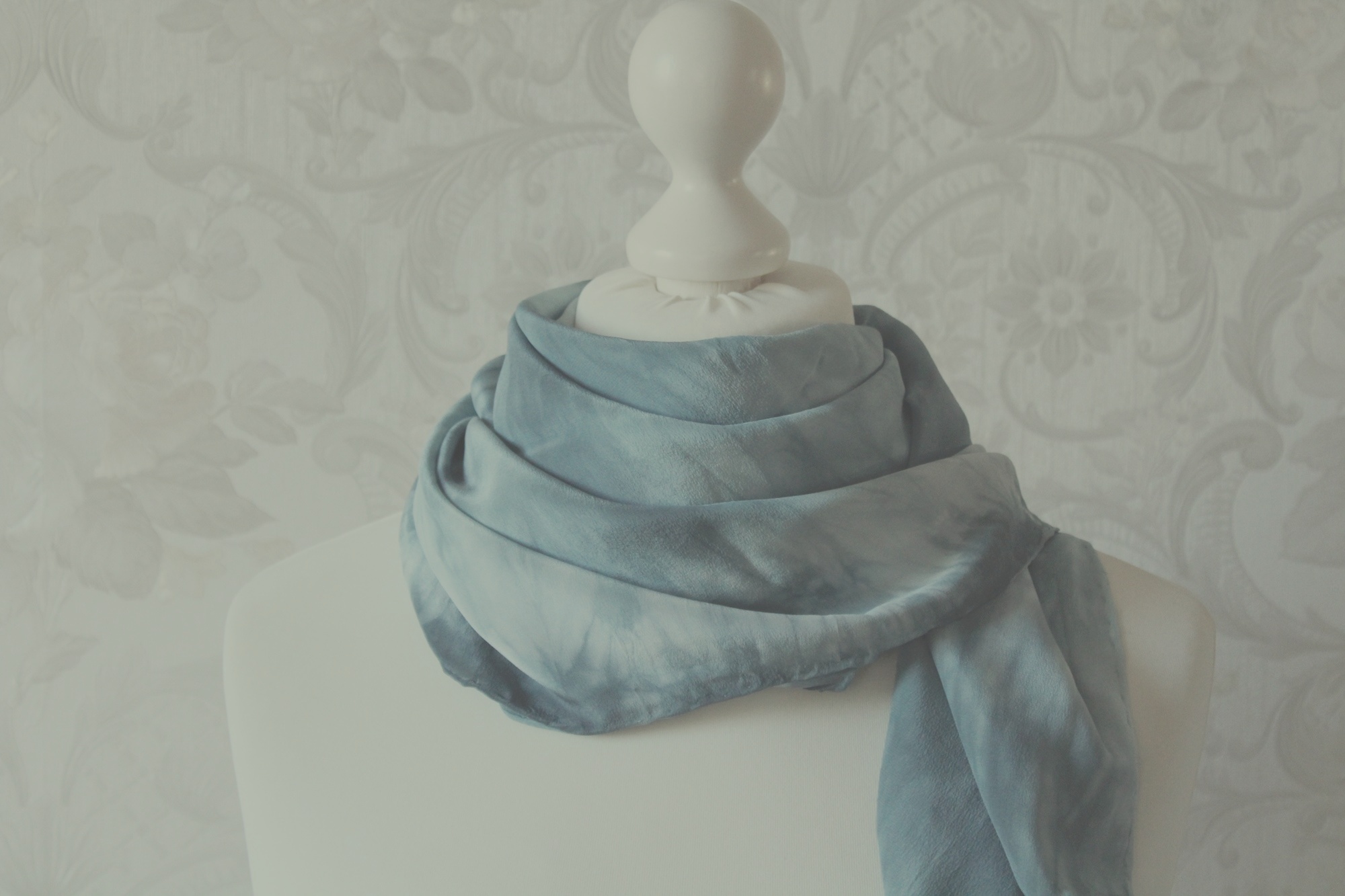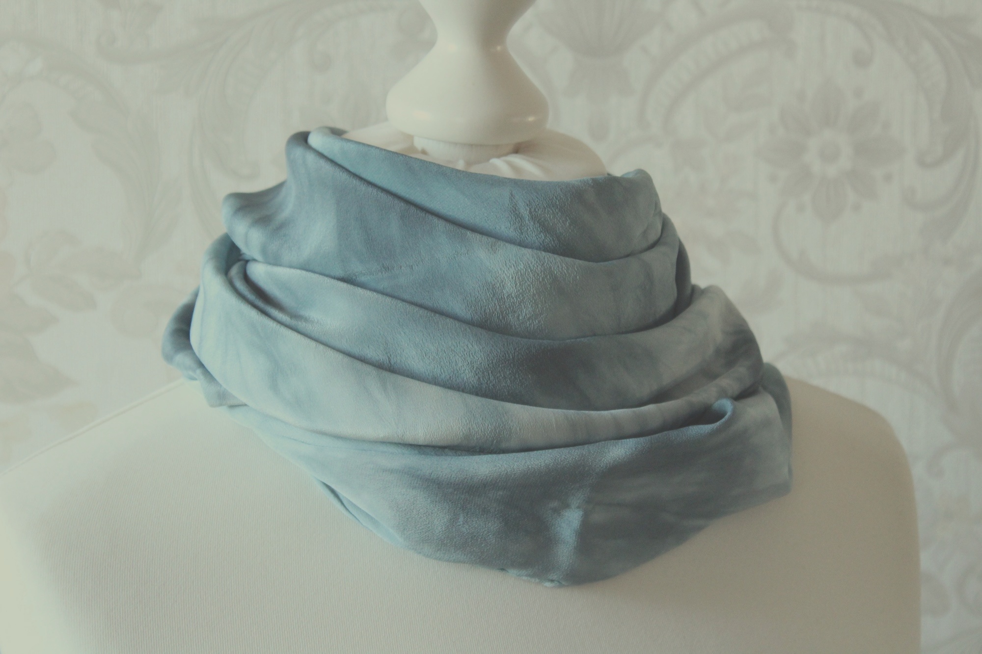 Das hellblaue Tuch aus Seide ist in Handarbeit gefertigt und ein weiteres Stück der Sinfonie Reihe. Blaue Farbverläufe in verschiedenen Abstufungen wechseln sich harmonisch ab. Die Farbverläufe sind leicht streifenförmig angelegt. Die Seidenart ist eine stabile Crepe de Chine Seide. Diese ist etwas dicker als die übliche Ponge Seide und hat eine leicht strukturierte Oberfläche. Dies hat den Vorteil, dass die Seide nicht so schnell knittert und nicht zwingend gebügelt werden muss.