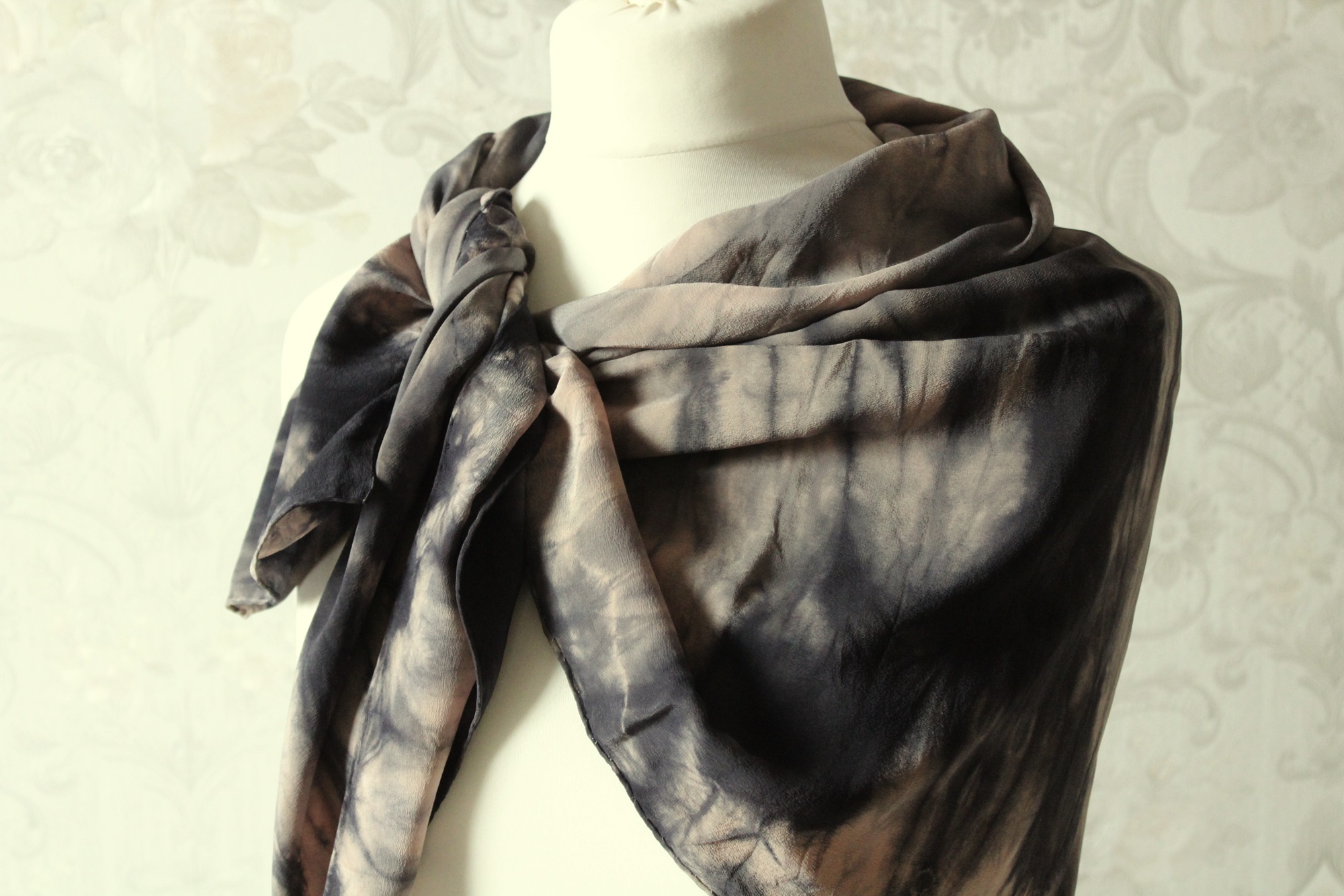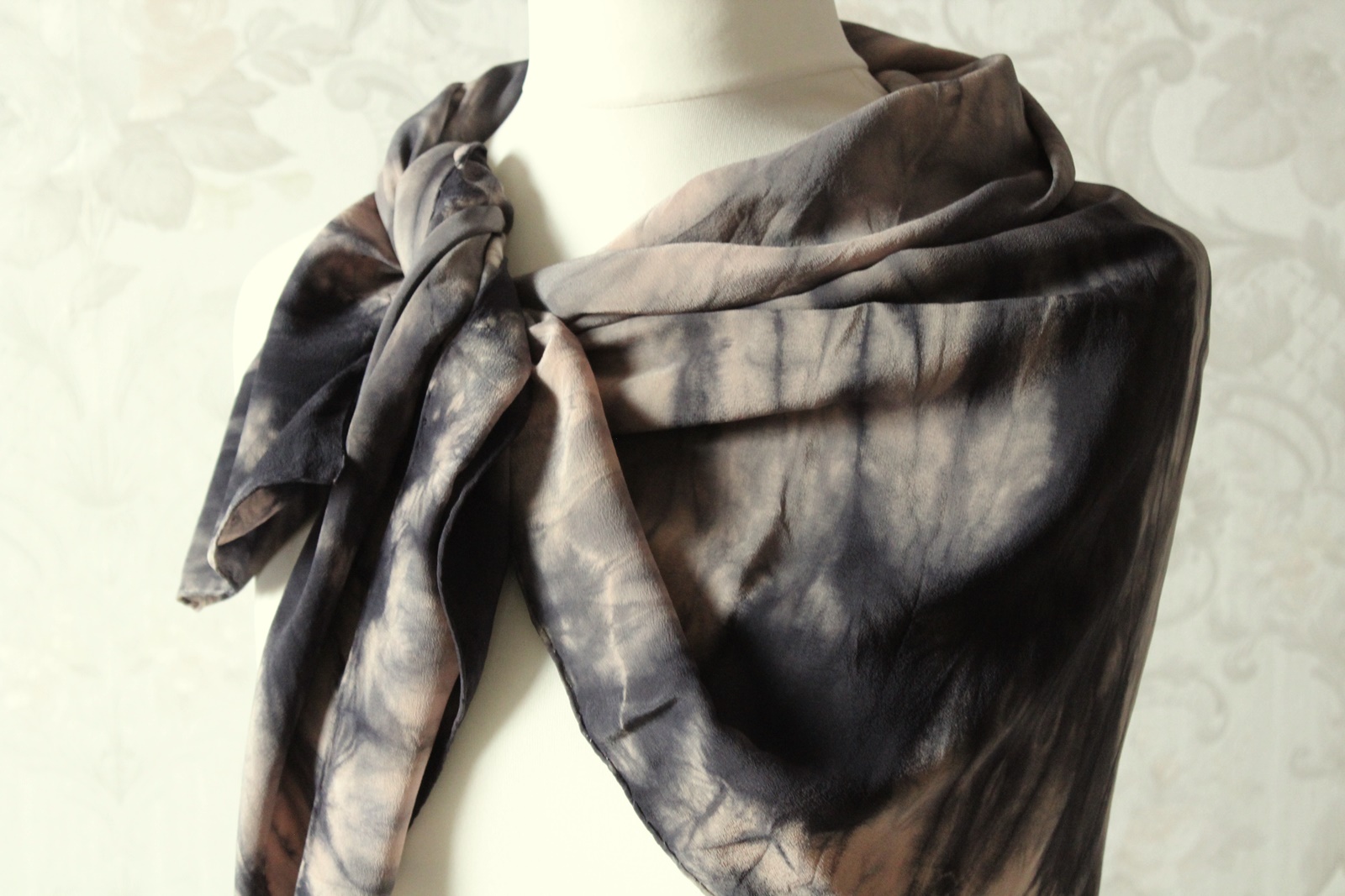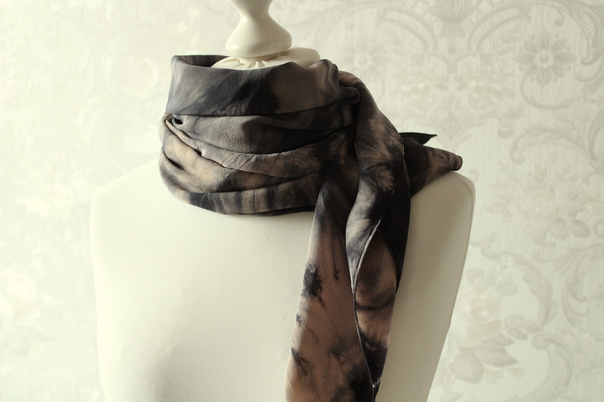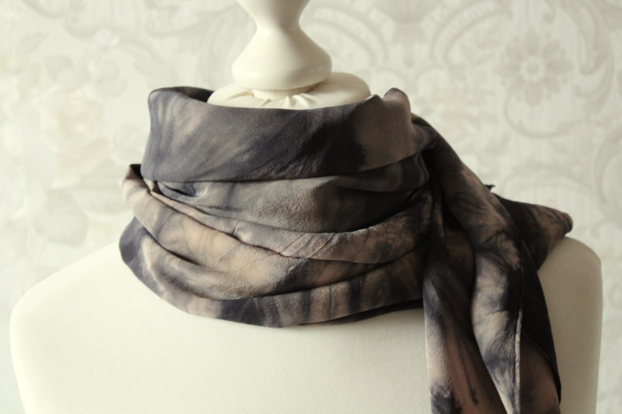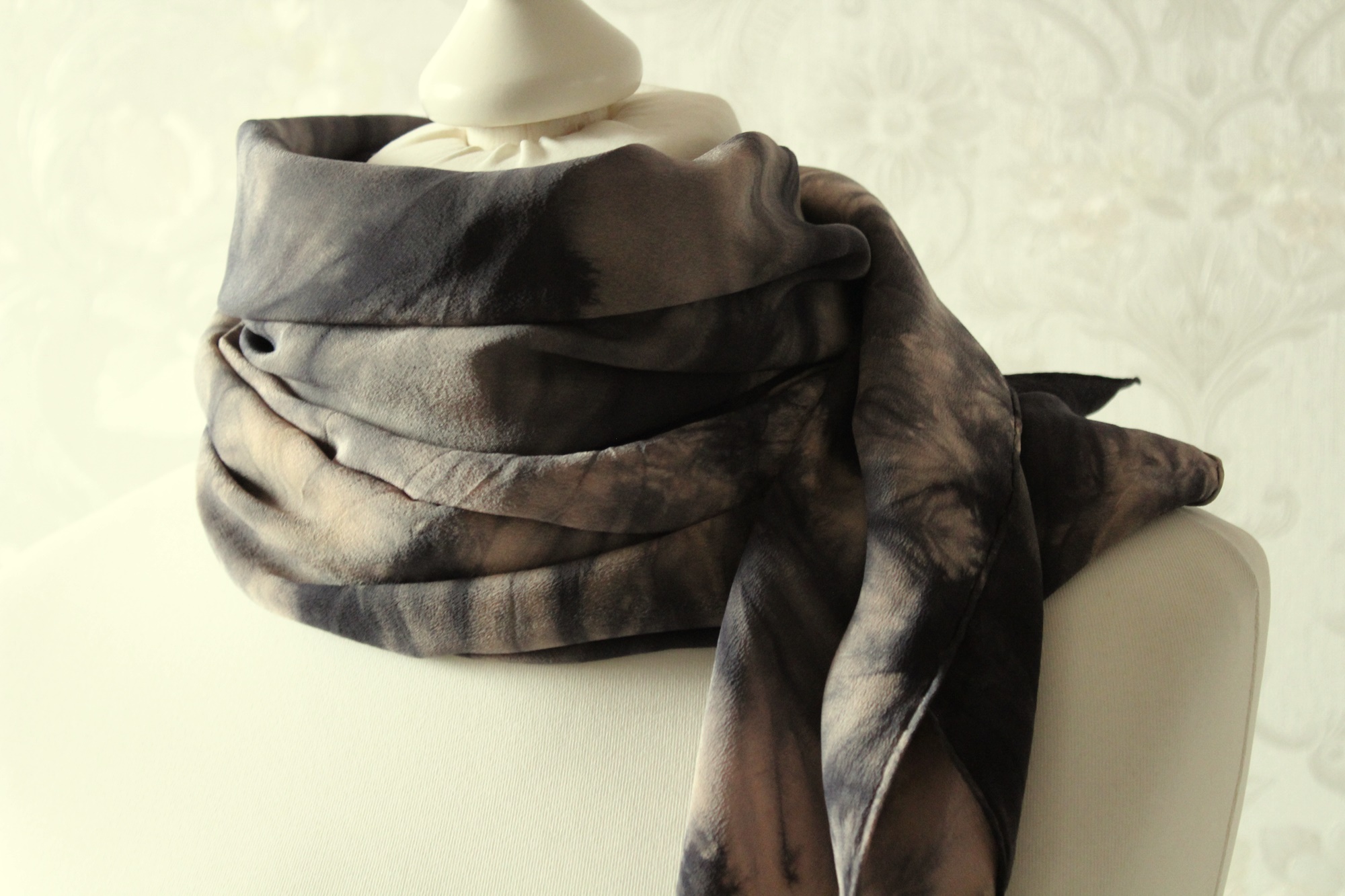 Das Tuch aus Seide ist in Handarbeit gefertigt und ein weiteres Seidentuch der Sinfonie Reihe. Es ist recht groß, ca.110 x 110 cm. Schwarze und beige Töne wechseln sich harmonisch ab. So ist dieses Tuch genau richtig für alle, die ein dunkleres Tuch suchen. Die Farbverläufe sind etwas streifenförmig angelegt. Die Seidenart ist eine stabile Crepe de Chine Seide. Diese ist etwas dicker als die übliche Ponge Seide und hat eine leicht strukturierte Oberfläche. Dies hat den Vorteil, dass die Seide nicht so schnell knittert und nicht zwingend gebügelt werden muss.