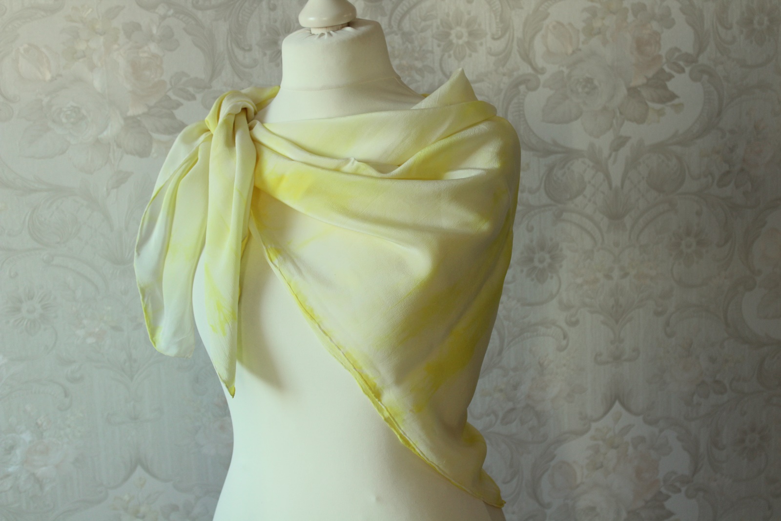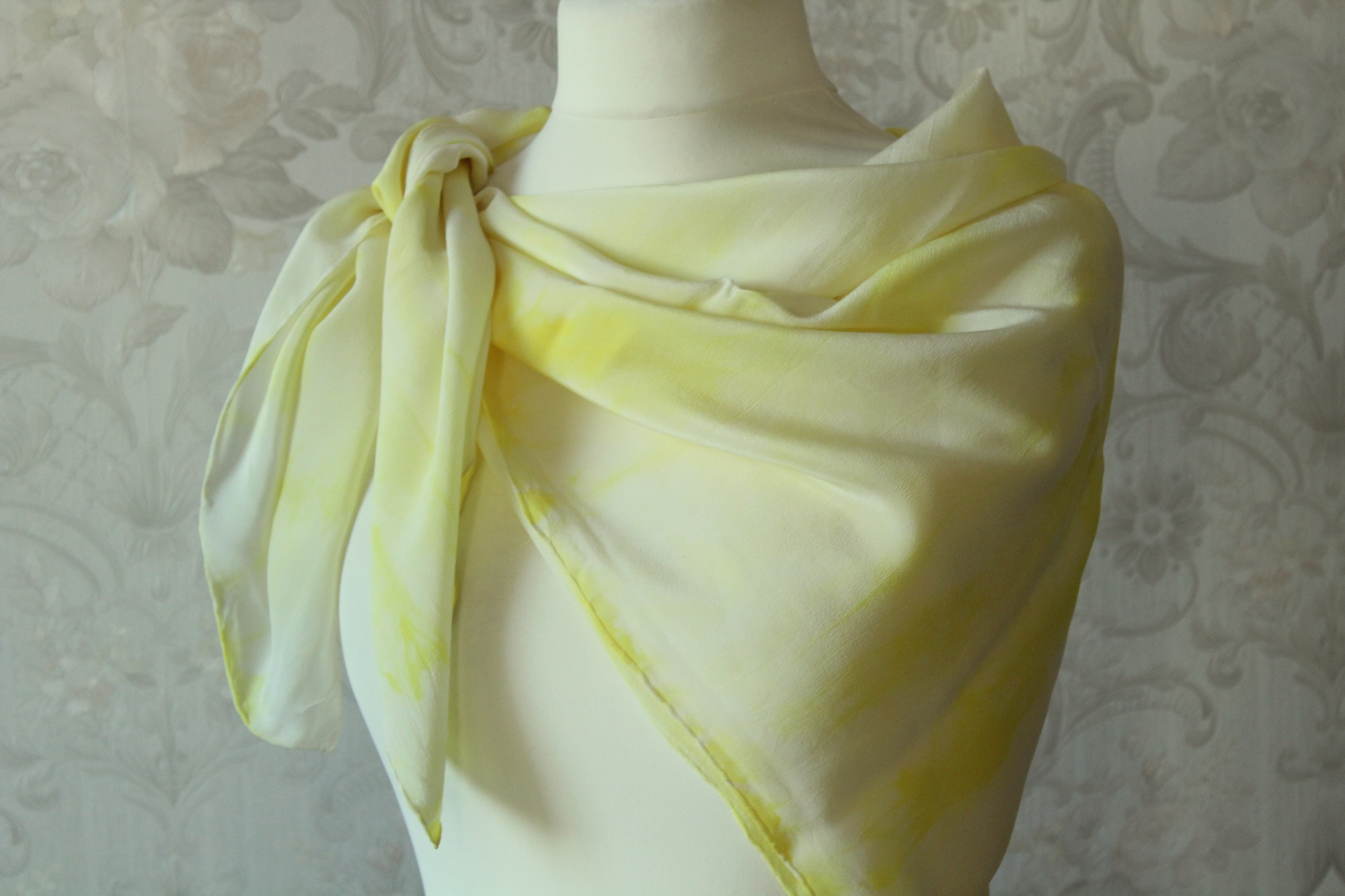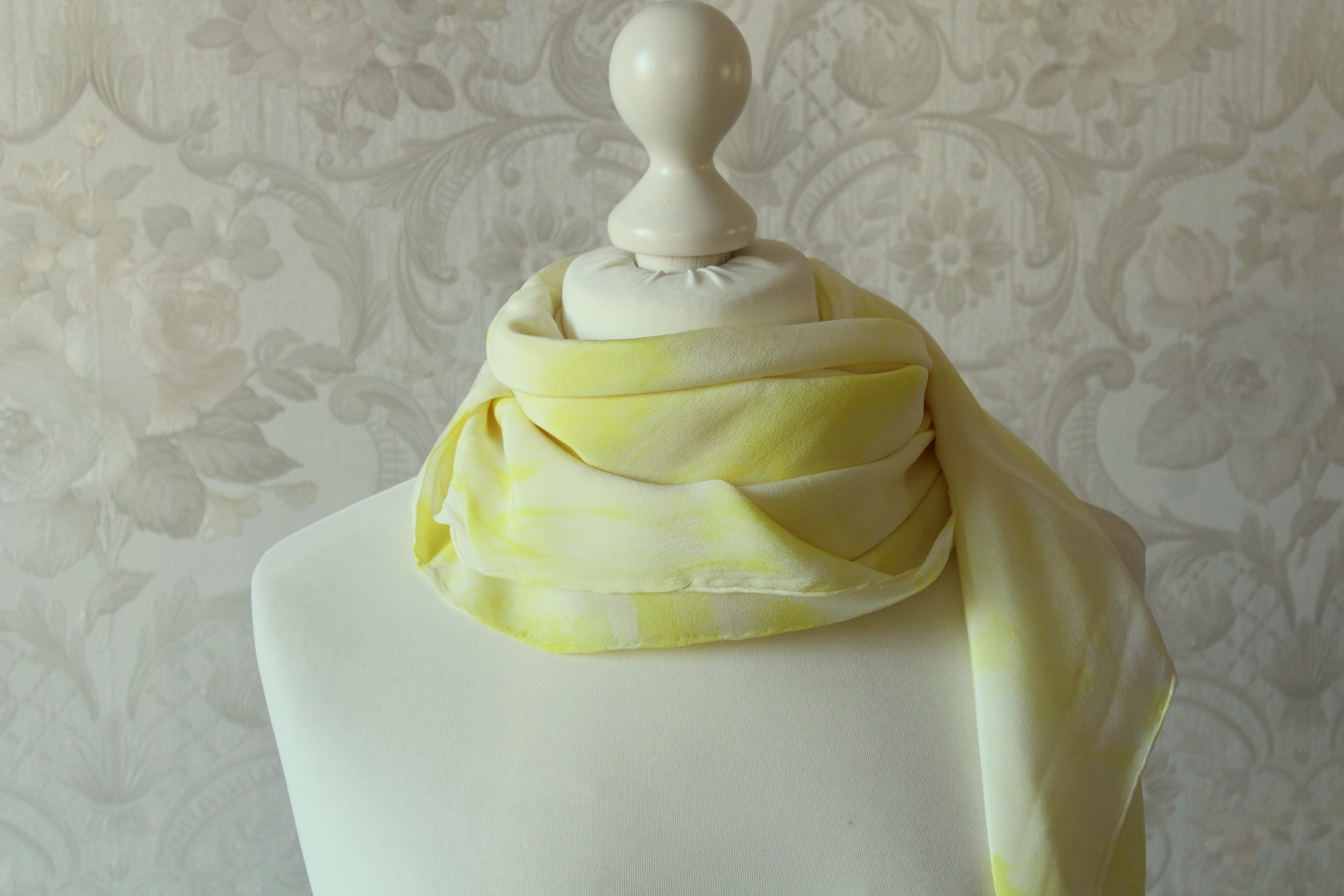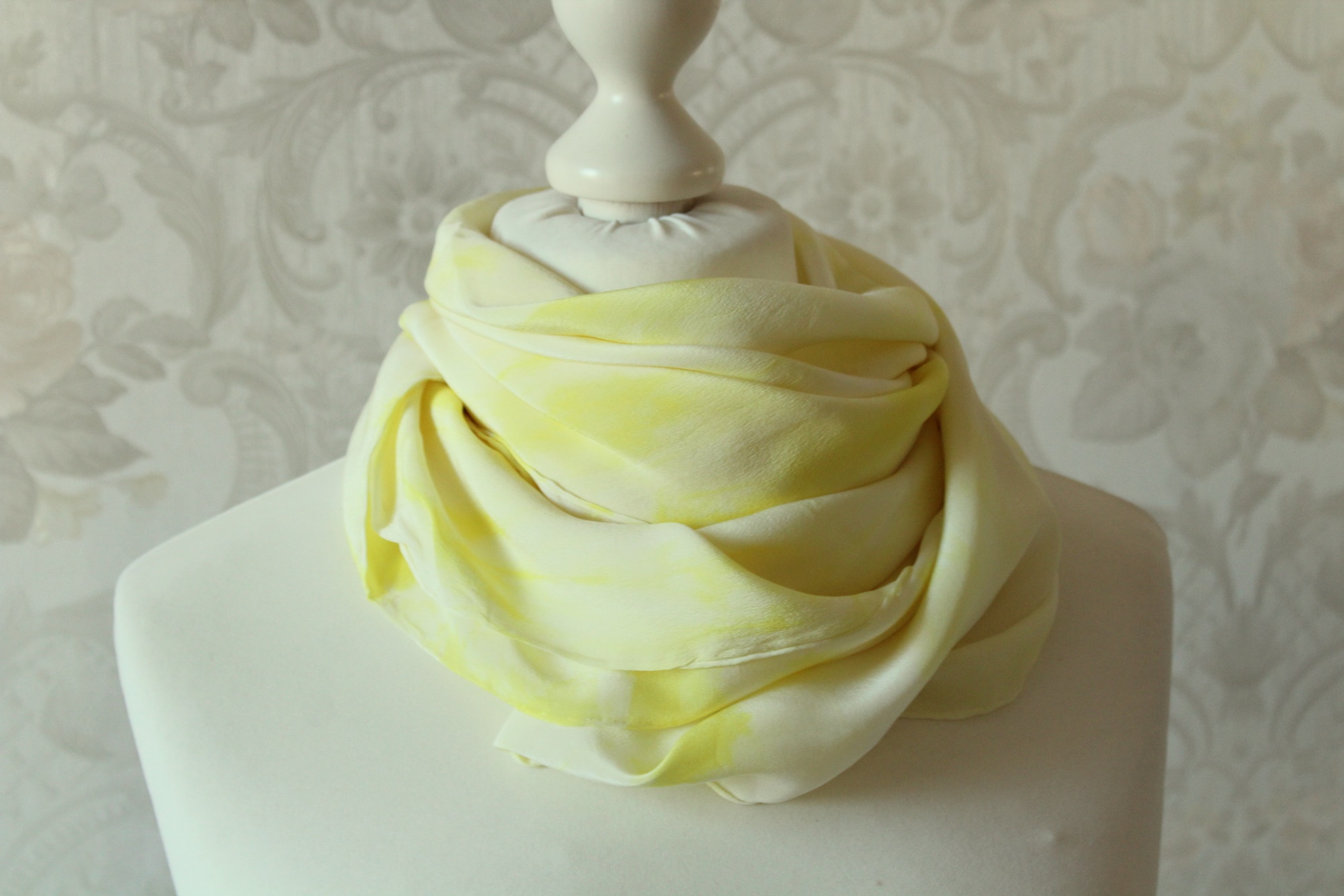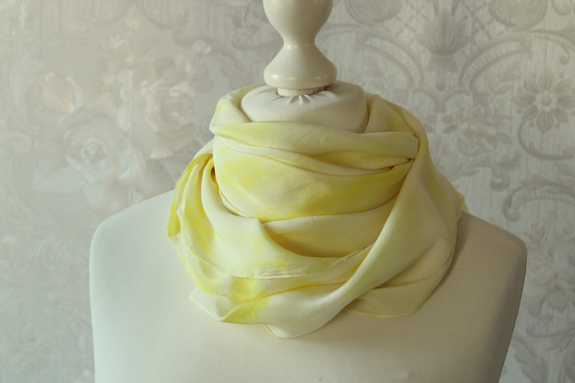 Zitrusgelb ist die Farbe von diesem Seidentuch. Das Tuch aus Seide ist in Handarbeit gefertigt und ein weiteres Stück der Sinfonie Reihe. Hellgelbe Farbverläufe auf weißem Grund wechseln sich harmonisch ab. Die Farbverläufe sind streifenförmig angelegt. Die Seidenart ist eine stabile Crepe de Chine Seide. Diese ist etwas dicker als die übliche Ponge Seide und hat eine leicht strukturierte Oberfläche. Dies hat den Vorteil, dass die Seide nicht so schnell knittert und nicht zwingend gebügelt werden muss.