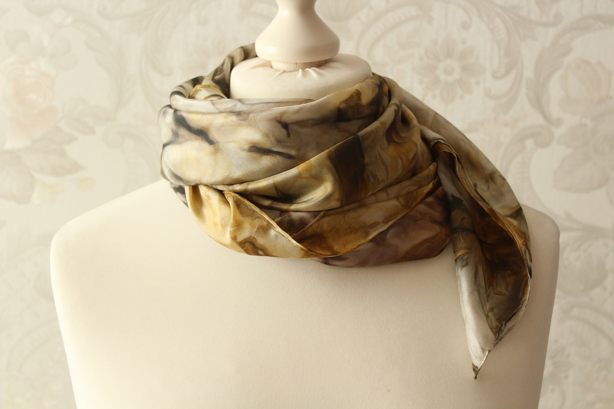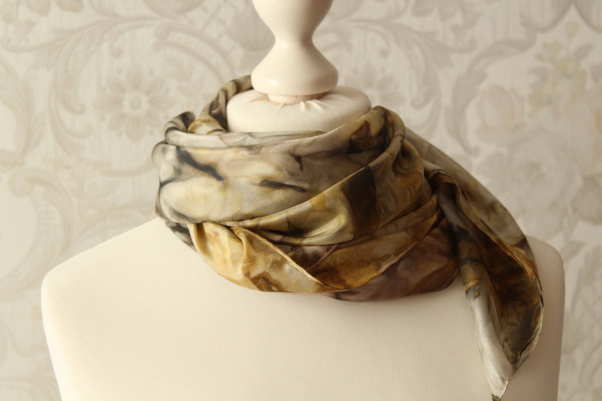 Dieses große Seidentuch ist in beigen bis braunen Farbentönen gestaltet. Das Tuch ist ein von Hand bemaltes Seidentuch aus der Reihe Farbgeflüster. Das Tuch ist genau richtig für alle, die es nicht zu bunt mögen.