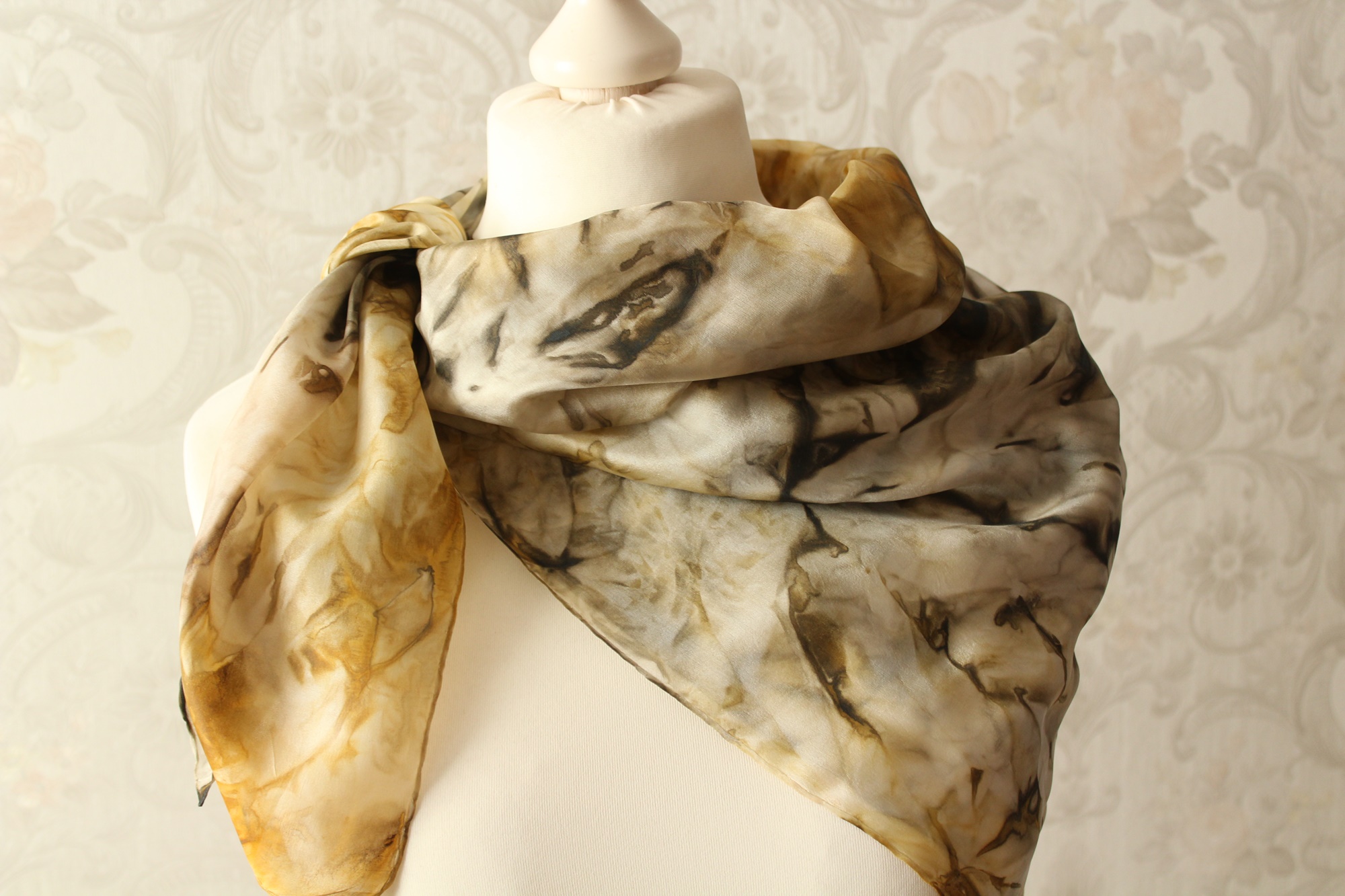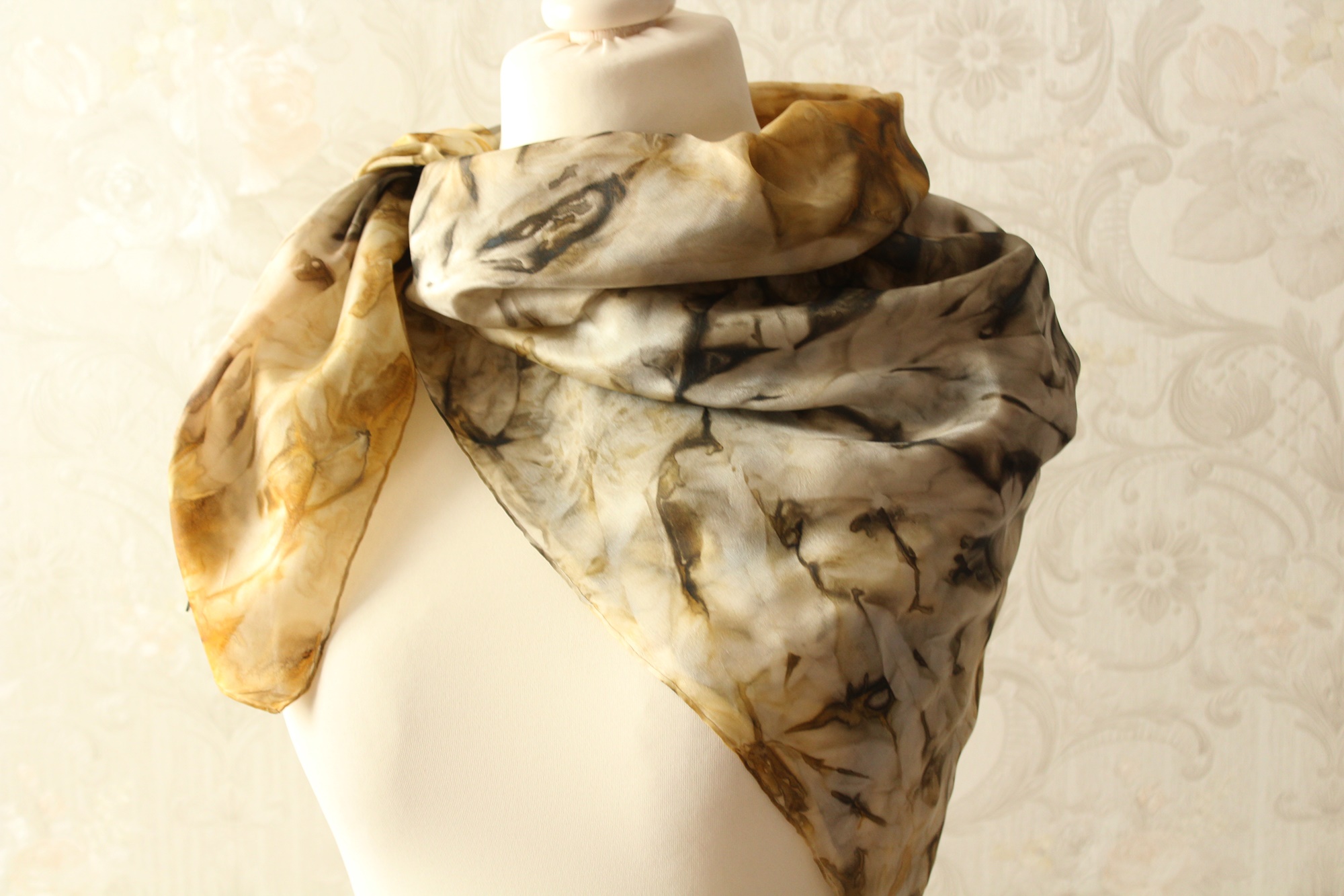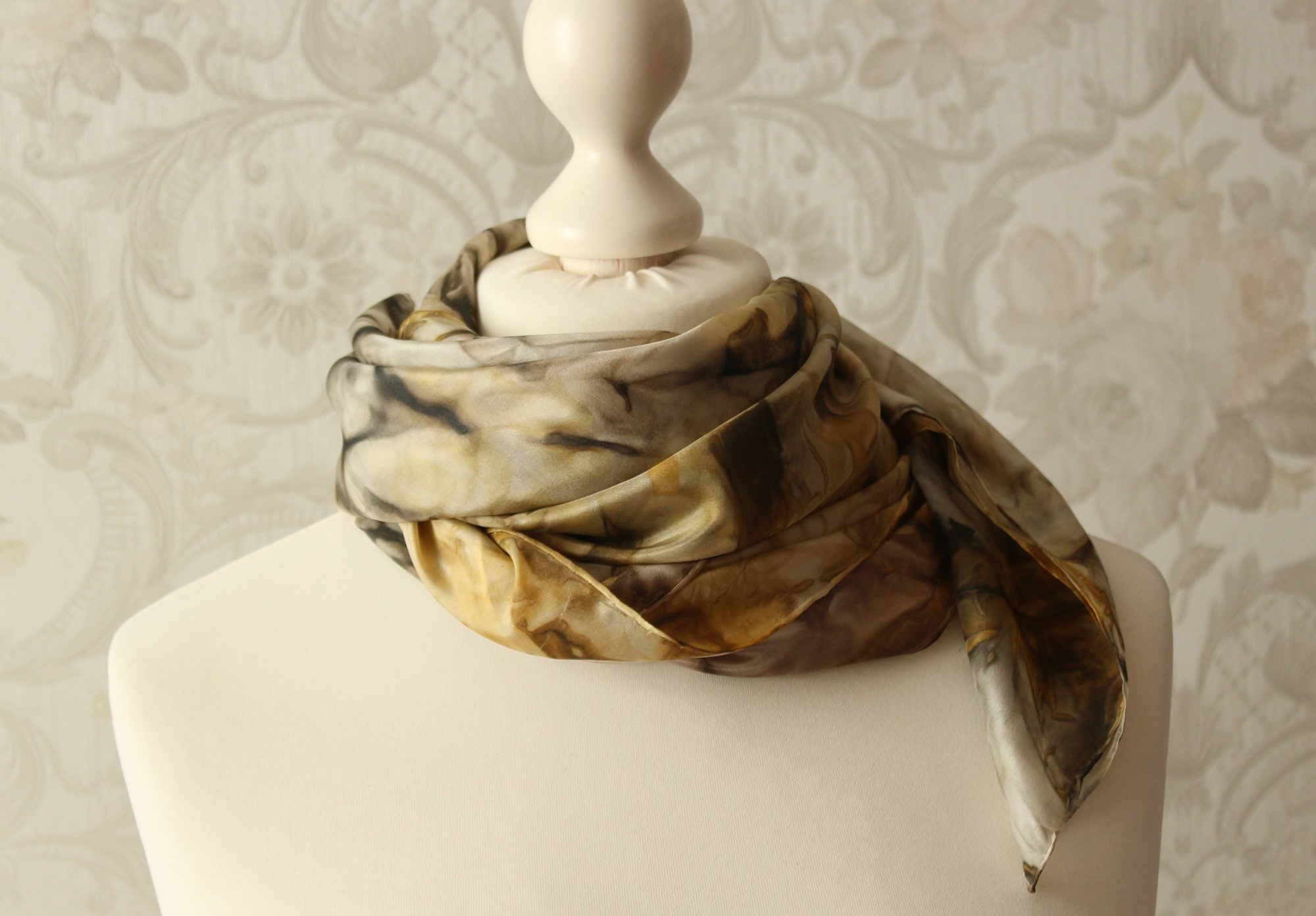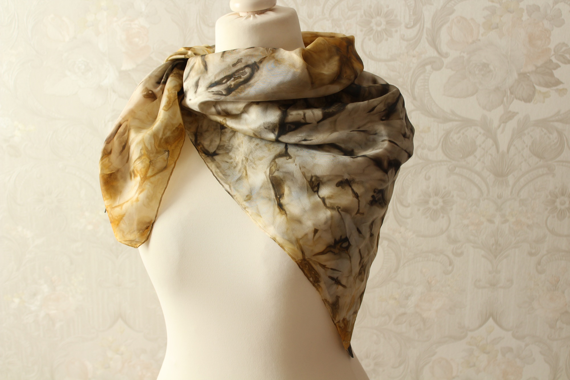 Das Seidentuch ist waschbar, ich würde Handwäsche empfehlen. Feucht bügeln. Ich habe das Tuch auch schon einmal vorgewaschen, damit keine überschüssigen Farbreste der Seide anhaften.