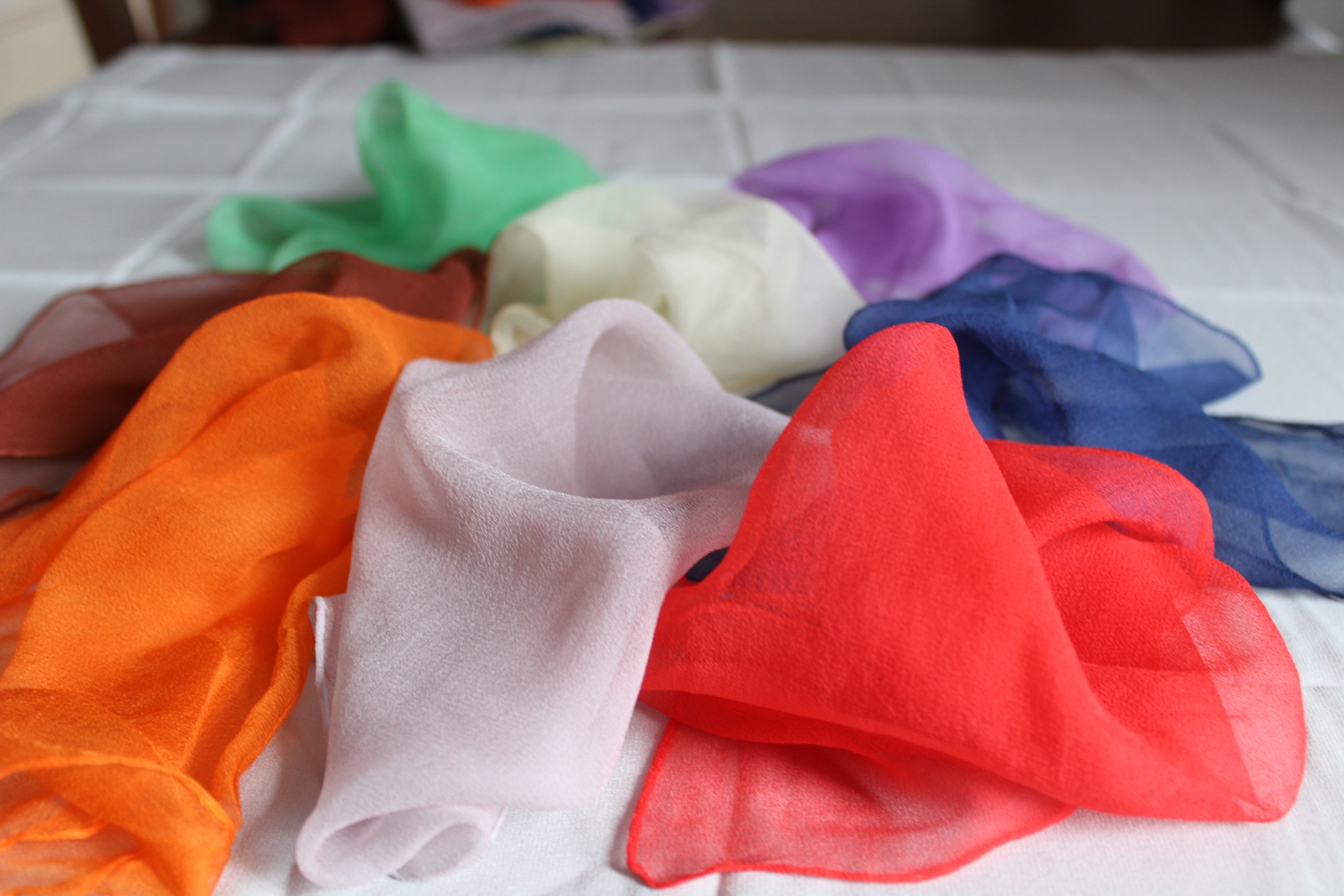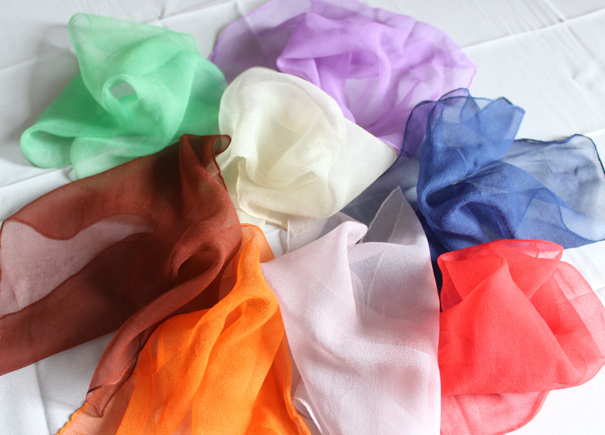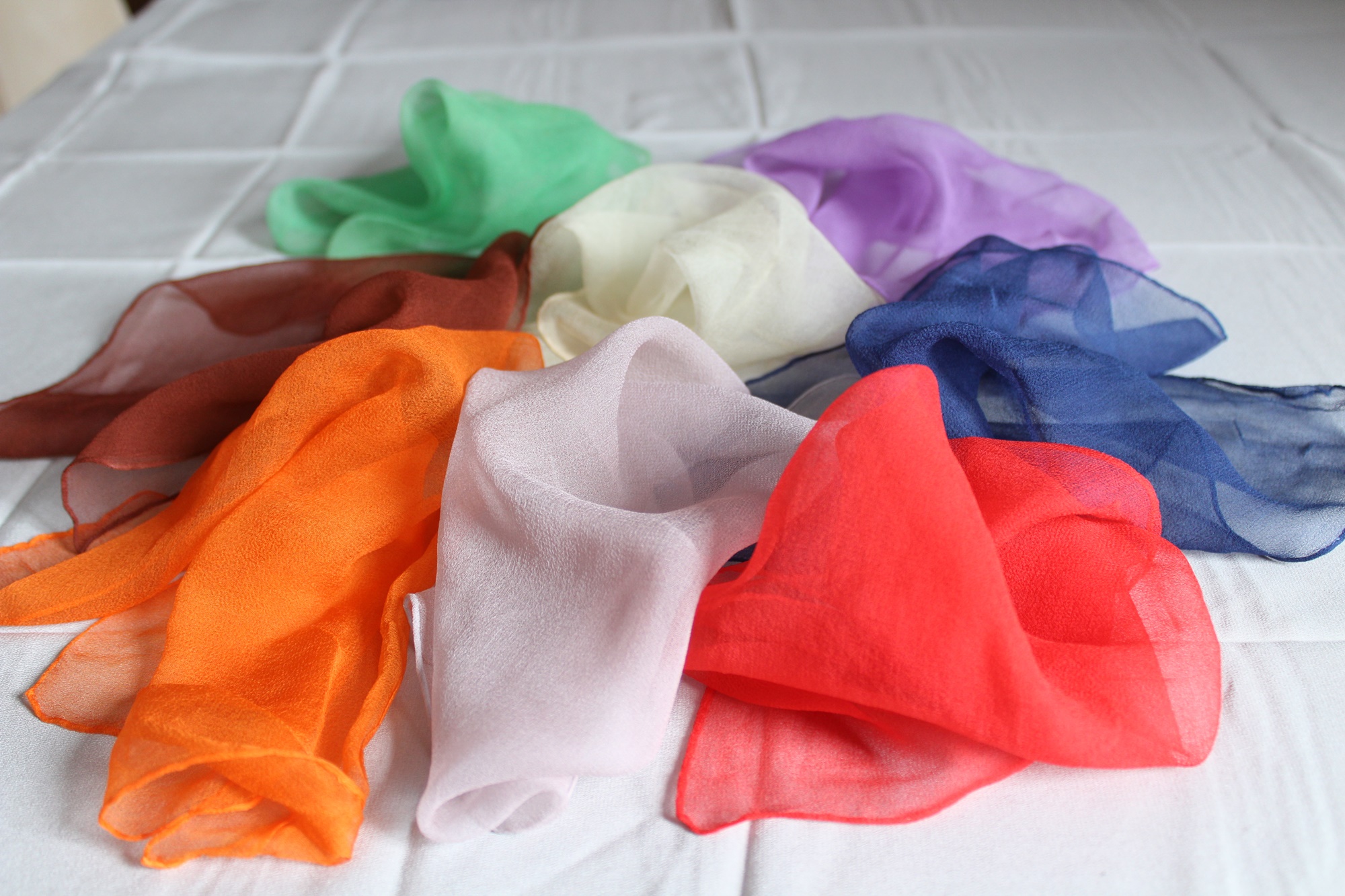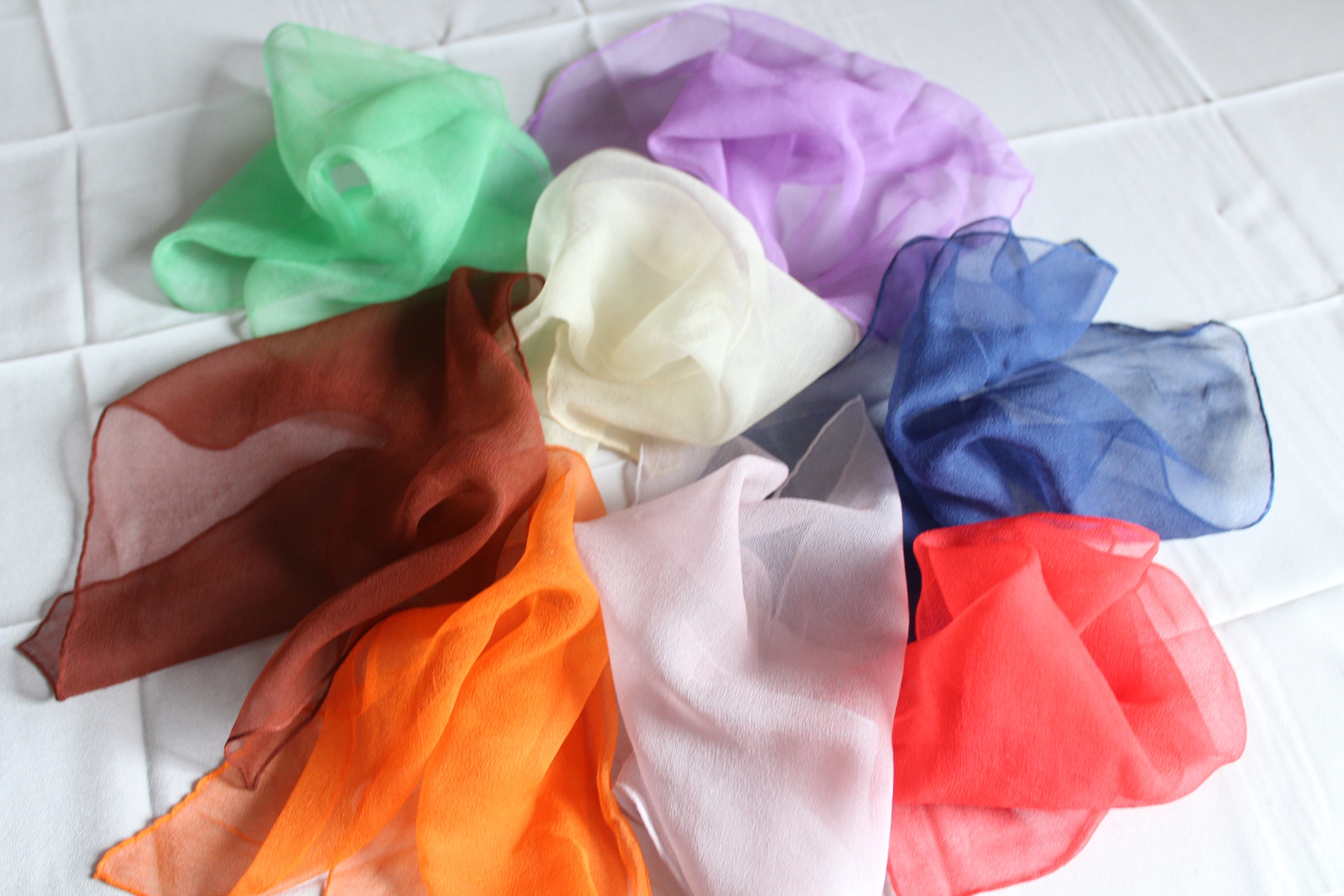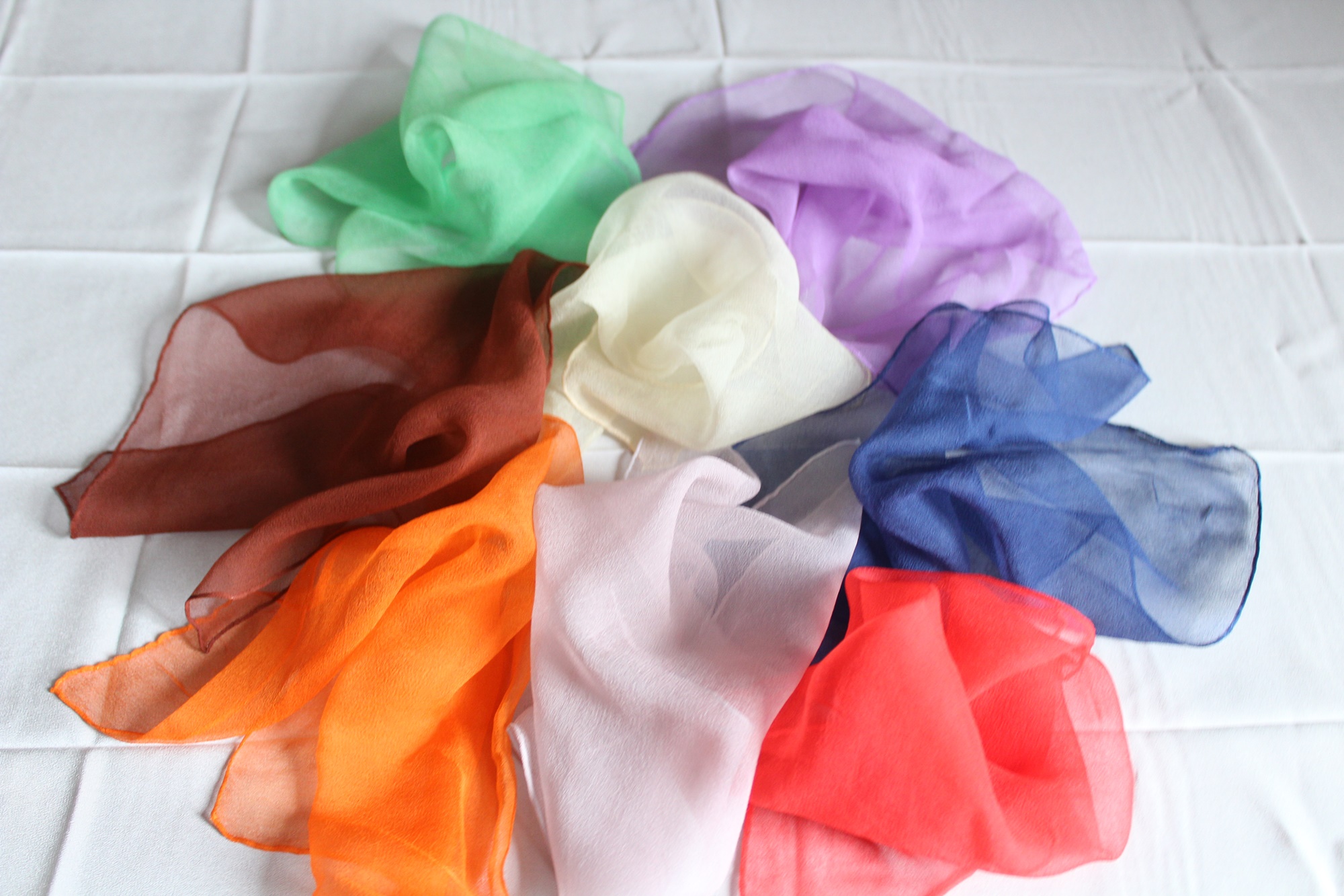 Acht bunte Tücher zum Spielen, Fühlen und Lernen, kleine Spieltücher als Set, Mini Seidentücher Kreativ. Hauchzart und federleicht sind die kleinen Tüchlein, denn sie sind aus Chiffon Seide. Mit diesen kleinen Seidentüchern können schon die Kleinsten erste Erfahrungen im Bereich Fühlen machen, sie können mit dem Tuch schmusen und die verschiedenen Farben betrachten. Größere Kinder benutzen diese Tüchlein für die Puppe, beim Tanzen oder zum Zaubern, als Haarband beim Verkleiden und mehr, der Kreativität sind keine Grenzen gesetzt.