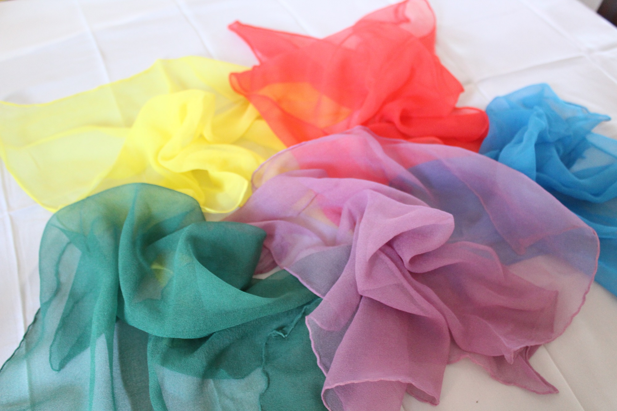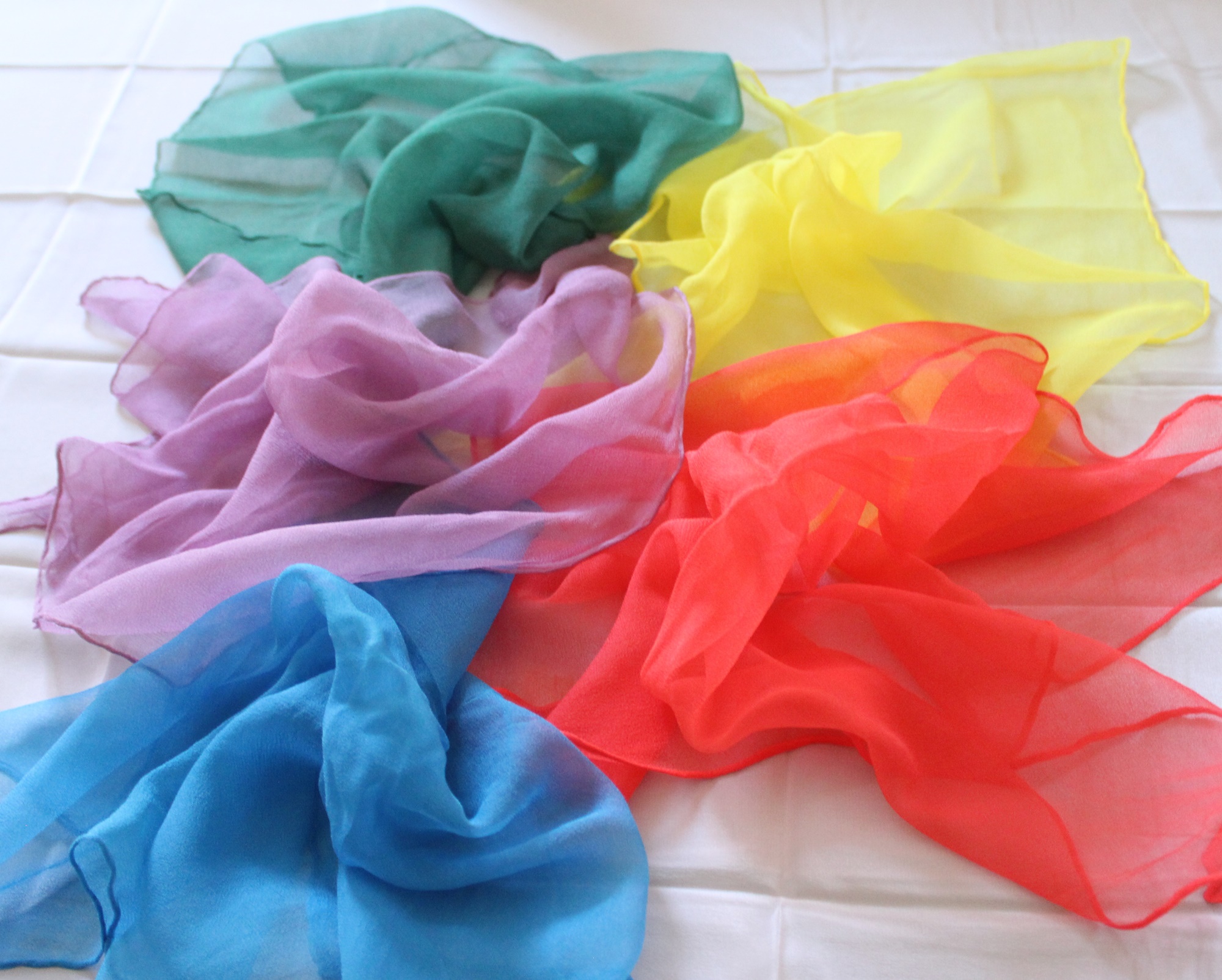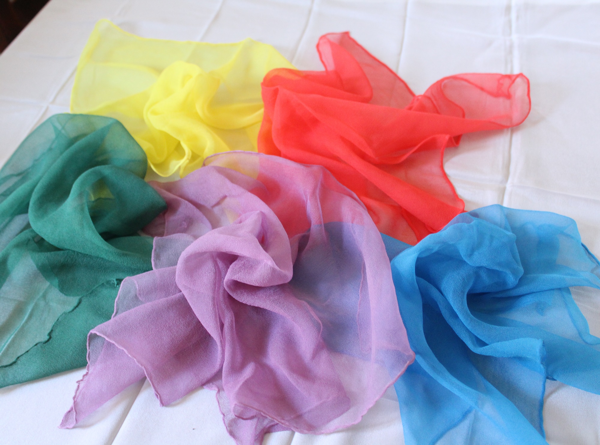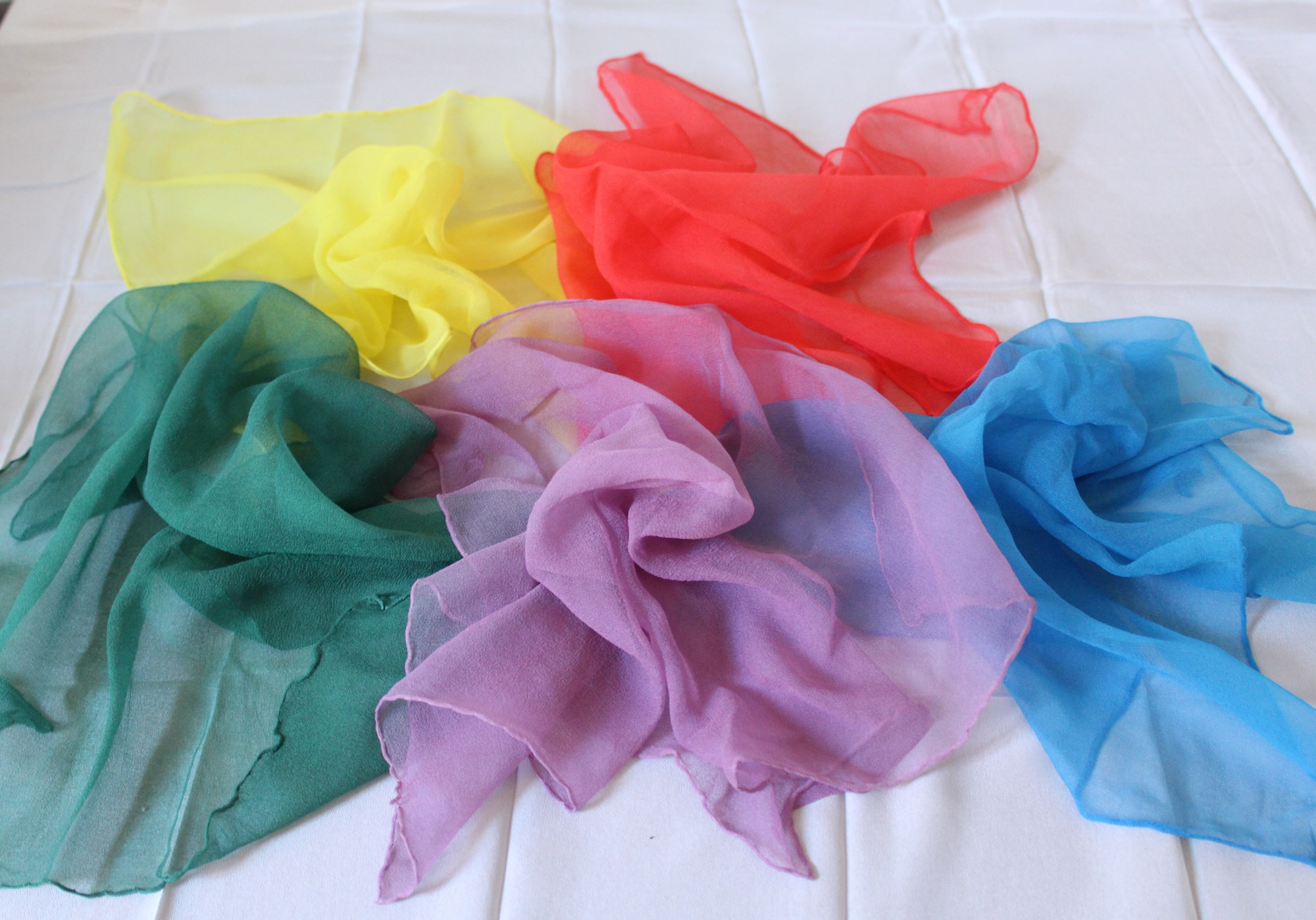 Fünf bunte Tücher aus Chiffon Seide zum Spielen, Fühlen und Lernen, Spieltücher mit 45 cm Größe, Seidentücher Set Kreativ. Hauchzart und federleicht sind die Tücher. Mit diesen Seidentüchern können schon die Kleinsten erste Erfahrungen im Bereich Fühlen machen, sie können mit dem Tuch schmusen und die verschiedenen Farben betrachten. Größere Kinder benutzen diese Tüchlein für die Puppe, beim Tanzen oder zum Zaubern, als Haarband beim Verkleiden und mehr, der Kreativität sind keine Grenzen gesetzt.