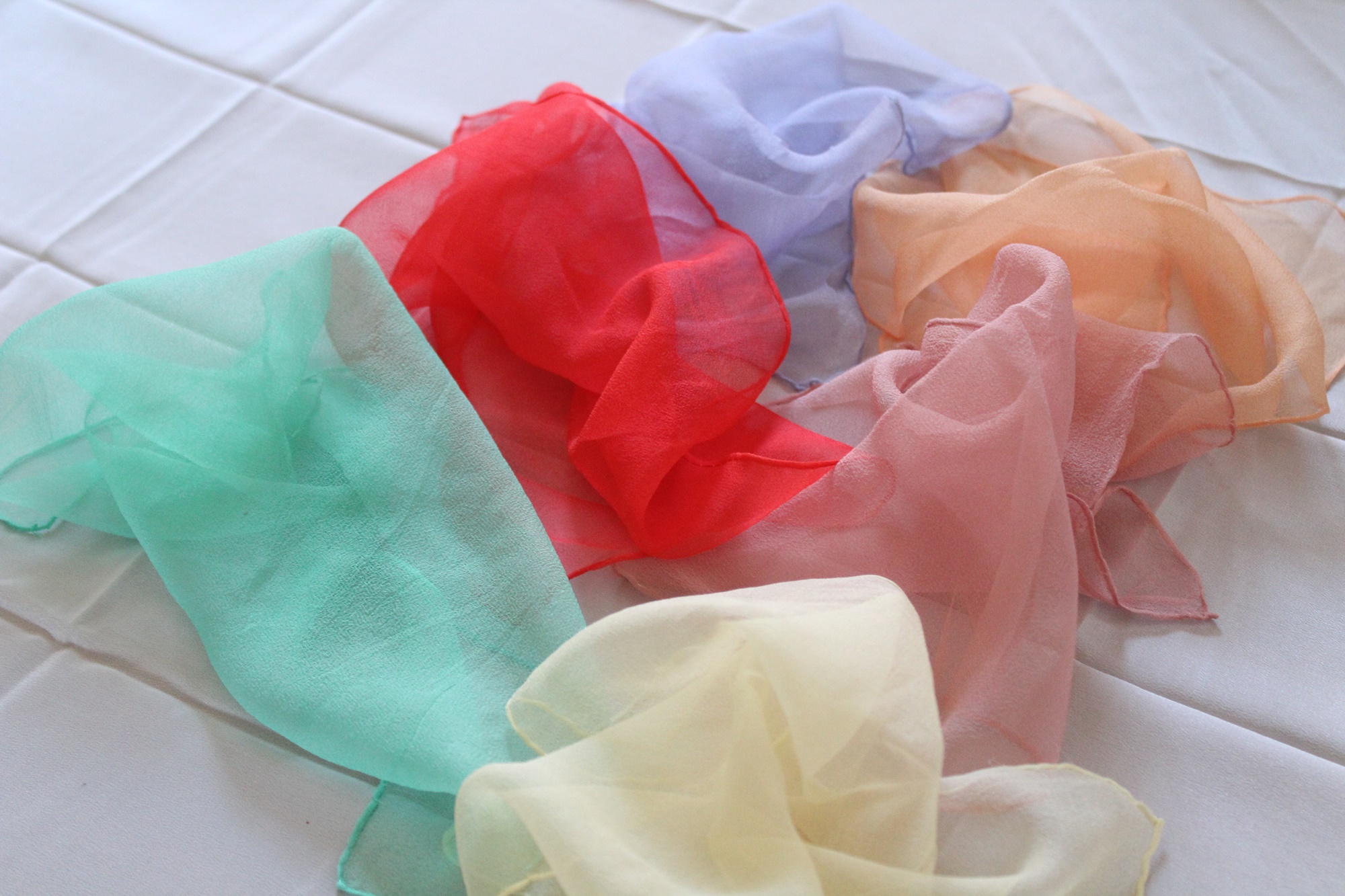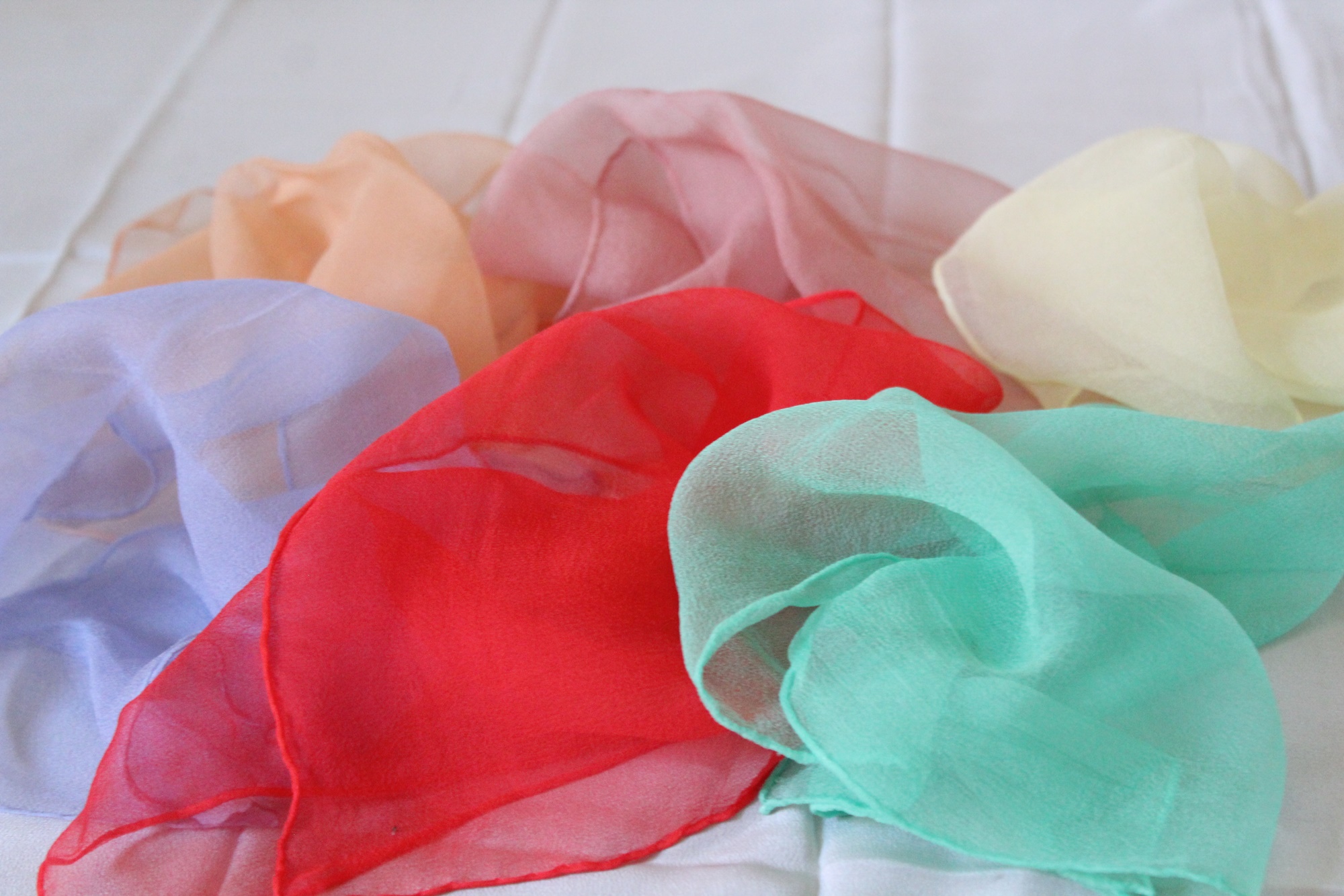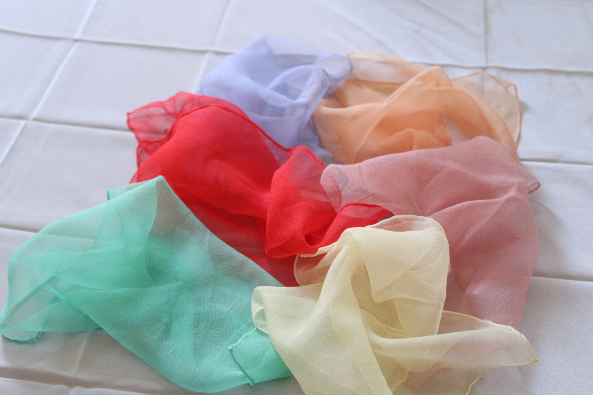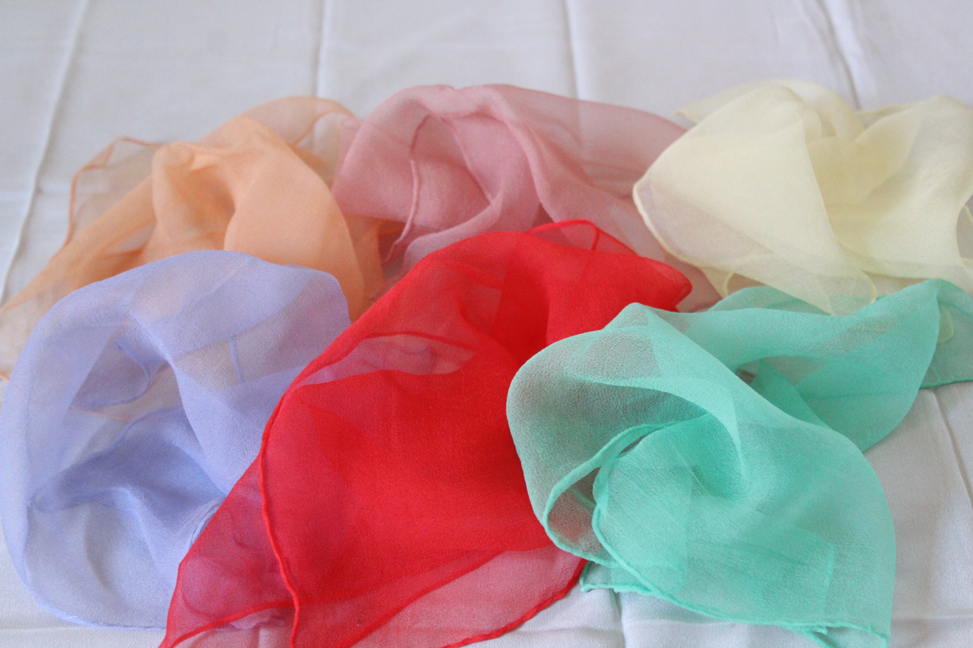 Sechs bunte Tücher aus Chiffon Seide zum Spielen, Fühlen und Lernen, kleine Spieltücher als Set, Mini Seidentücher Kreativ. Hauchzart und federleicht sind die kleinen Tüchlein. Mit diesen kleinen Seidentüchern können schon die Kleinsten erste Erfahrungen im Bereich Fühlen machen, sie können mit dem Tuch schmusen und die verschiedenen Farben betrachten. Größere Kinder benutzen diese Tüchlein für die Puppe, beim Tanzen oder zum Zaubern, als Haarband beim Verkleiden und mehr, der Kreativität sind keine Grenzen gesetzt.