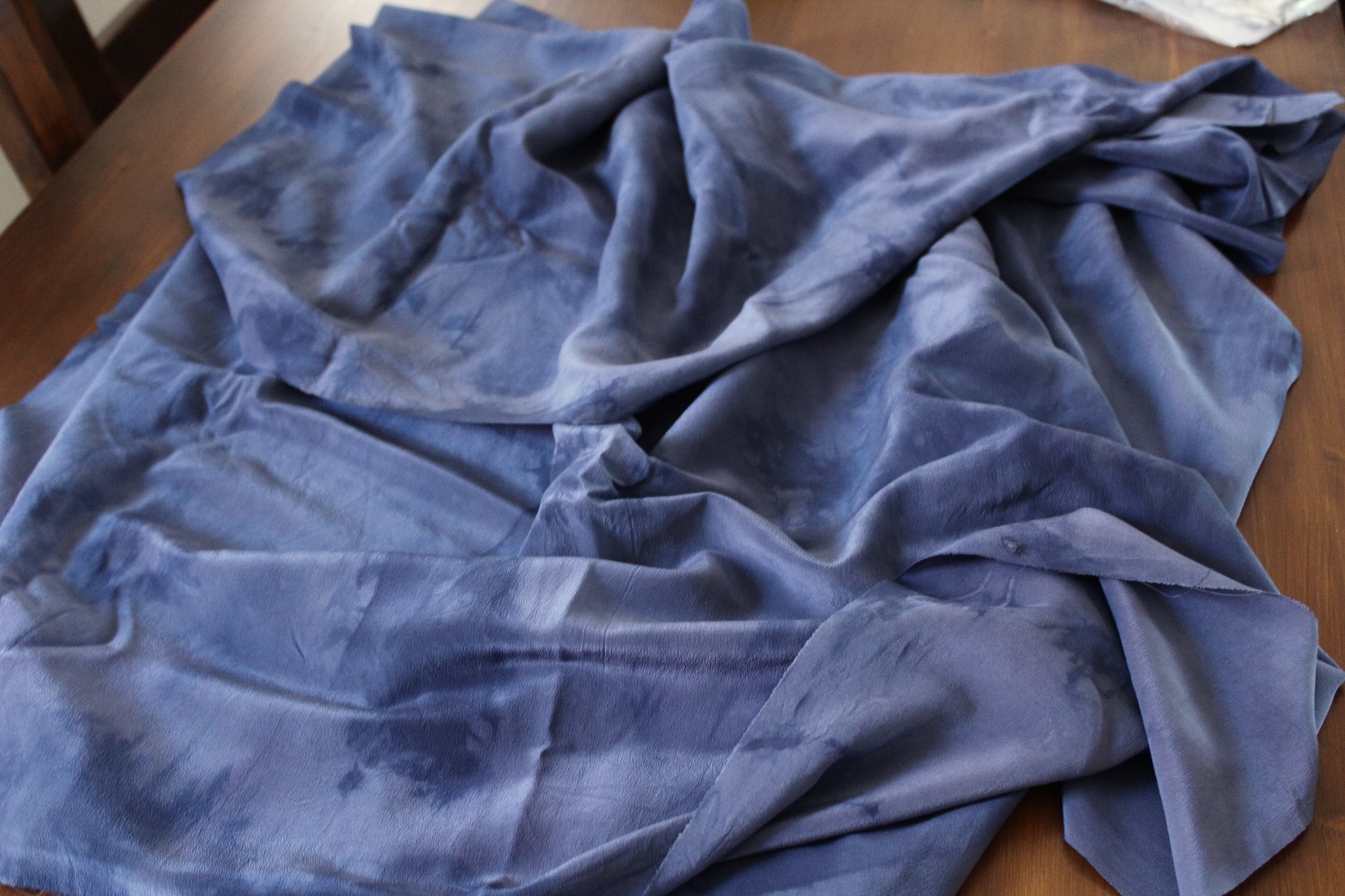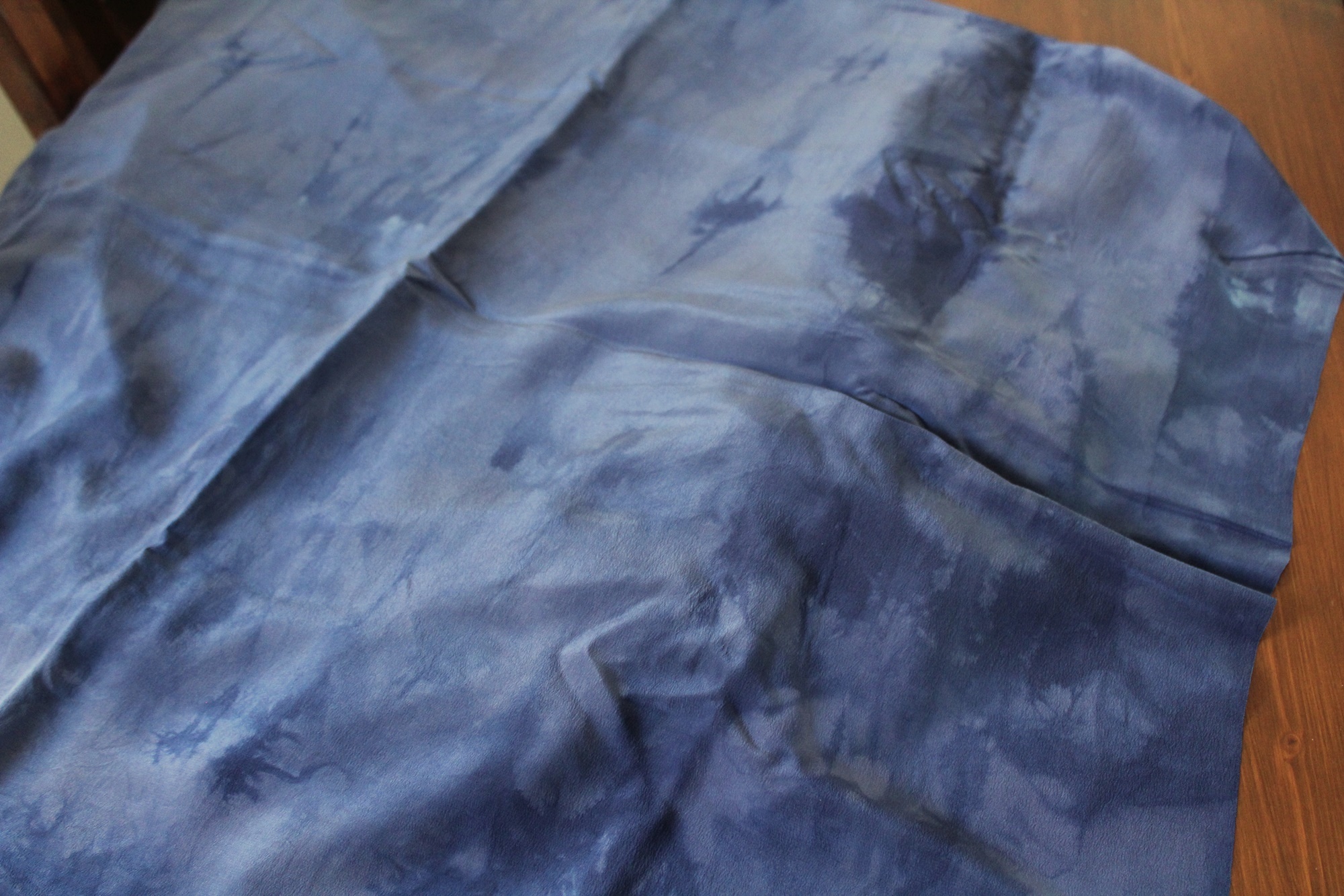 2,60 m Seide handgefärbt, ein besonderer Stoff zur kreativen Weiterverarbeitung. Miteinander geflüstert haben bei diesem Seidenstoff verschiedene blaue Farbtöne. Das Muster ist ein dezentes Batikmuster und entsteht beim Malen eher zufällig. Somit gibt es diesen Stoff genau so nicht noch einmal.