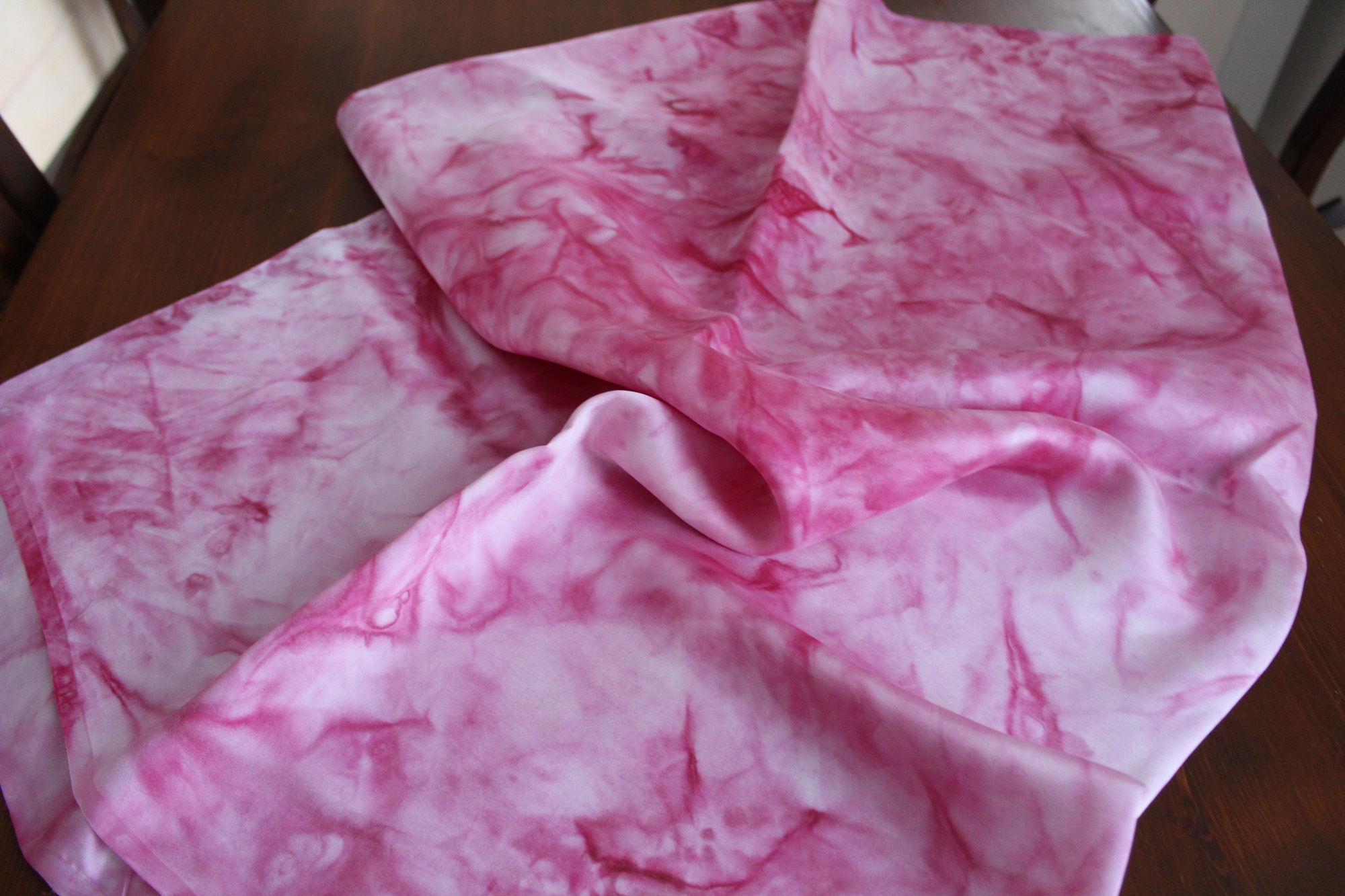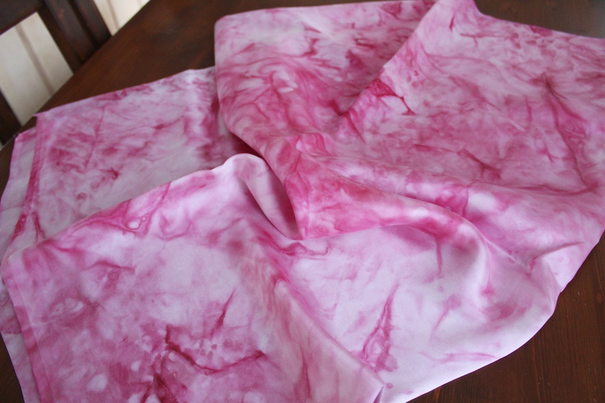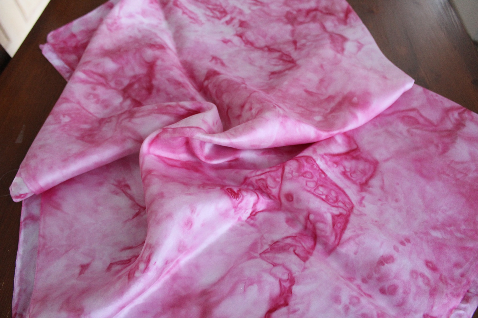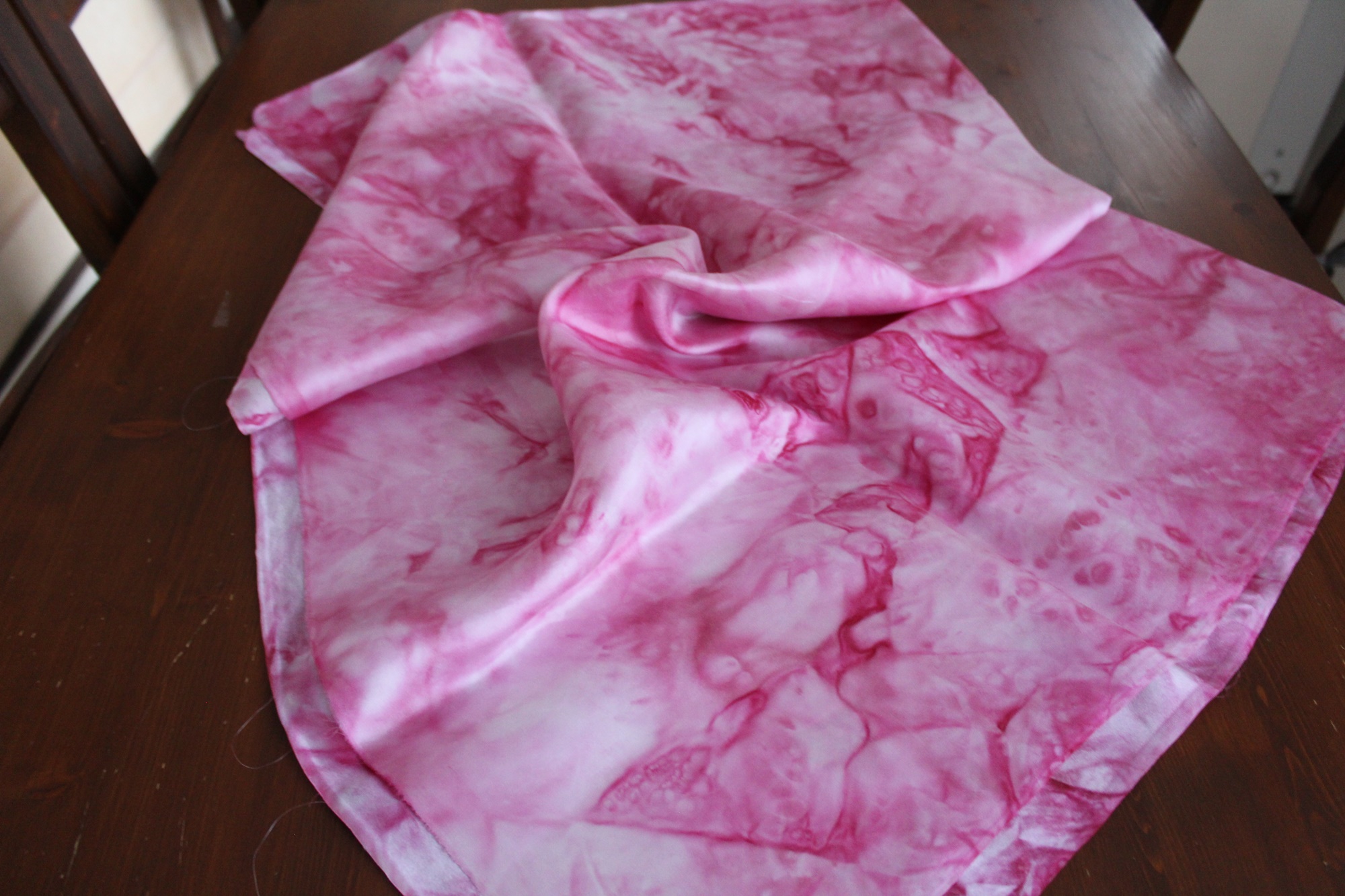 Handbemalte Seide, ein besonderer Stoff zur kreativen Weiterverarbeitung. Die Farben hier sind Rosa und Pink in verschiedenen Nuancen. Die Muster sind Farbverläufe. Diese entstehen beim Malen eher zufällig. Somit ist jedes Stück Stoff ein Unikat. Die Seidenart ist eine glatte Ponge Seide.