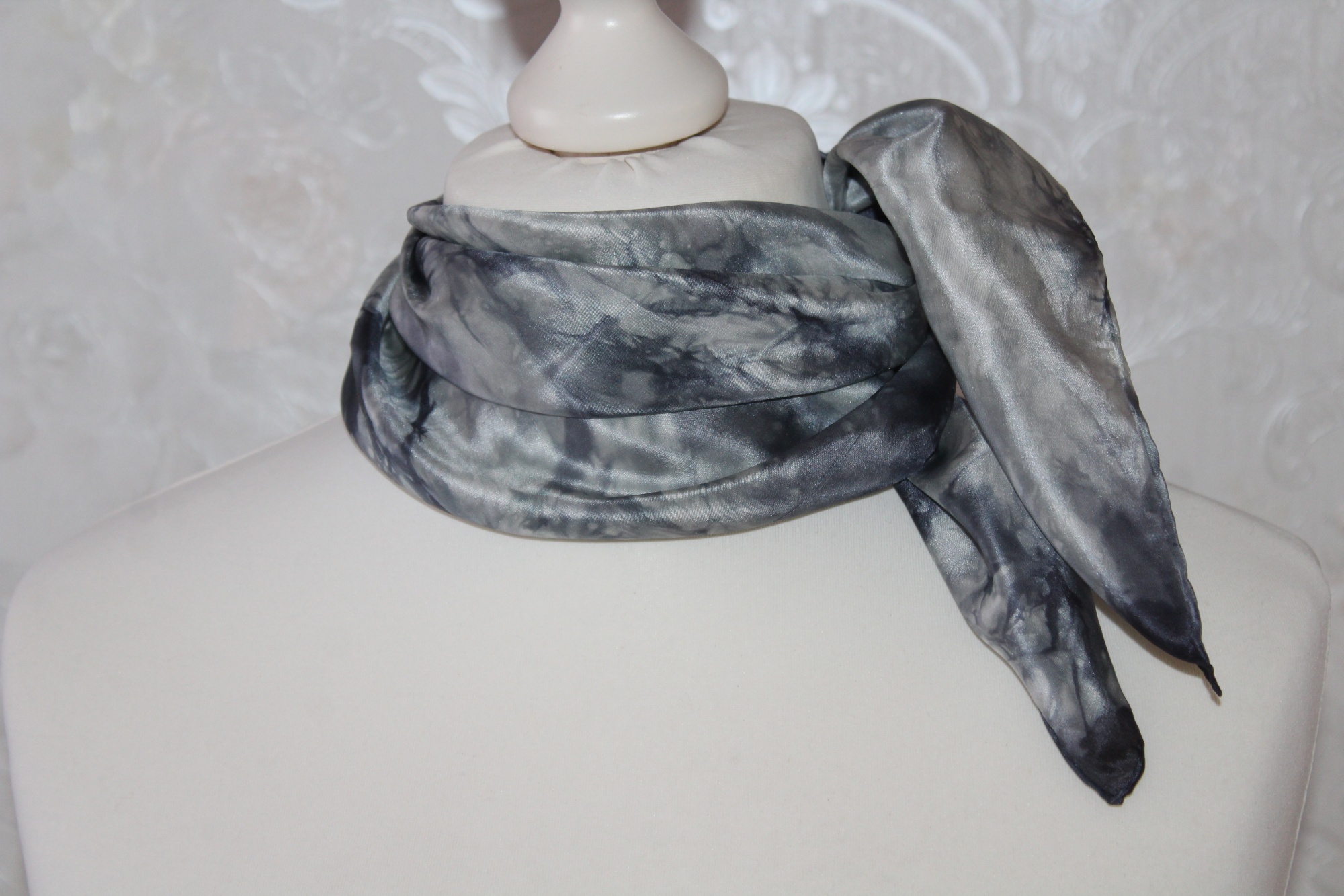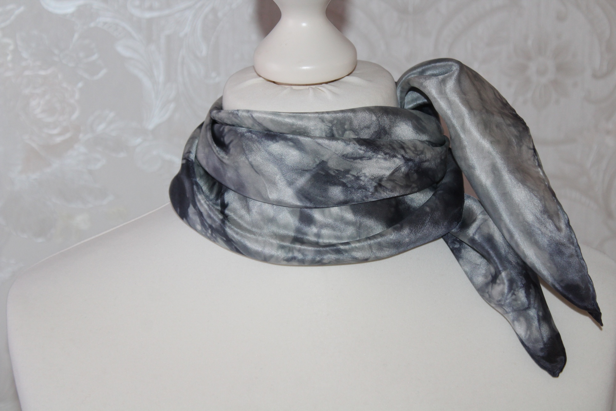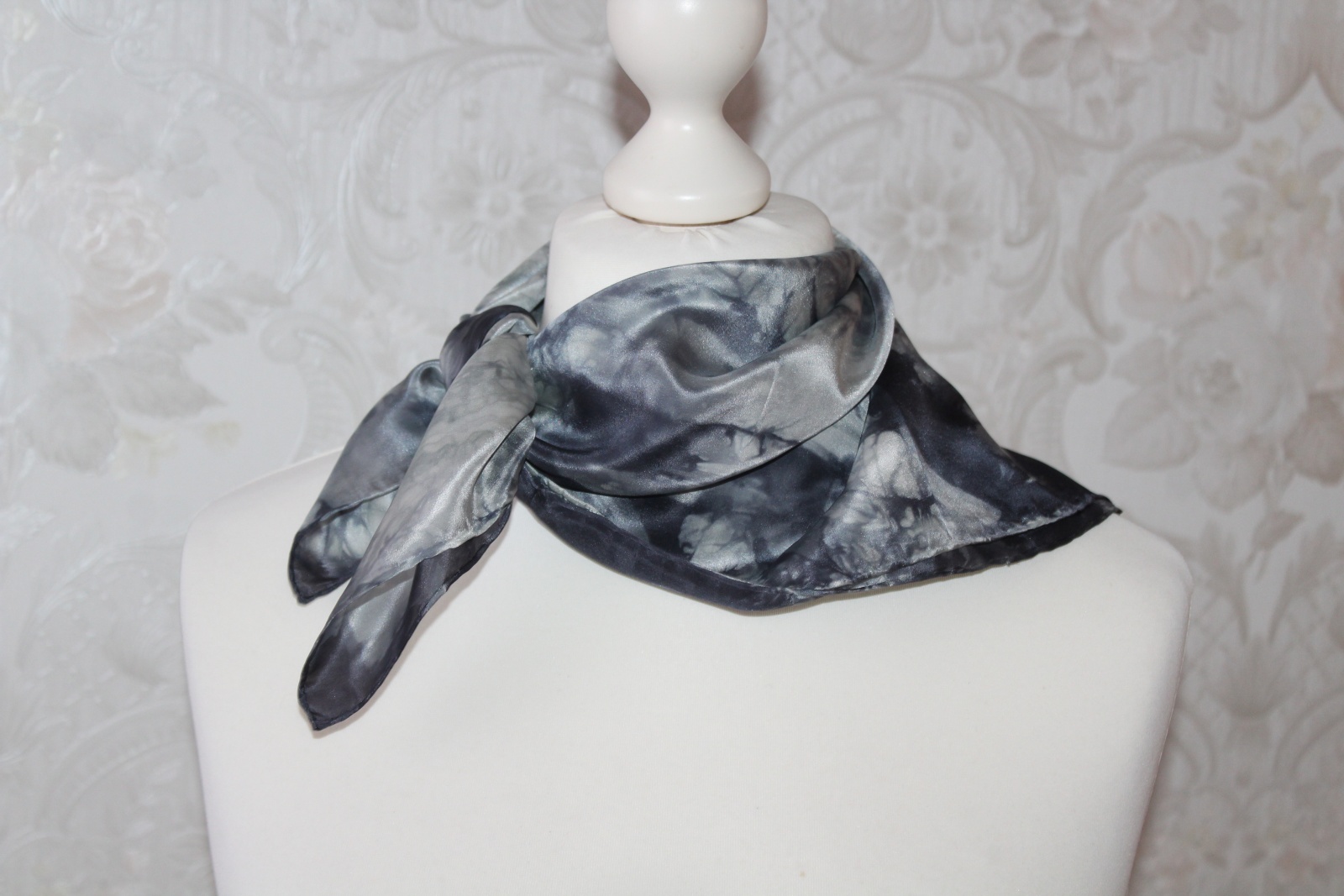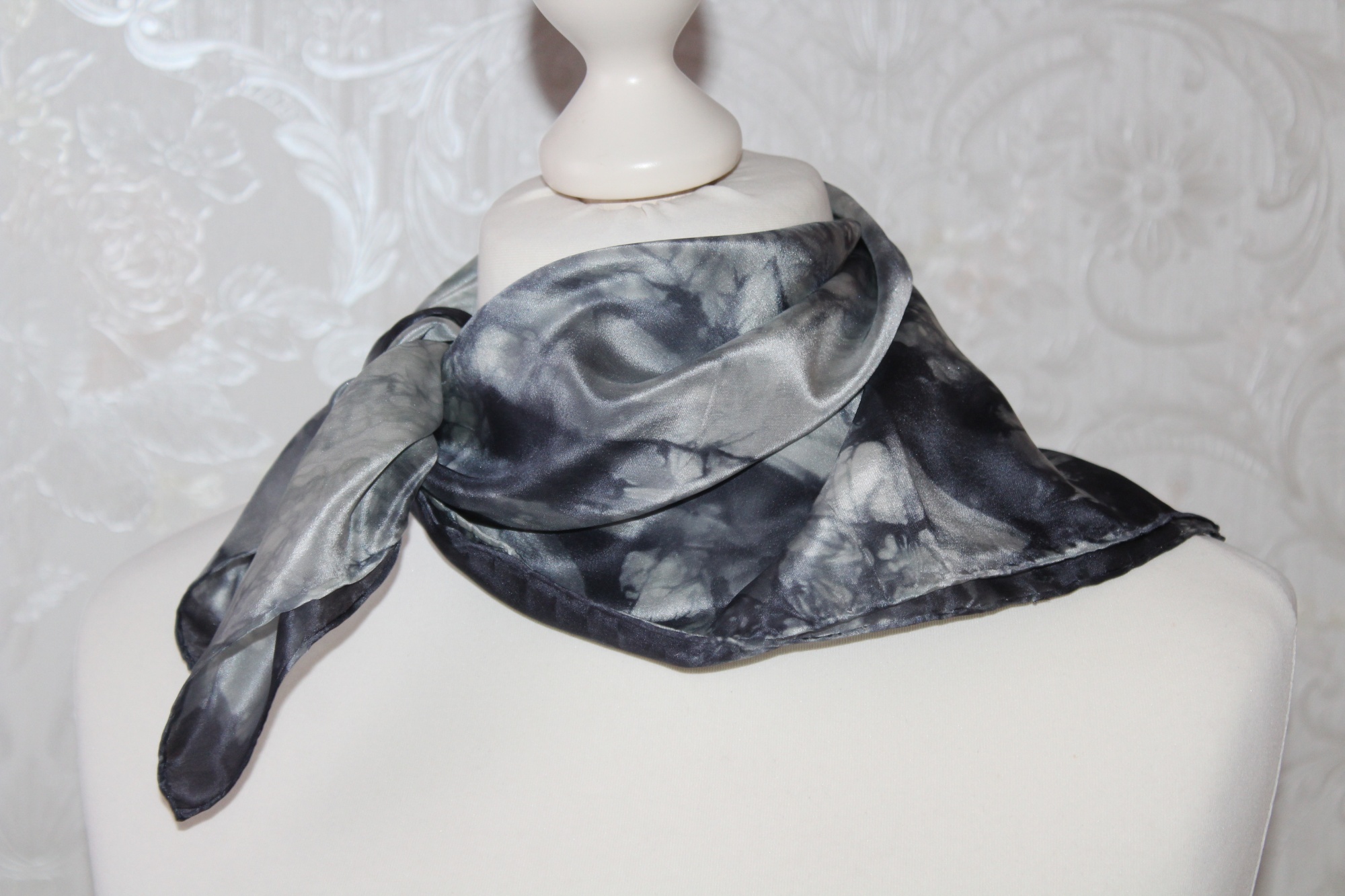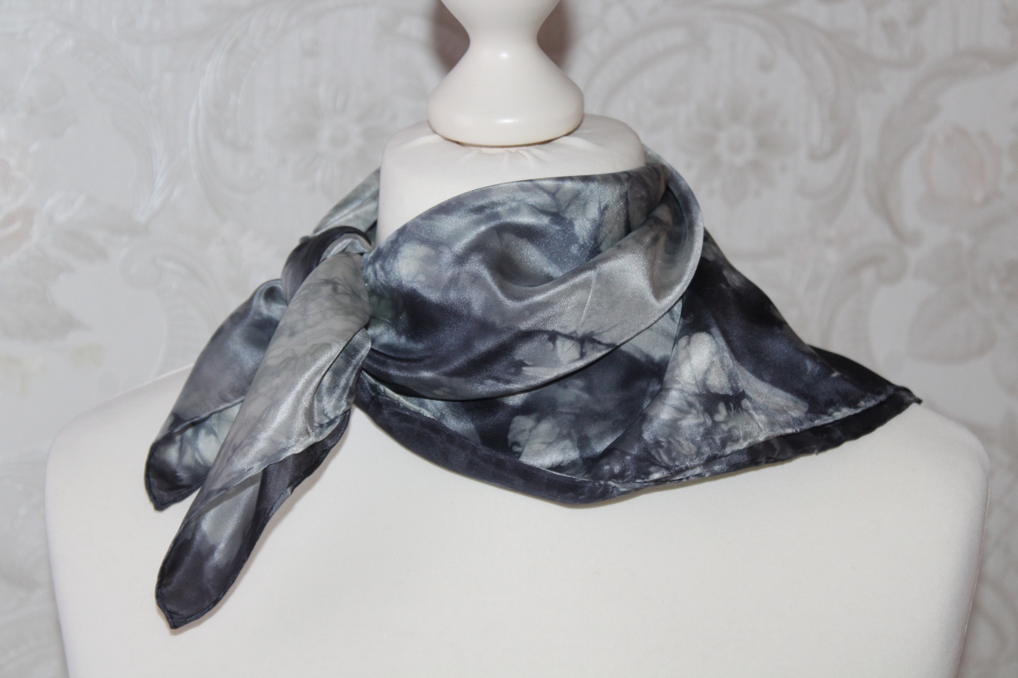 Kleines schwarz grau gemustertes Seidentuch als Nickituch von Hand coloriert. Die elegante Farbe zeichnet dieses kleine Seidentuch aus.