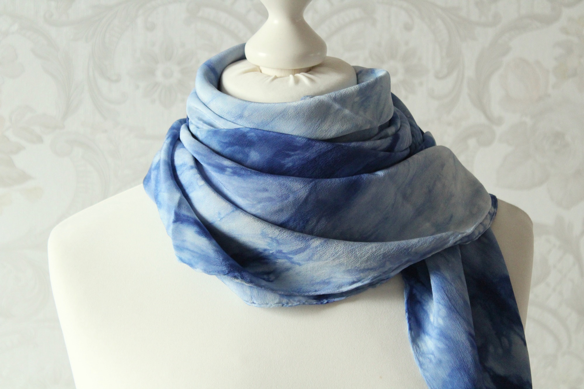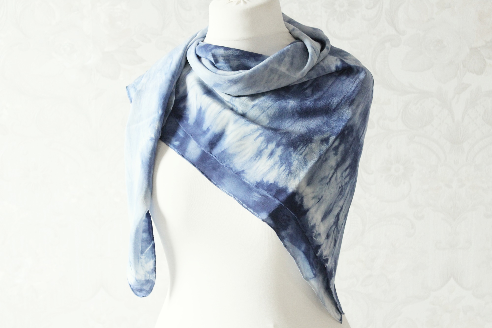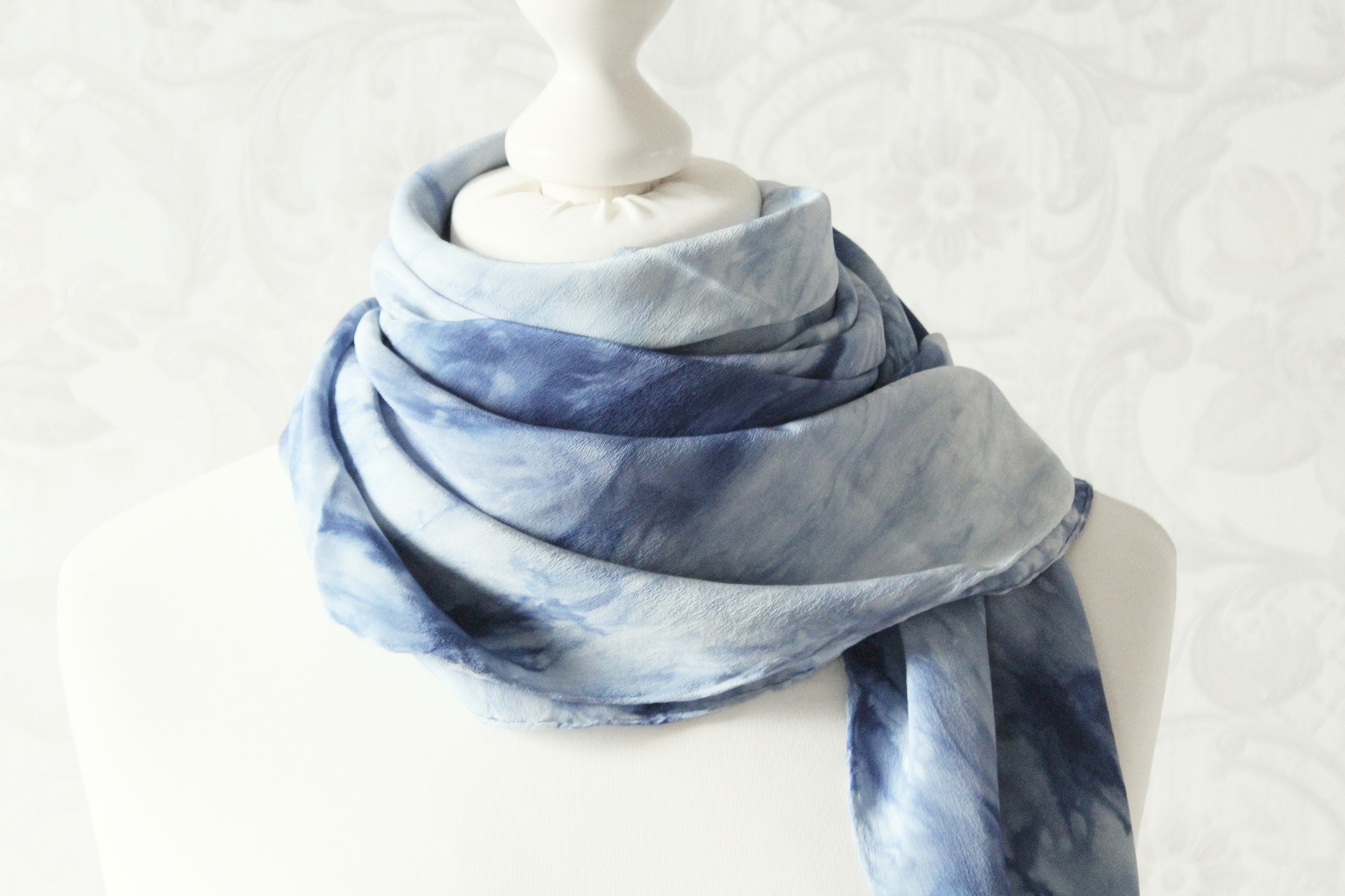 Seidentuch Sinfonie in blau, ein handbemaltes Tuch, ein Einzelstück. Bei diesem großen Seidentuch (100 x 100 cm) flüstern verschieden Farben Blau auf weißem Grund miteinander. Durch die drei Arbeitsschritte Bemalen der Seide, Abbinden und Färben entstehen diese Muster eher zufällig. Somit gibt es dieses Tuch genauso nicht noch einmal.