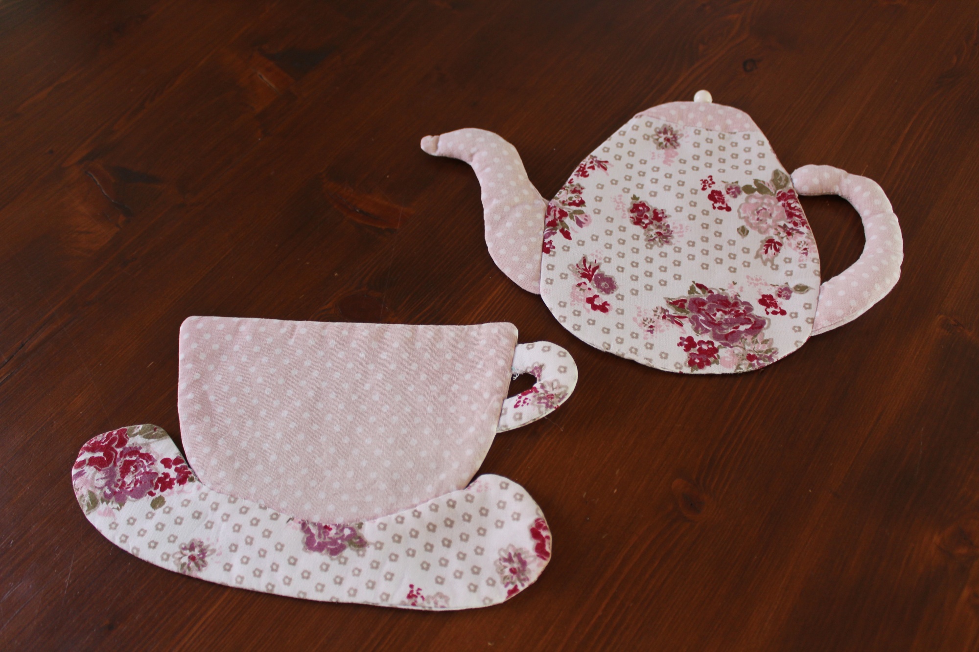 Die Untersetzer haben eine Größe von 21 x 13 cm und 25 x 17 cm. Die Farben sind rosa und rot, gewählt wurden Baumwollstoffe rosa mit Pünktchen und ein hübscher Blumenstoff. Sie sind mit Fließ gefüttert, sodass sie auch gut verwendbar sind.