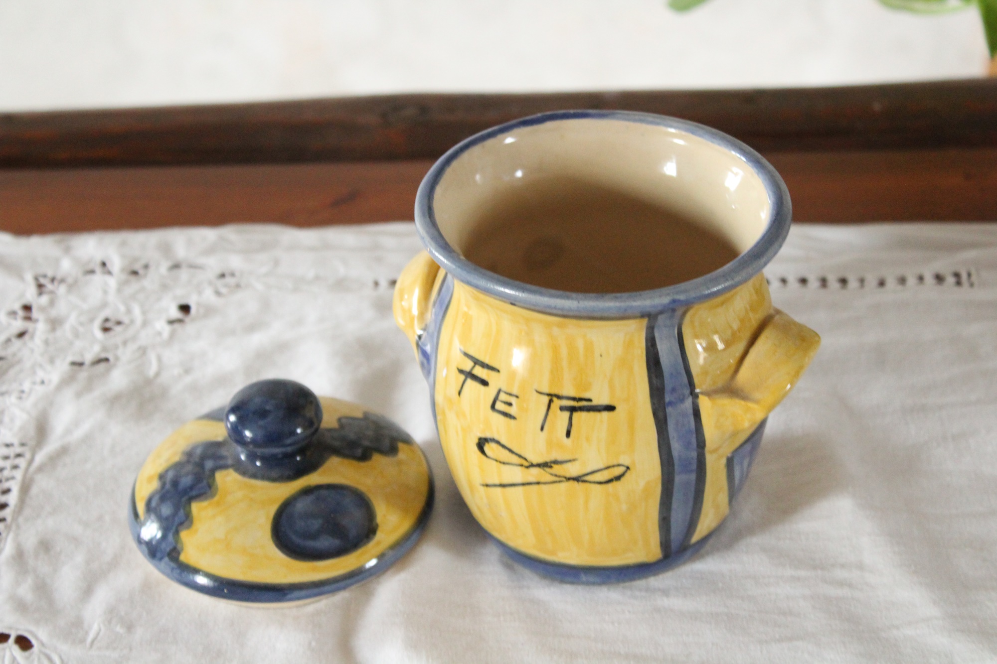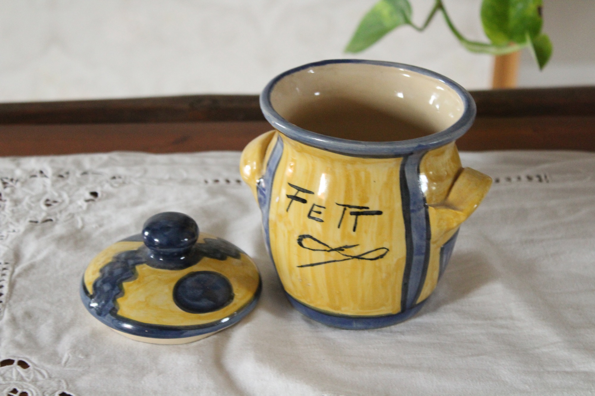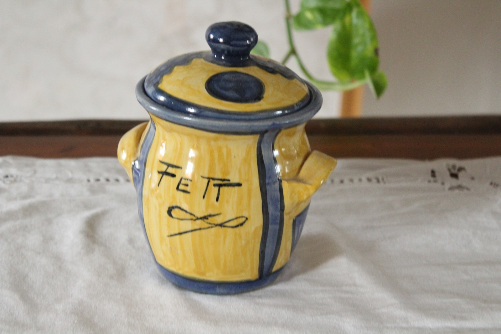 Dieser getöpferte Vorratstopf ist für Fett. Ein Tontopf aus Anne und Siggi´s Töpferei aus der Serie Mexiko. Der Fetttopf ist in den Farben Gelb und Blau von Hand bemalt und anschließend glasiert. Das Muster aus Linien, Kreisen und Zacken erinnert an ein ethnisches Motiv. Vorn hat er einen Schriftzug - Fett. Er darf in die Spülmaschine.