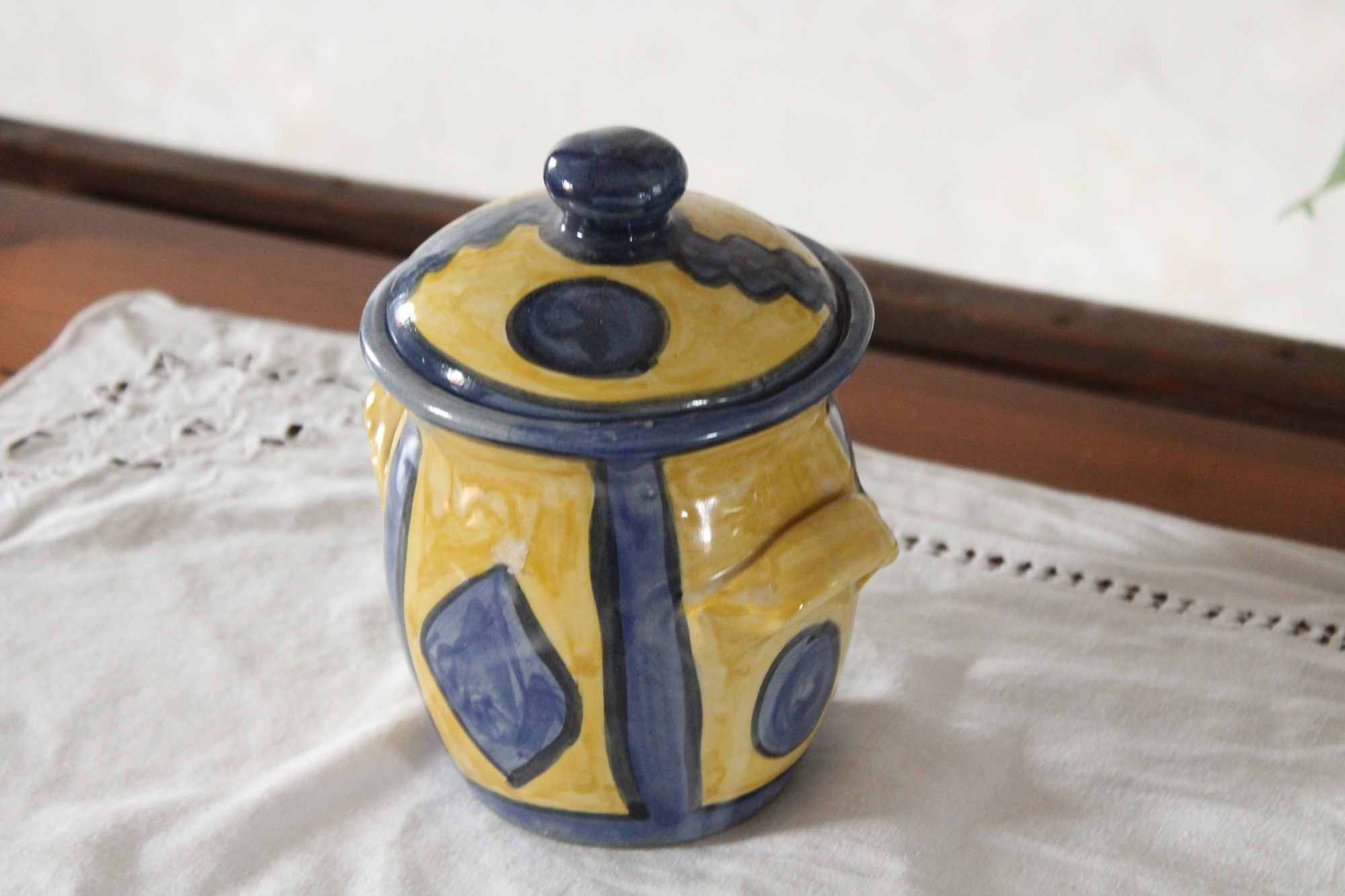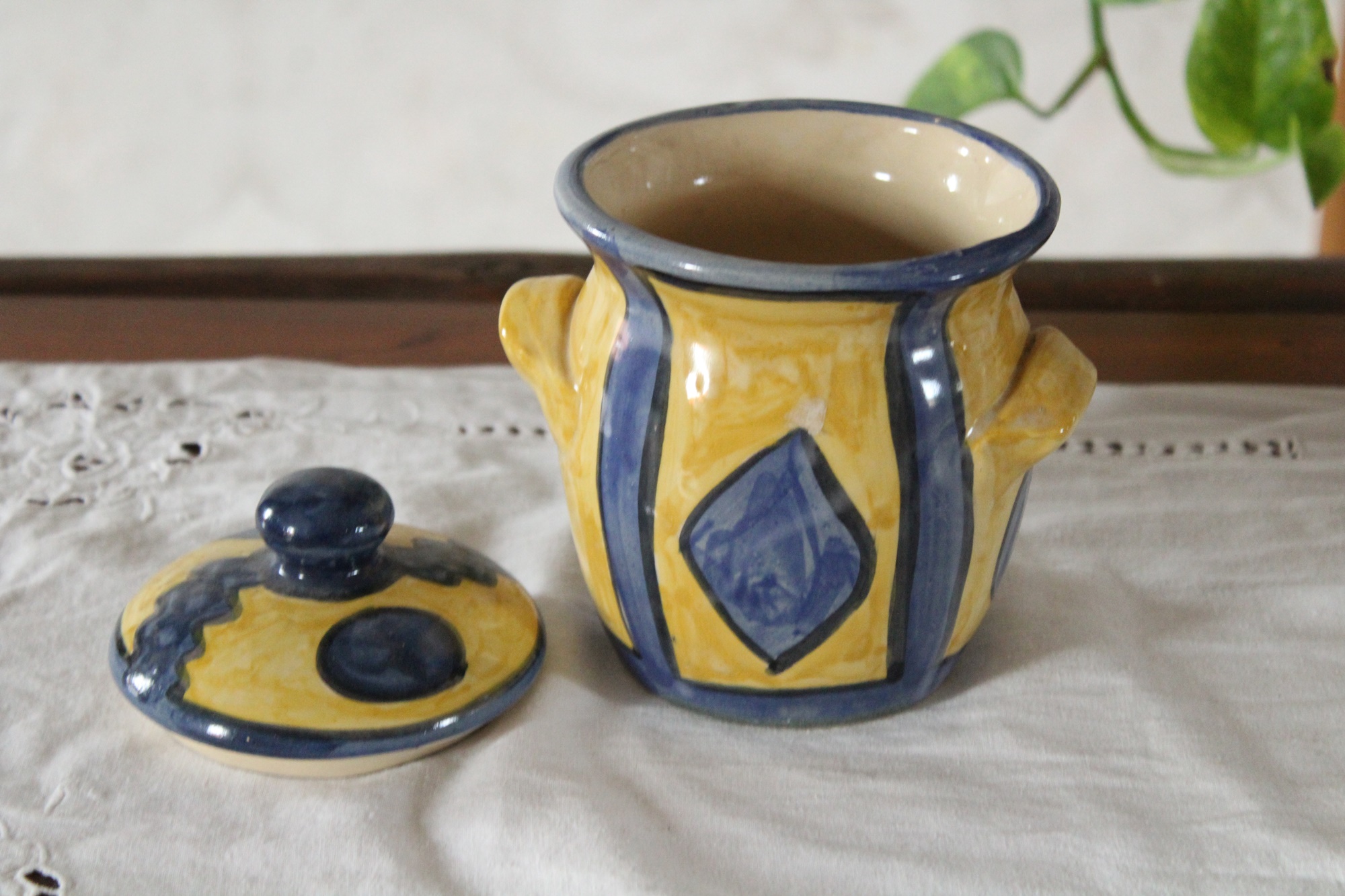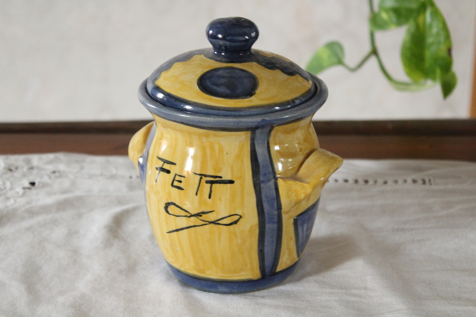 Dieser getöpferte Vorratstopf ist für Fett. Ein Tontopf aus Anne und Siggi´s Töpferei aus der Serie Mexiko. Der Fetttopf ist in den Farben Gelb und Blau von Hand bemalt und anschließend glasiert. Das Muster aus Linien, Kreisen und Zacken erinnert an ein ethnisches Motiv. Vorn hat er einen Schriftzug - Fett. Er darf in die Spülmaschine.