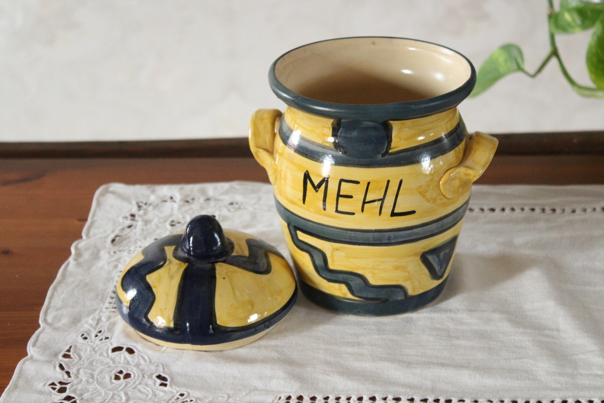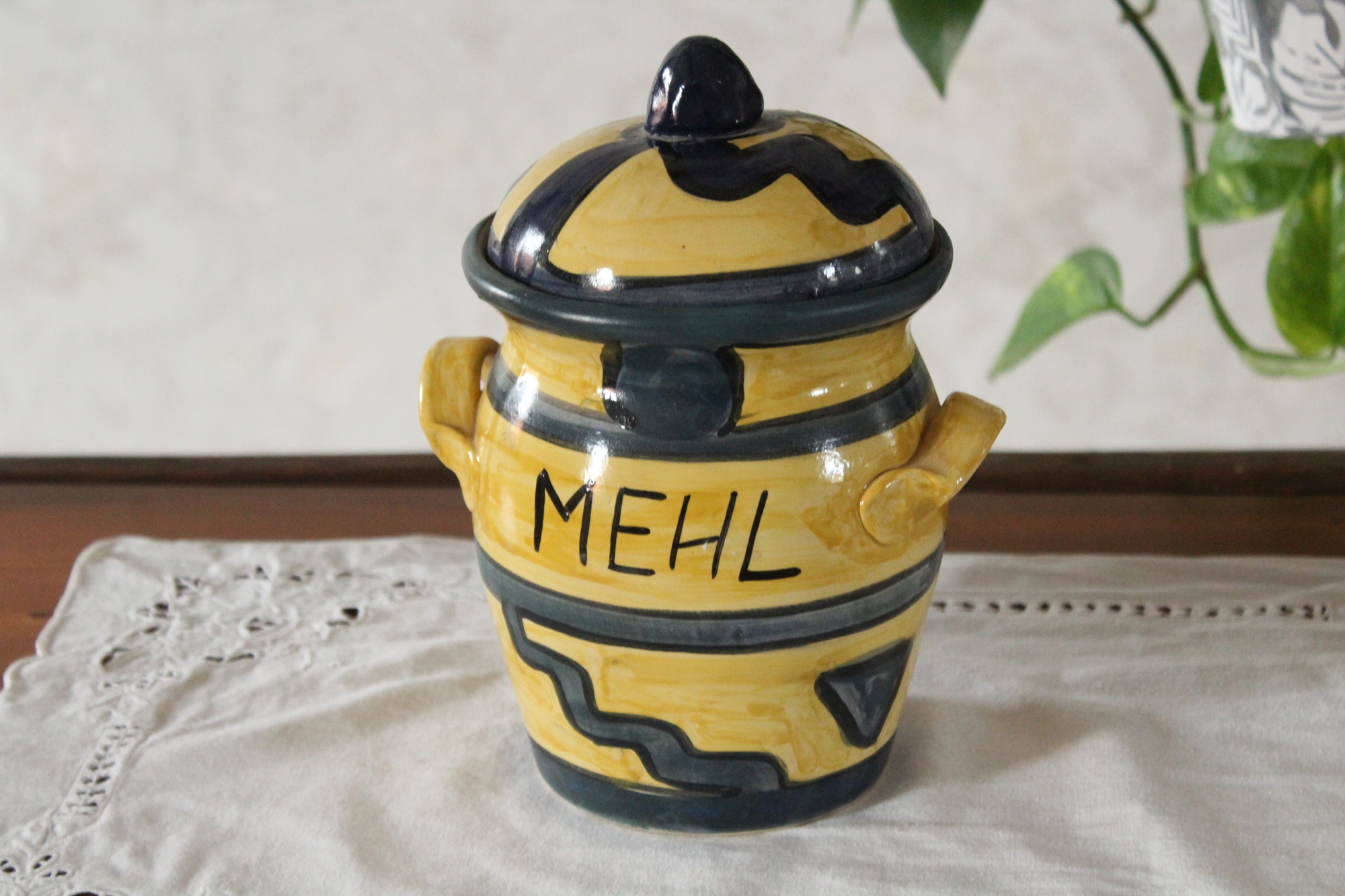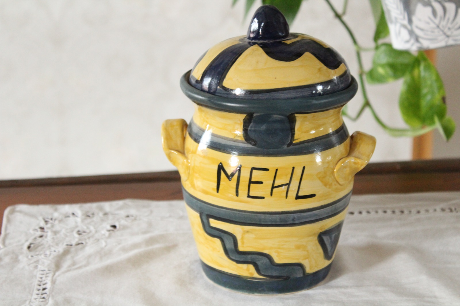 Vorratstopf für Mehl, ein großer Tontopf aus unserer Töpferwerkstatt. Der Mehltopf ist in den Farben Gelb und Blau von Hand mit Engobe bemalt und anschließend glasiert. So darf er auch in die Spülmaschine.Das Muster aus Linien, Kreisen und Zacken erinnert an ein ethnisches Motiv. Vorn hat er eine Aufschrift - Mehl.