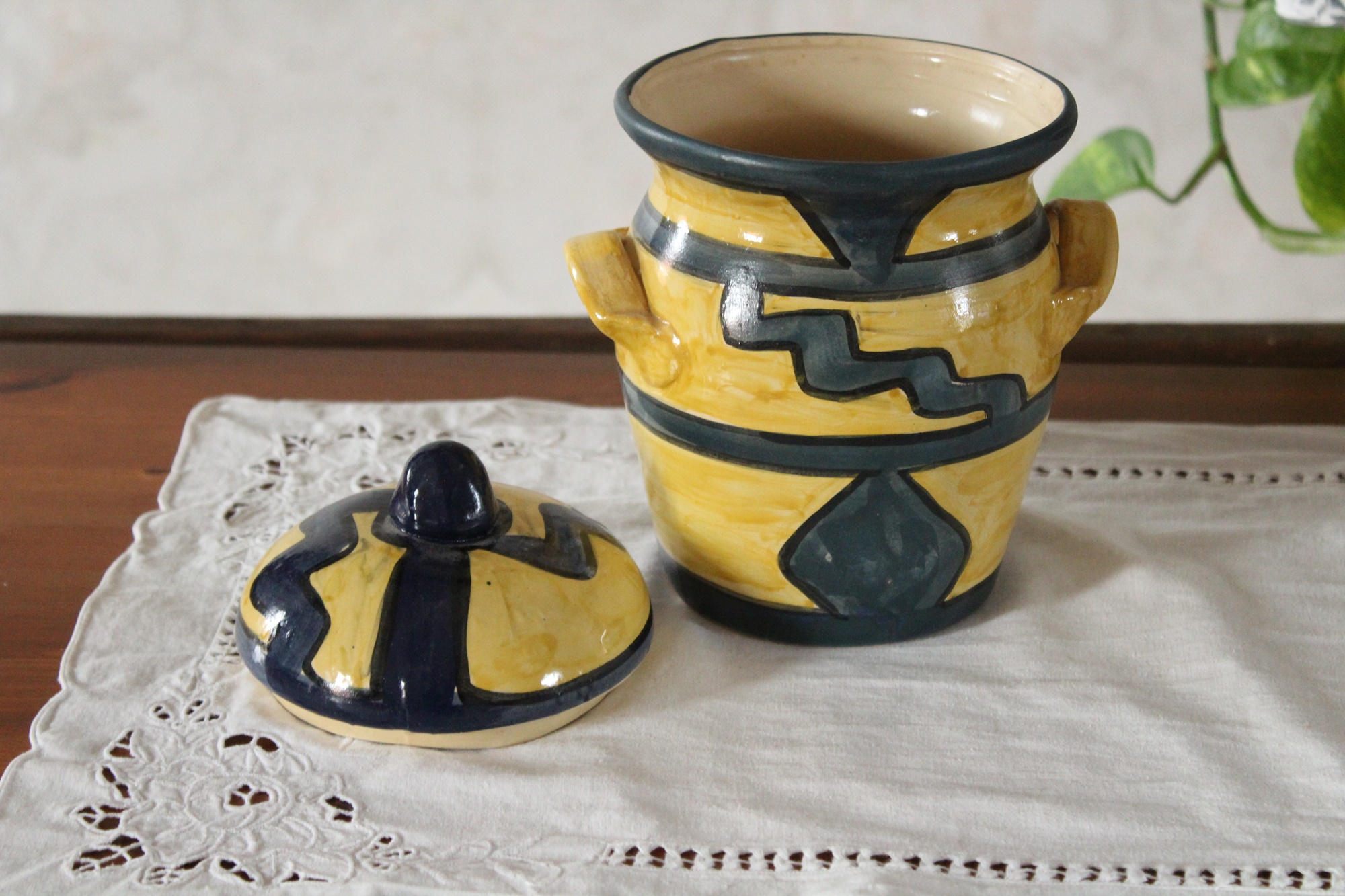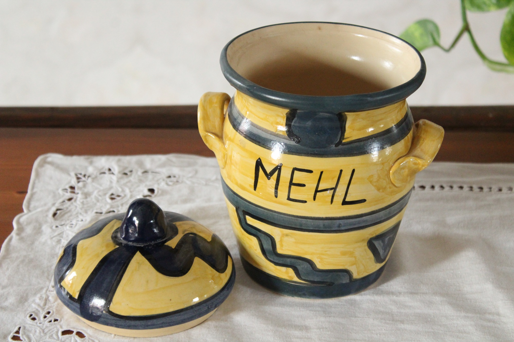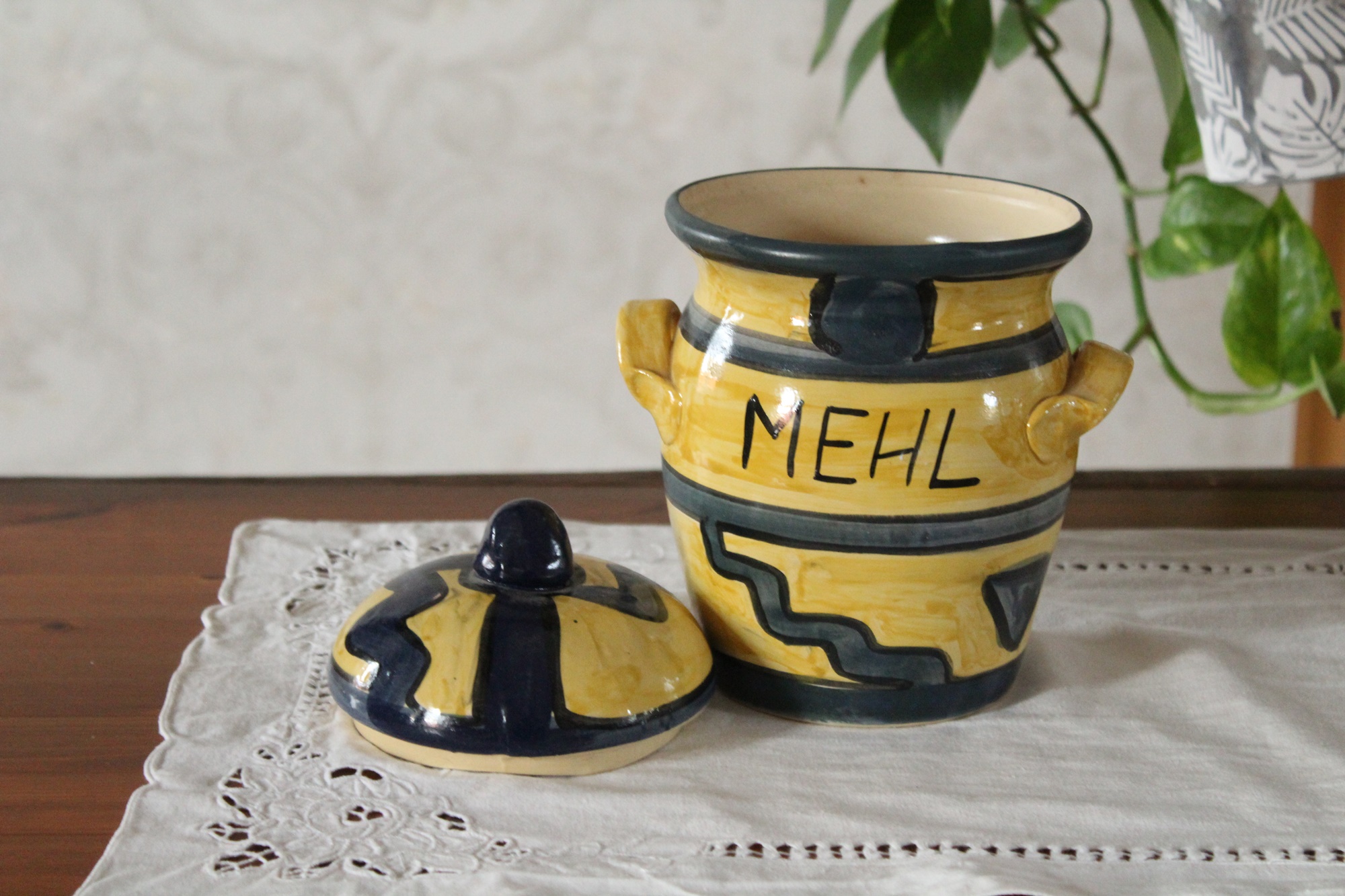 Vorratstopf für Mehl, ein großer Tontopf aus unserer Töpferwerkstatt. Der Mehltopf ist in den Farben Gelb und Blau von Hand mit Engobe bemalt und anschließend glasiert. So darf er auch in die Spülmaschine.Das Muster aus Linien, Kreisen und Zacken erinnert an ein ethnisches Motiv. Vorn hat er eine Aufschrift - Mehl.