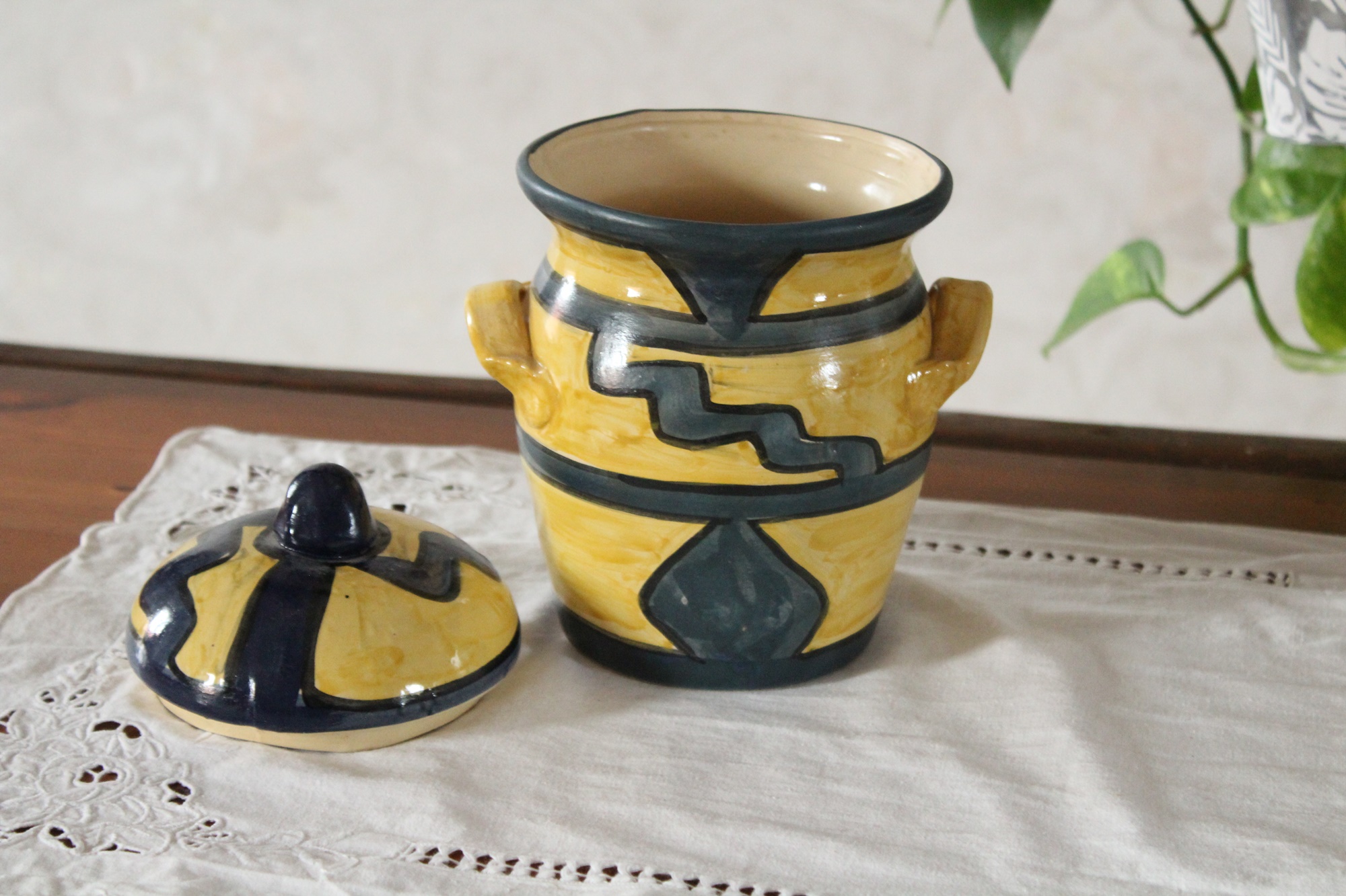 Der Tontopf ist schlank gearbeitet, hat an jeder Seite kleine, angedeutete Henkel und einen Deckel.