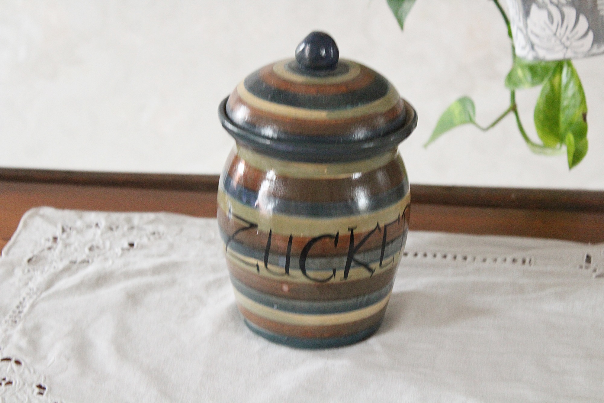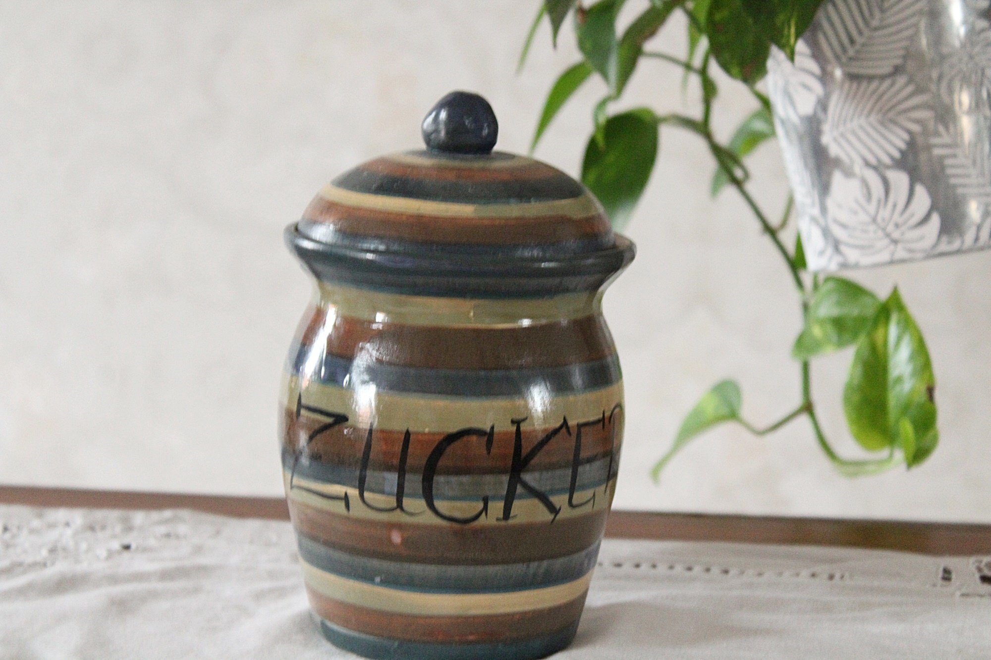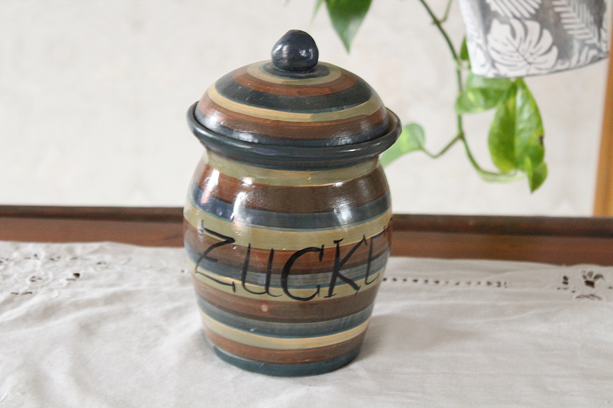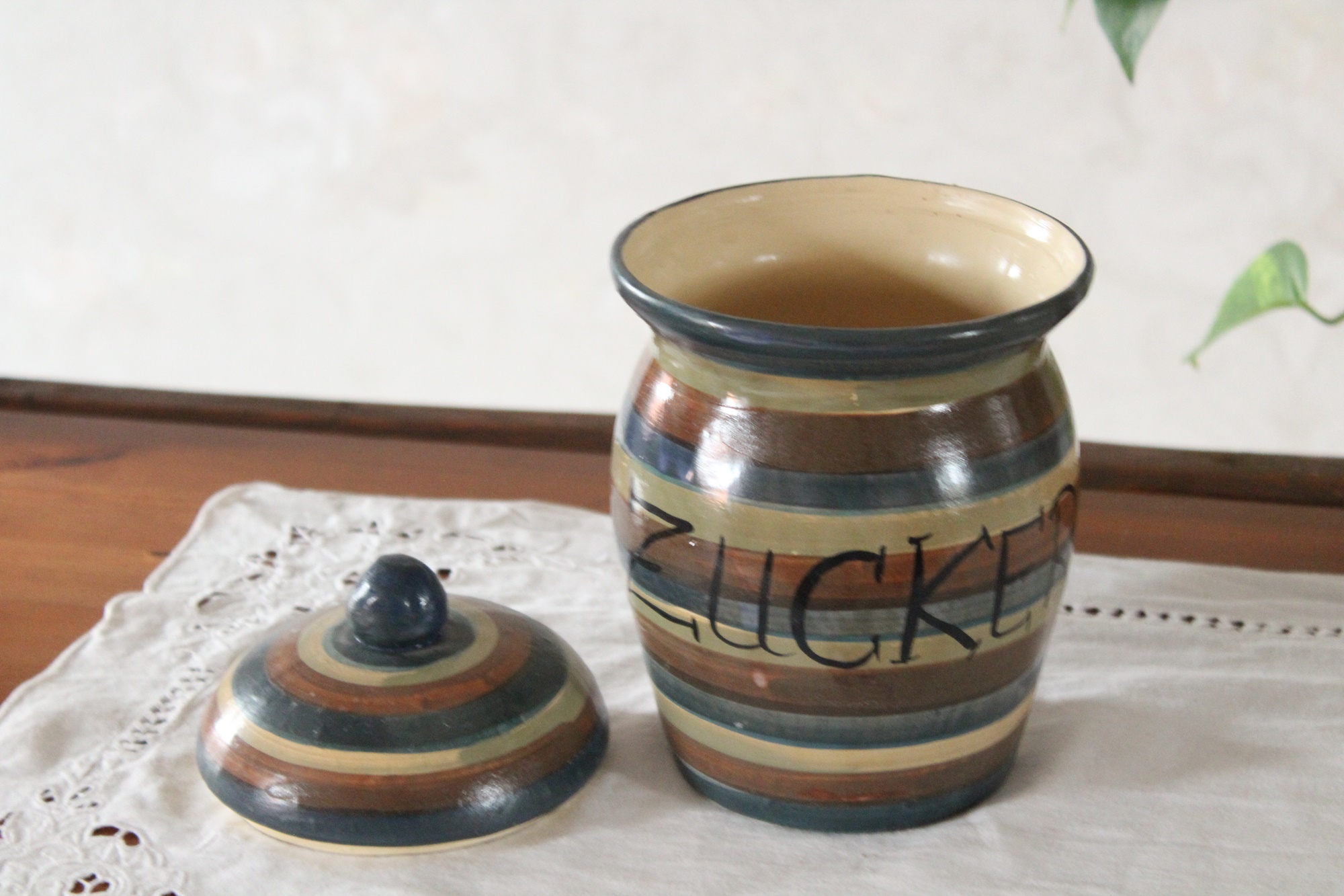 Vorratstopf für Zucker, ein großer Tontopf Ringel aus unserer Töpferwerkstatt. Der Vorratstopf ist ca 22 cm hoch (mit Deckel ohne Deckel sind es ca 18 cm). Der Tontopf ist schlank gearbeitet, hat an jeder Seite kleine, angedeutete Henkel und einen Deckel. Vorn hat er eine Aufschrift - Zucker.